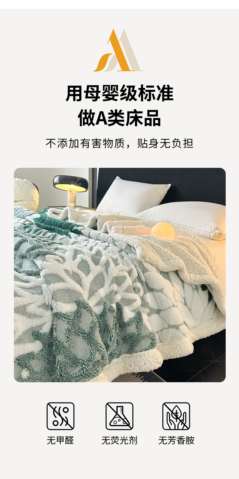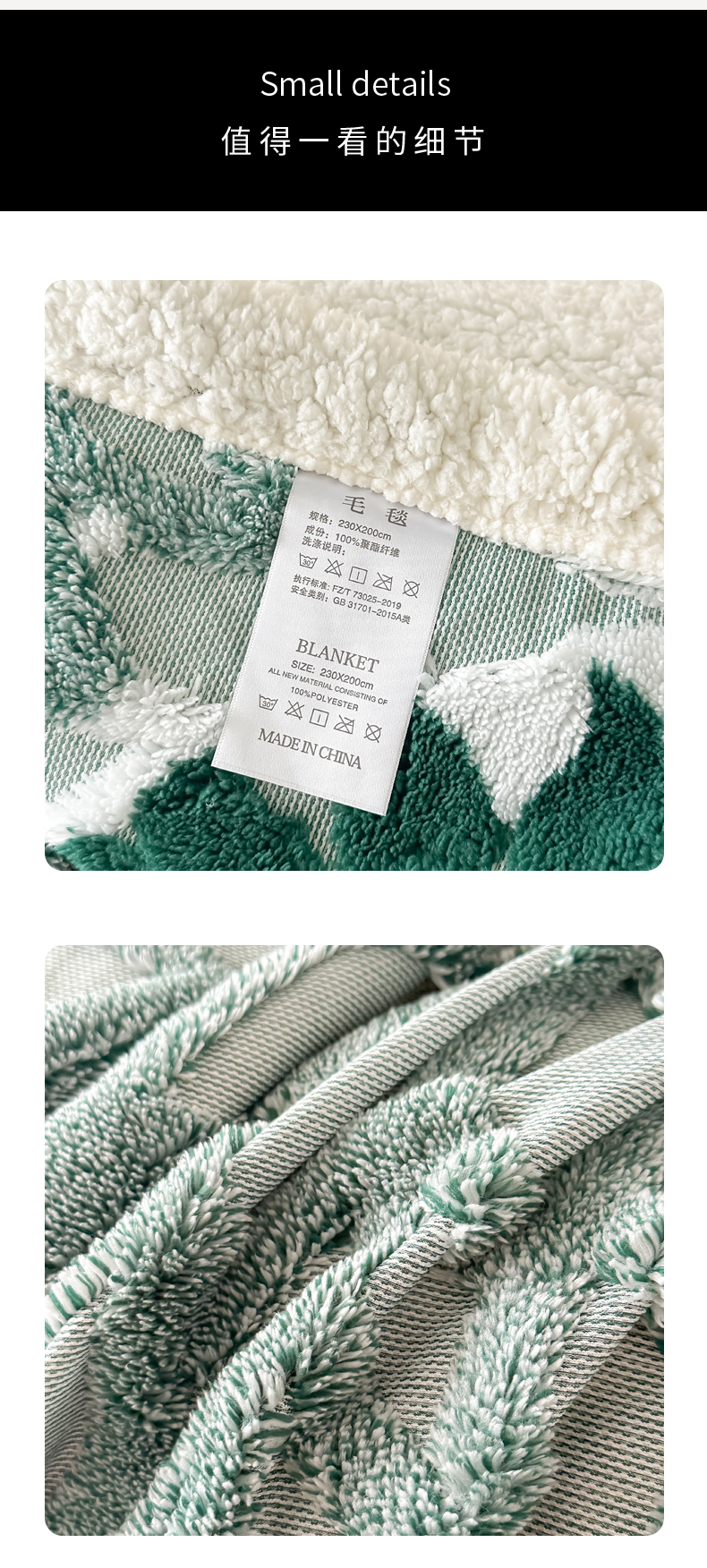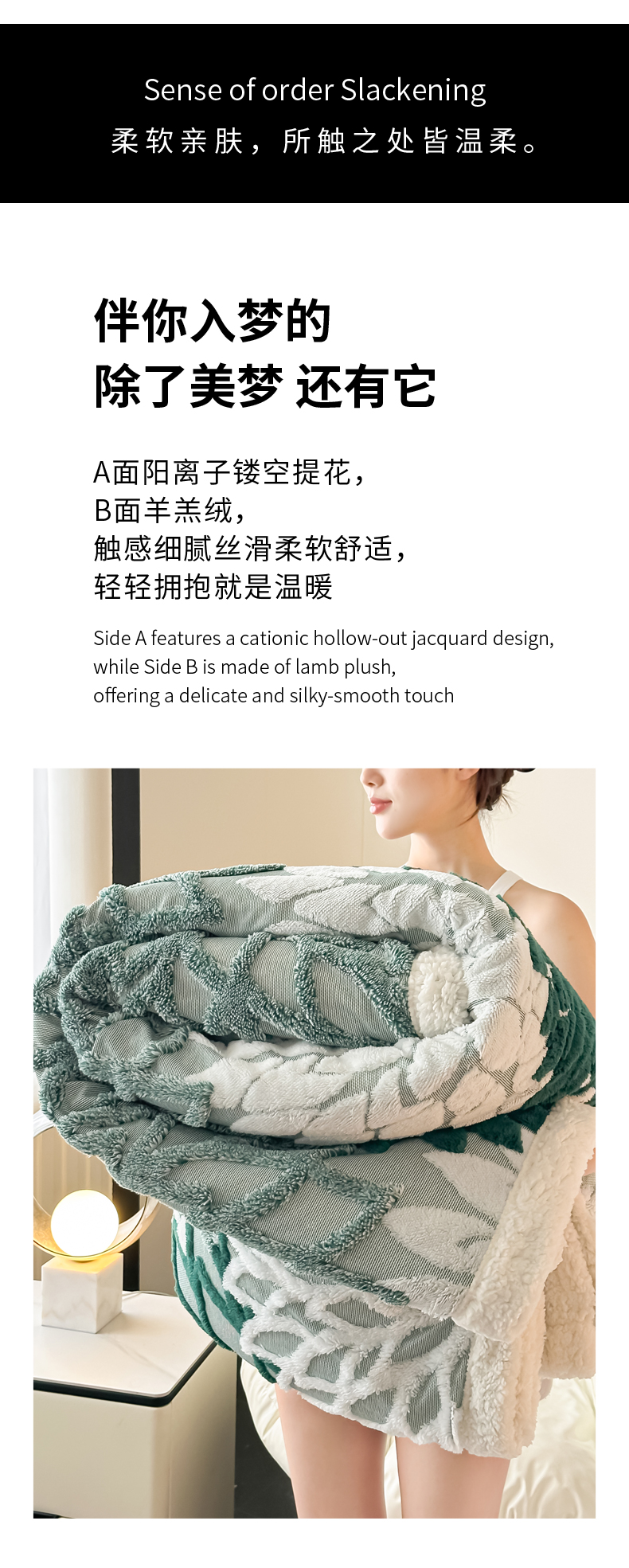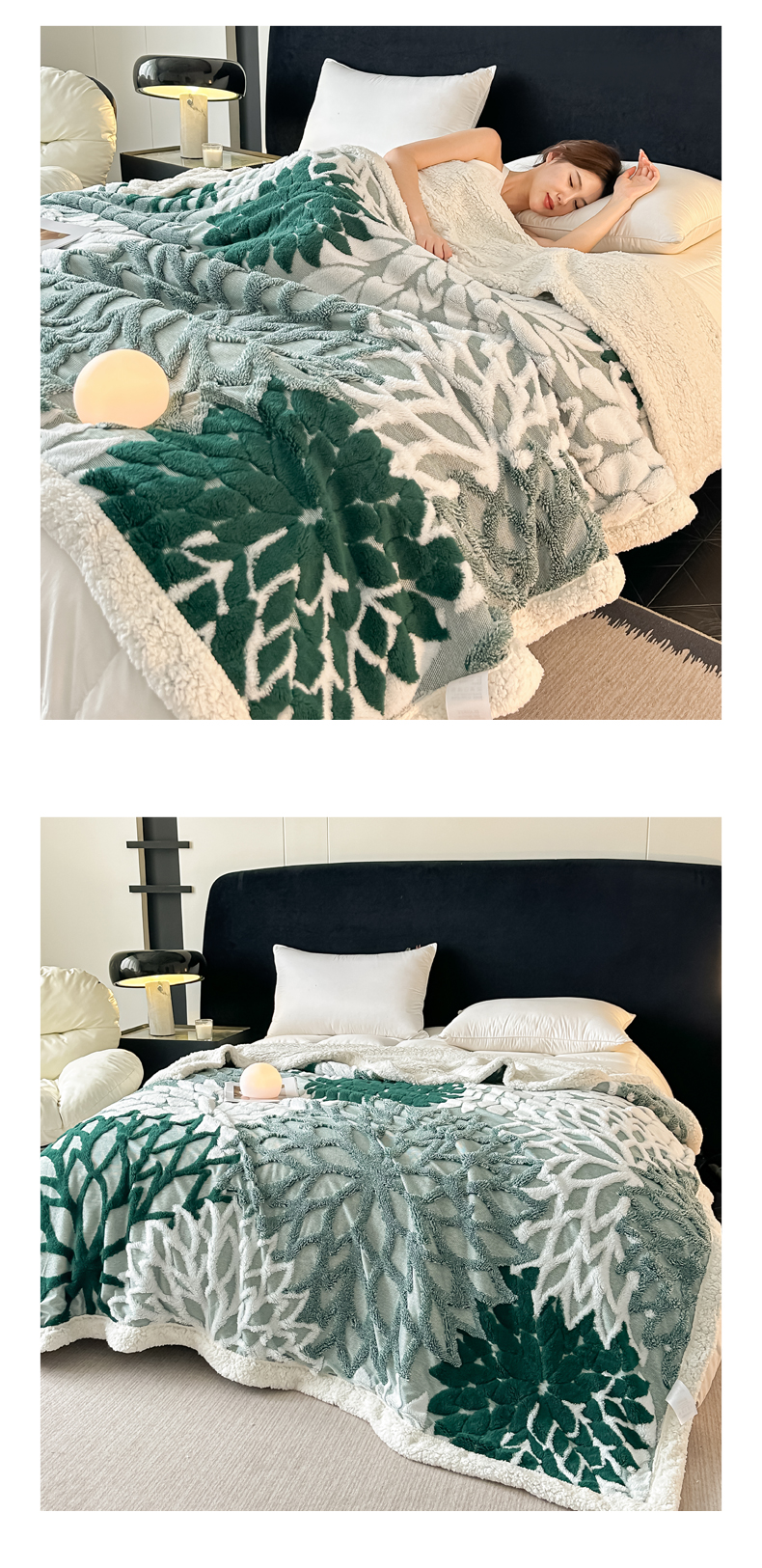 商品名称:丹本家纺 2025新款阳离子提花镂空色织多功能盖毯塔芙绒羊羔绒毛毯毯子 绽放-墨绿