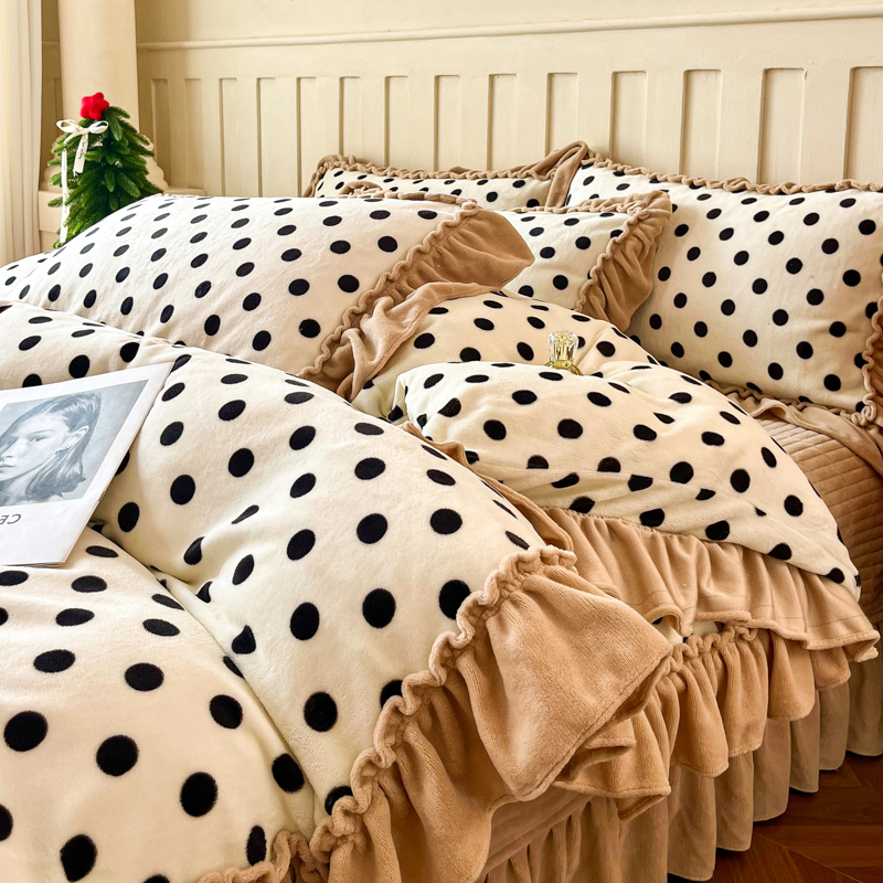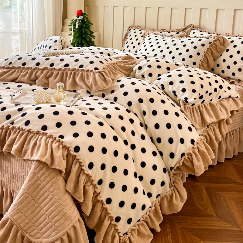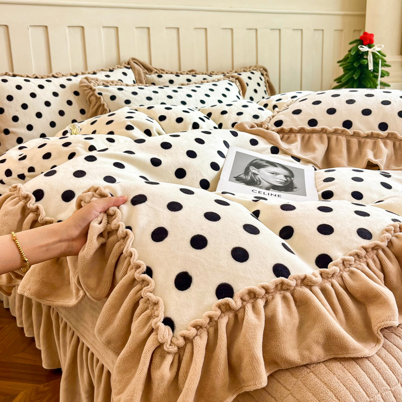 梦可莱家居 2025冬季新款复古风印花牛奶绒大花边床盖四件套 复古米圆点