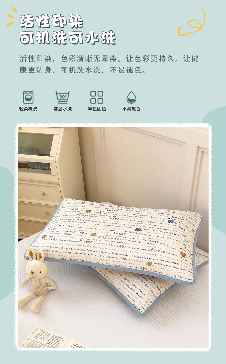 • 91家纺网 家纺一手货源 找家纺 拾小柒 2025年新款全棉双层纱枕套夹棉隔脏污防口水头油枕头套 英文象蓝