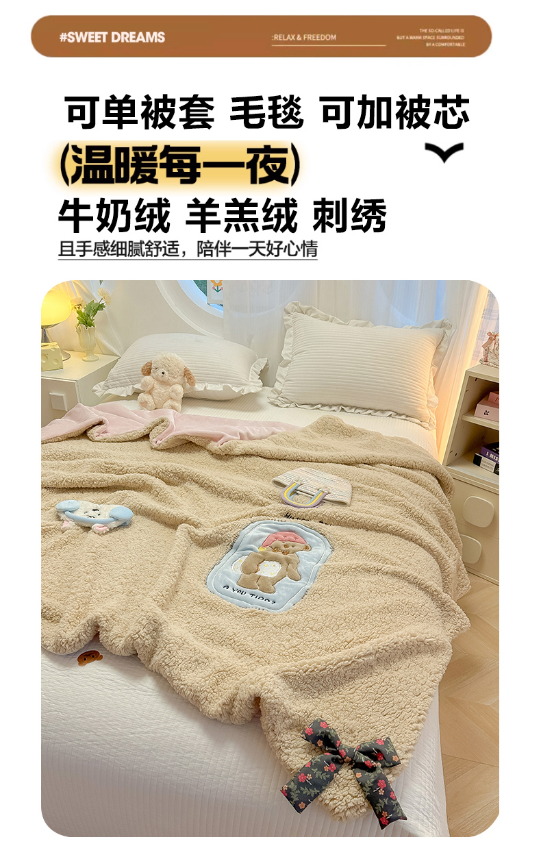 子钦家纺 2025新款羊羔绒牛奶绒卡通贴布绣多功能盖毯单被套(第二波) 晚安熊-咖
