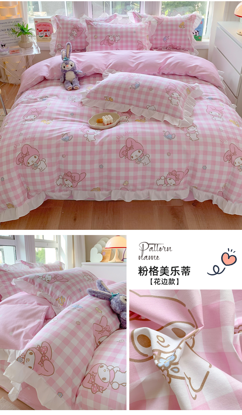 当前位置: 91家纺网 > 商品网购 > 床品套件 > 四件套 > 全棉普通四件套 > 玉元坊2025新款三丽鸥系列 全棉床单纯棉床裙三四件套 粉格美乐蒂【花边款】