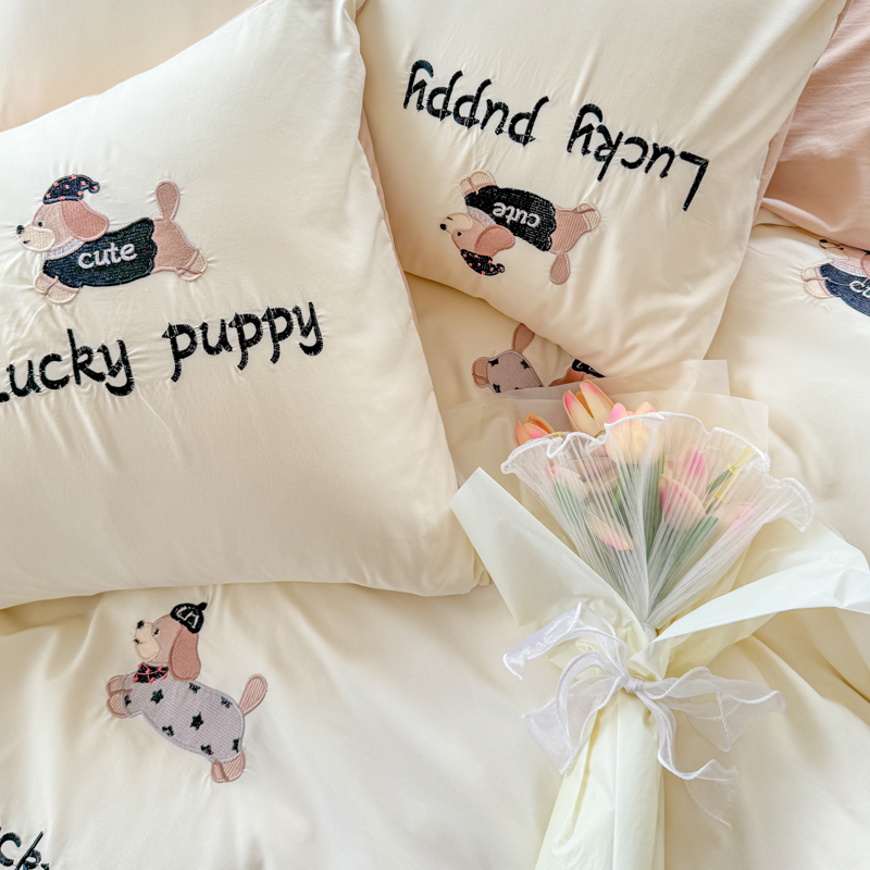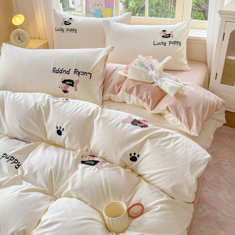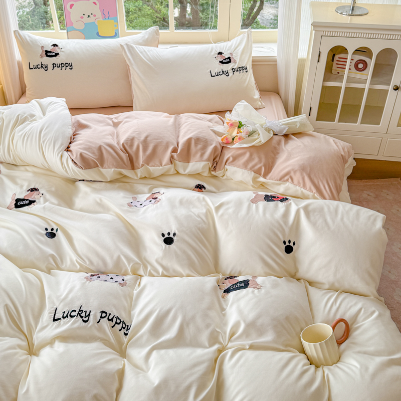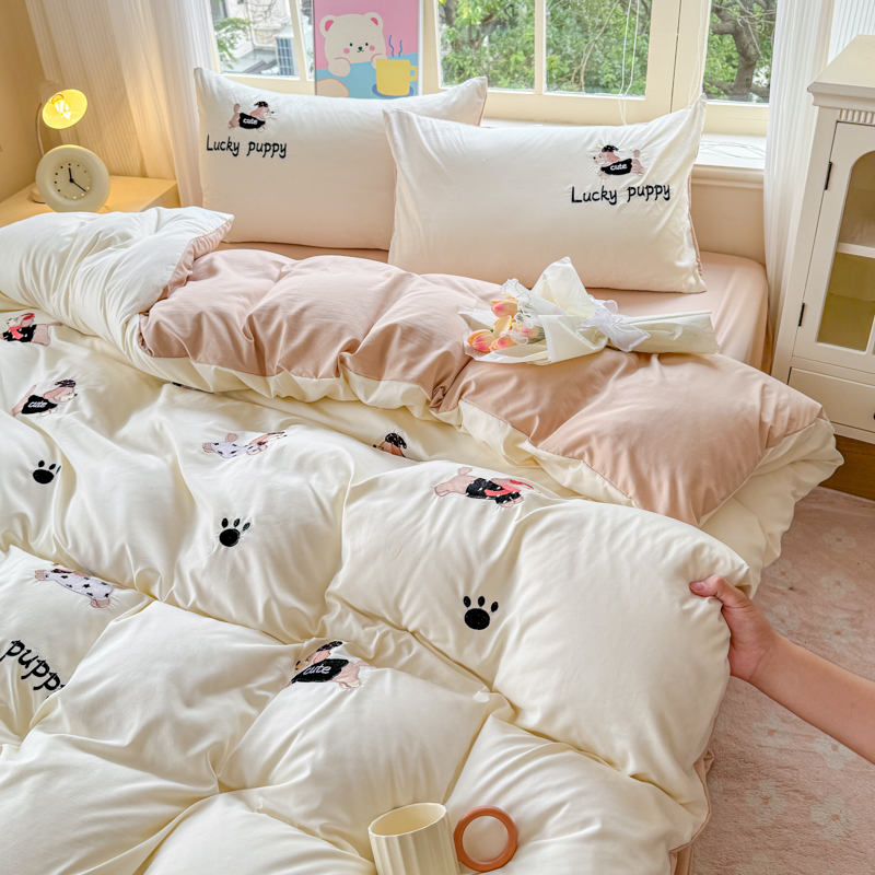 商品名称:云木里 2025新款兔绒卡通刺绣手工四件套 兔绒 腊肠狗-杏