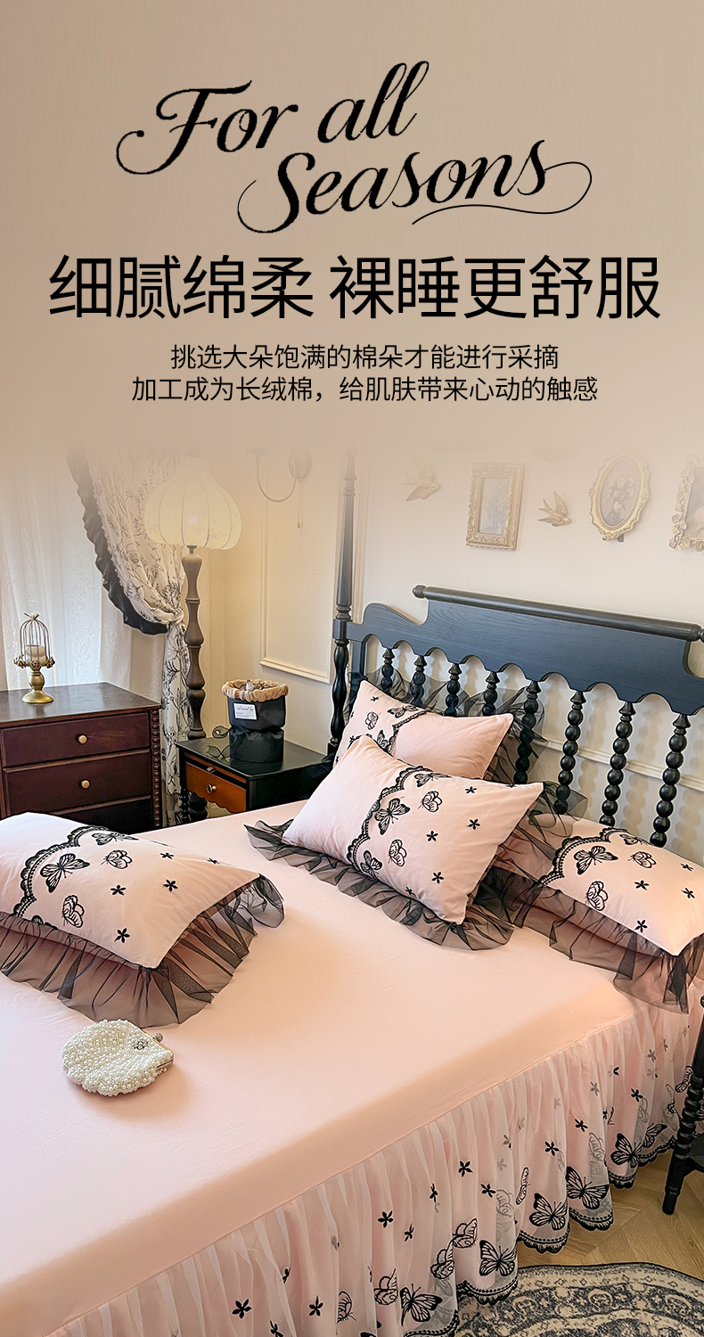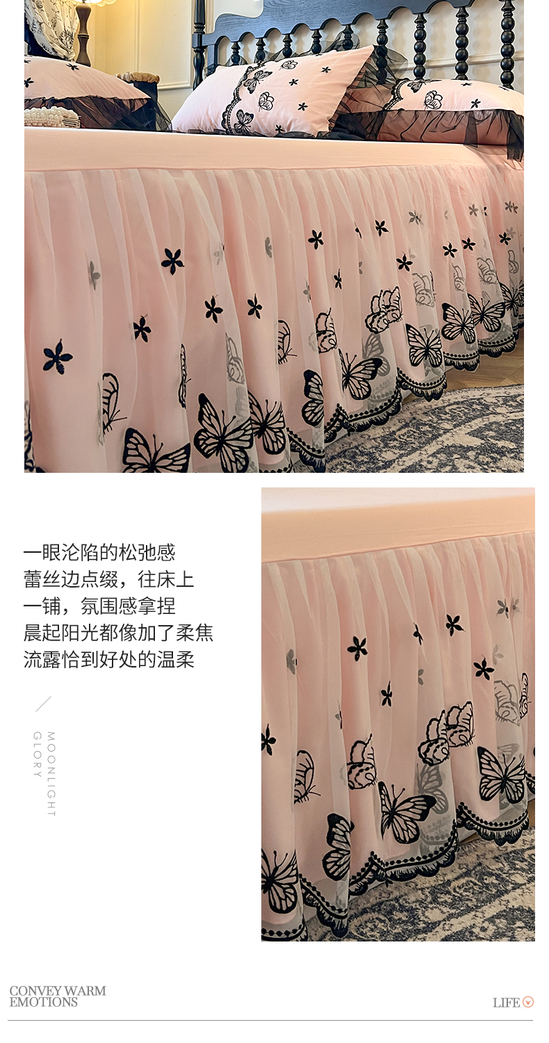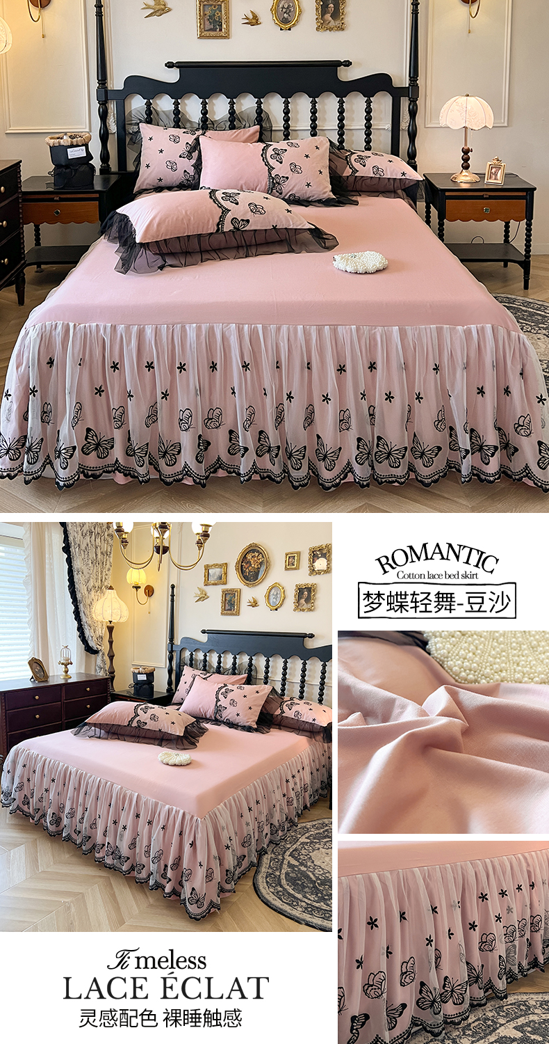 商品名称:网红馆(ck家纺) 2025新款全棉纯棉蕾丝边单床裙 床裙单件-梦蝶轻舞 梦蝶轻舞-粉