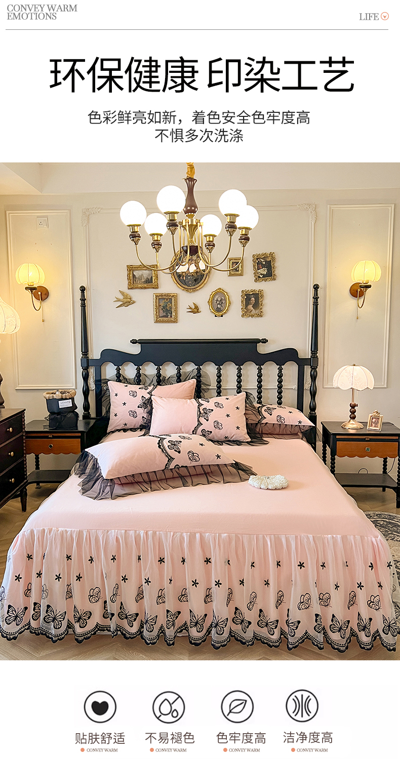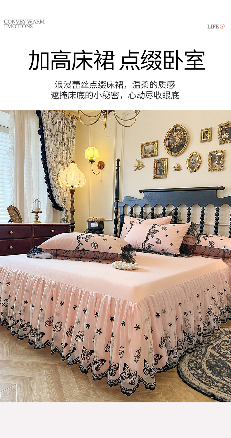 网红馆(ck家纺) 2025新款全棉纯棉蕾丝边单床裙 床裙单件-梦蝶轻舞 梦蝶轻舞-粉