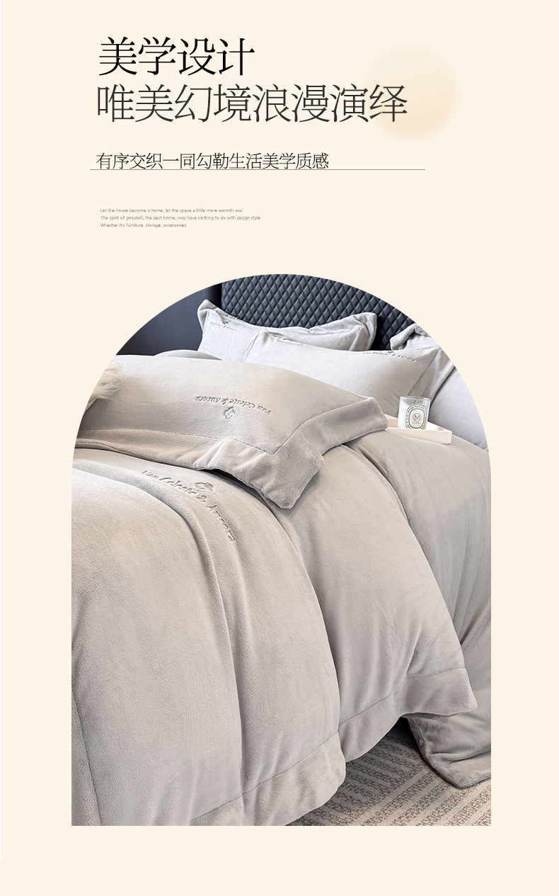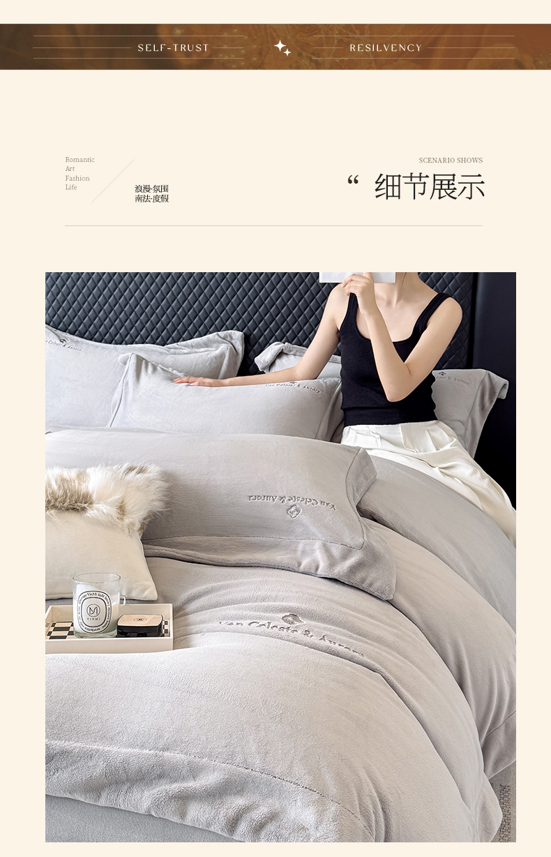 商品名称:名品优仓 2025新款240克奶肤绒刺绣四件套-梵克雅宝 梵克雅宝-高级灰