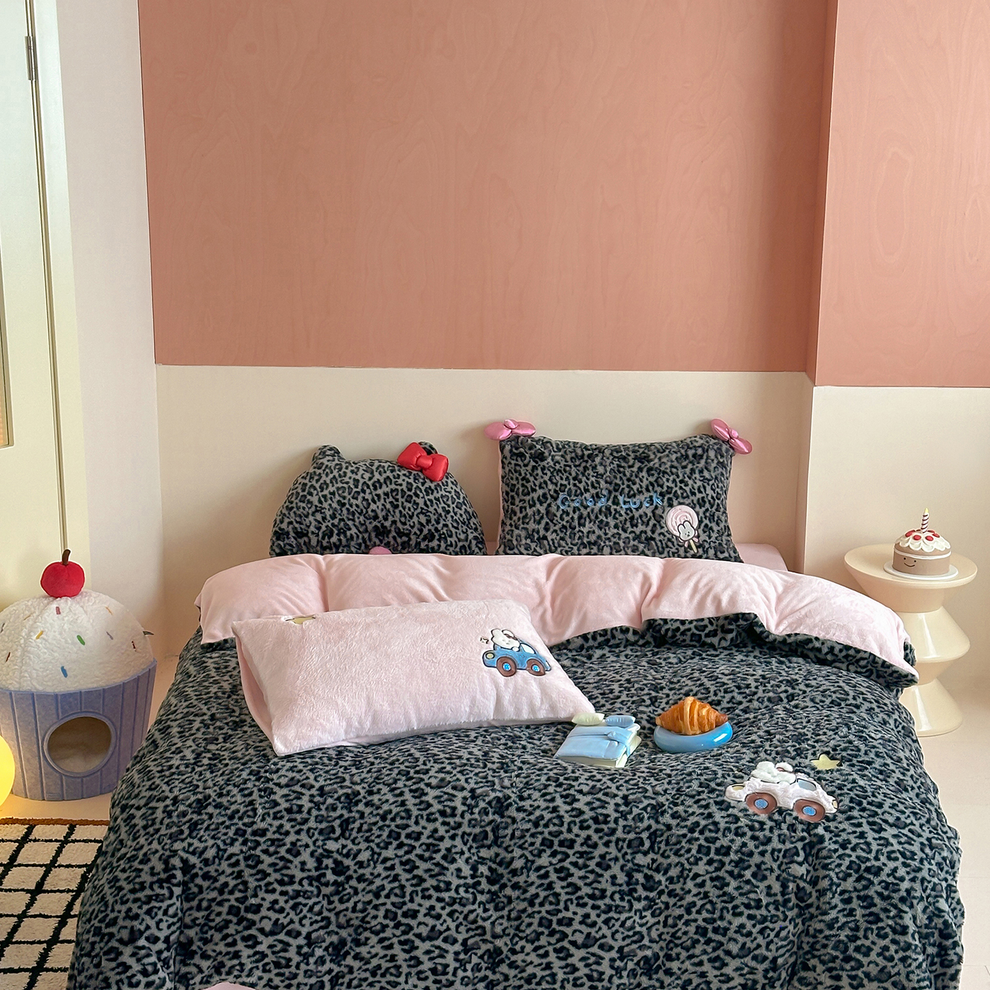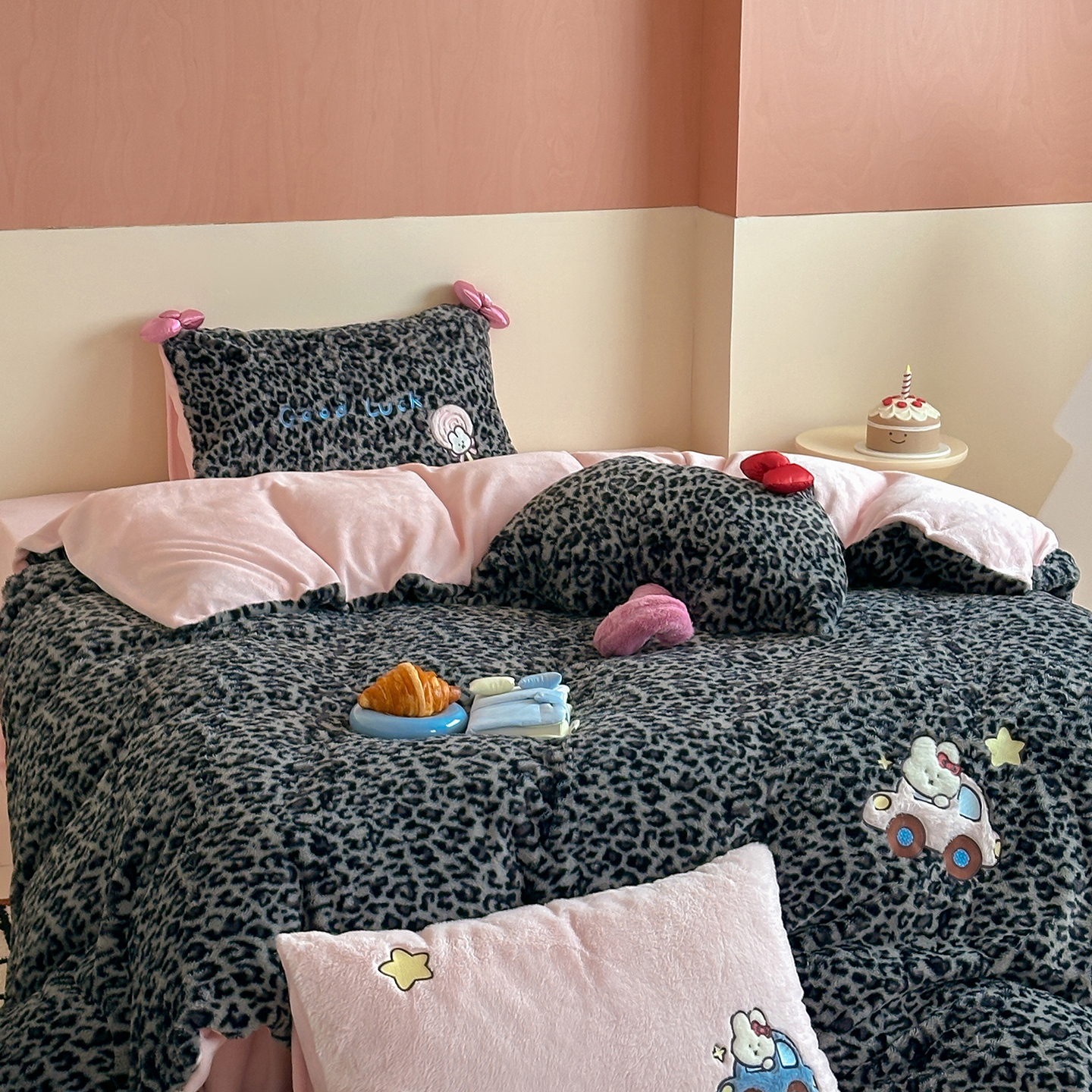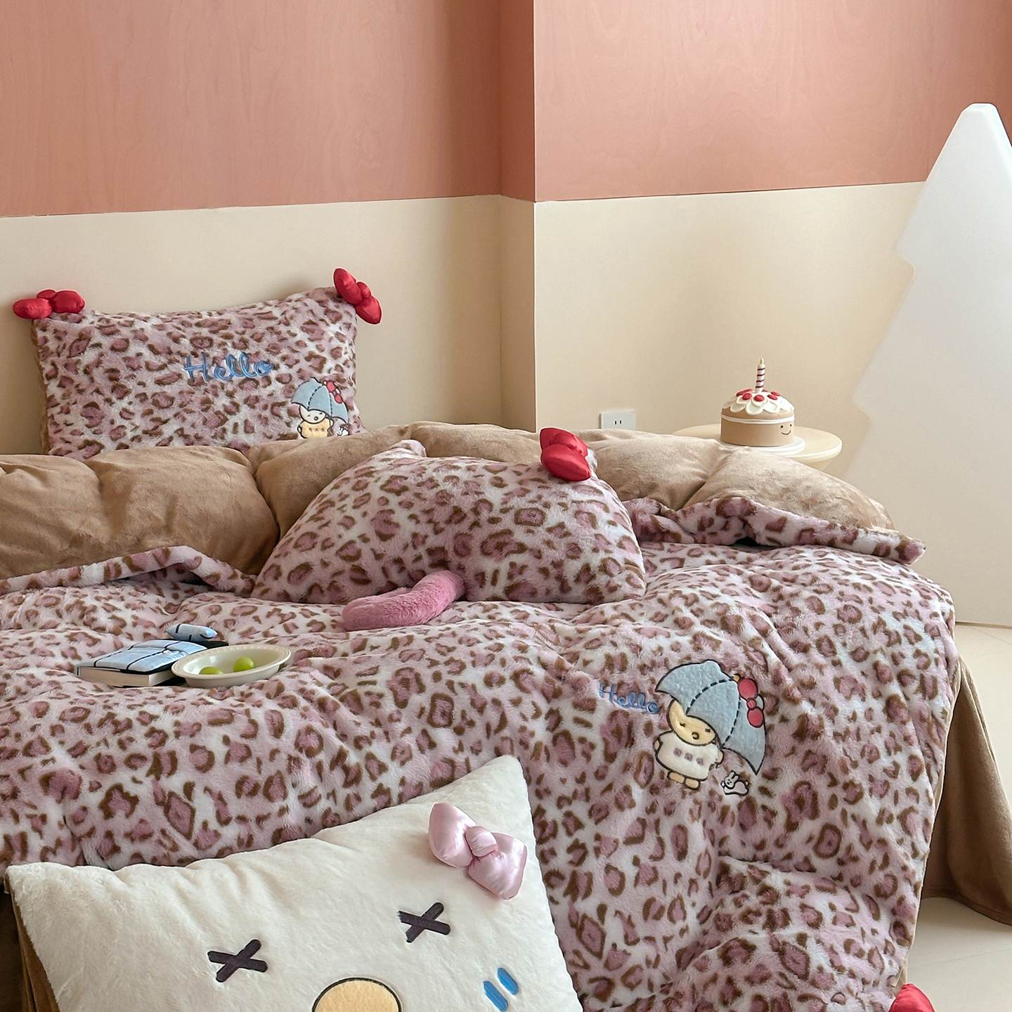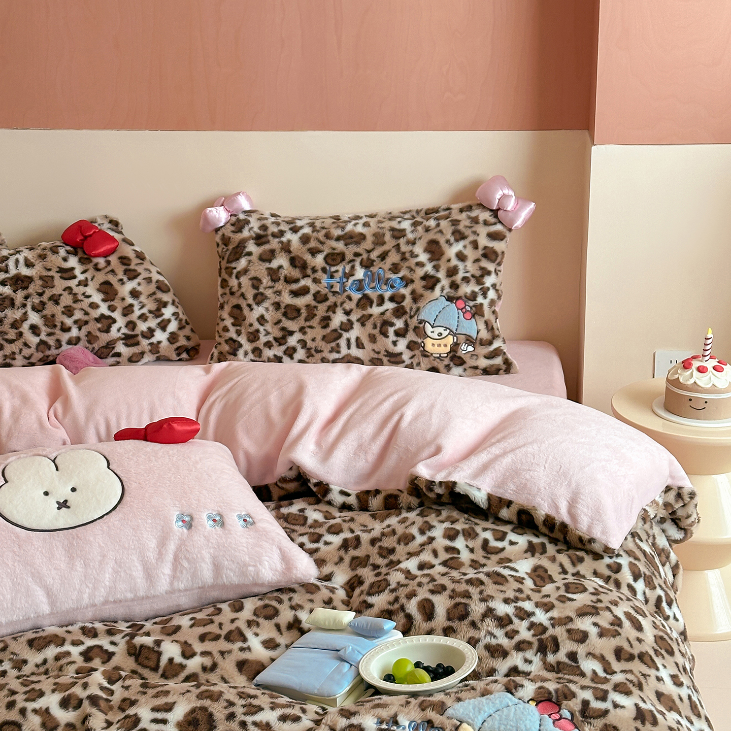 商品名称:桔子家纺 2025新款兔兔绒牛奶绒豹纹系列卡通绣花四件套 兔兔粉bao