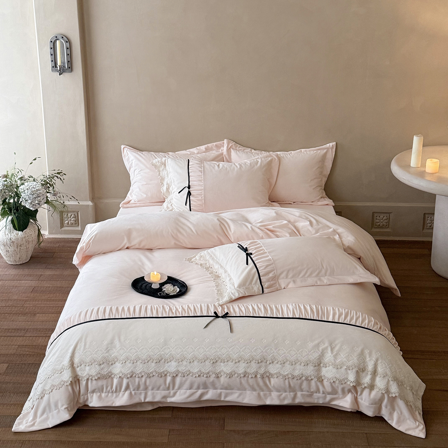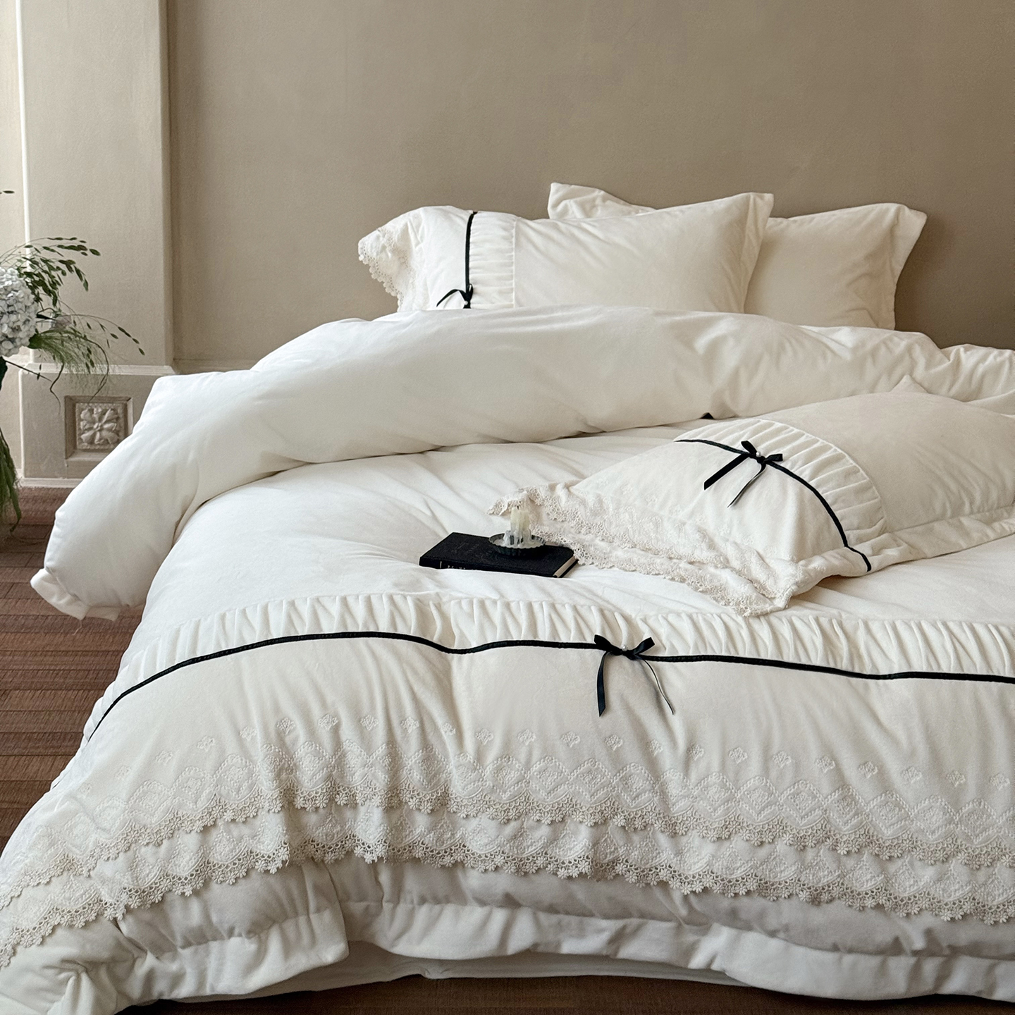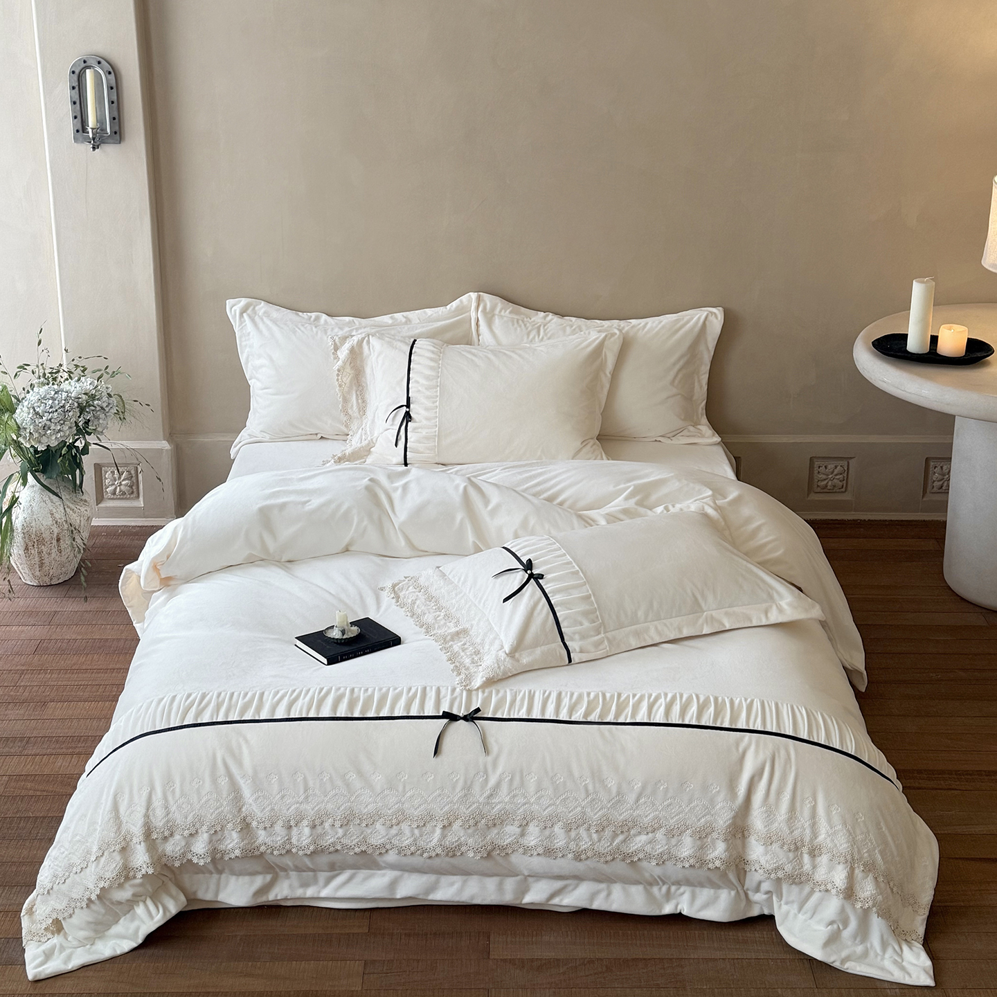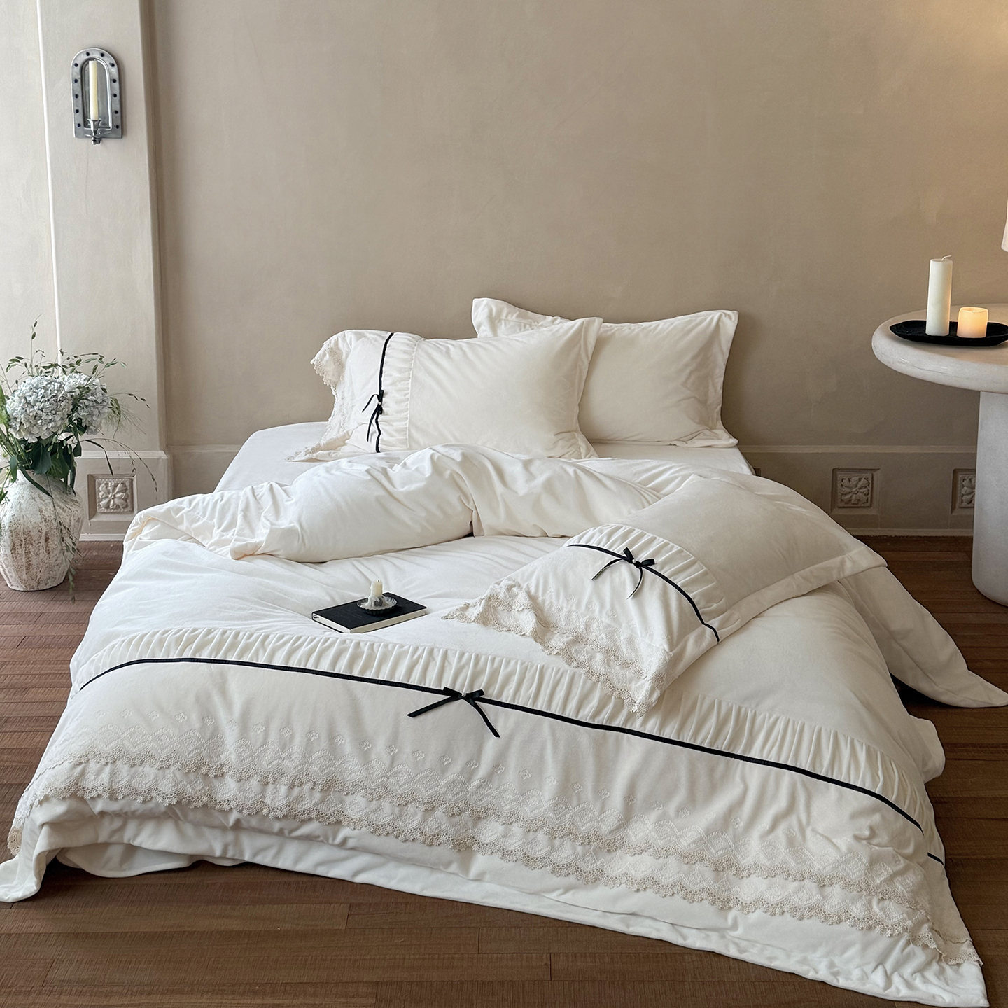 (总)佳汐蓝 2025春夏新品双层皱皱纱刺绣+织带+荷叶边四件套--白茶花,奶白,曲奇