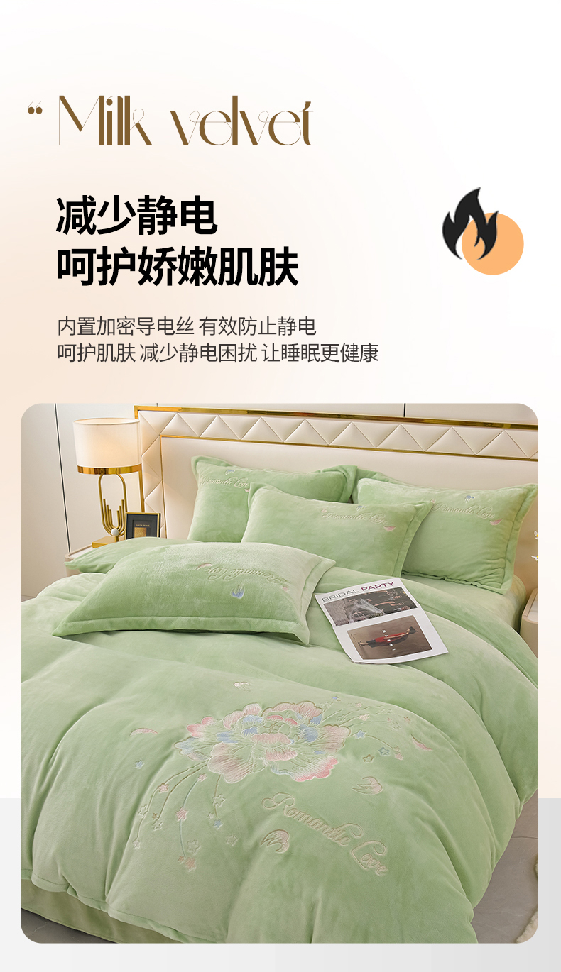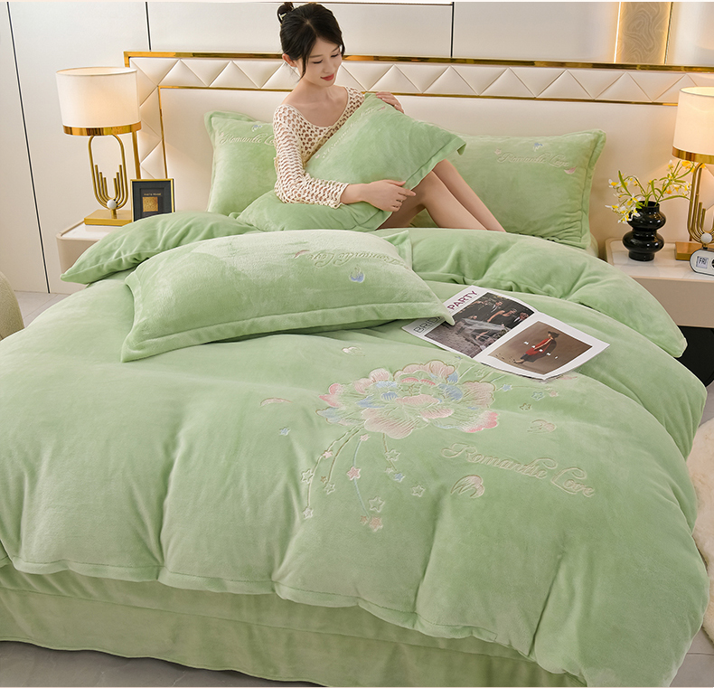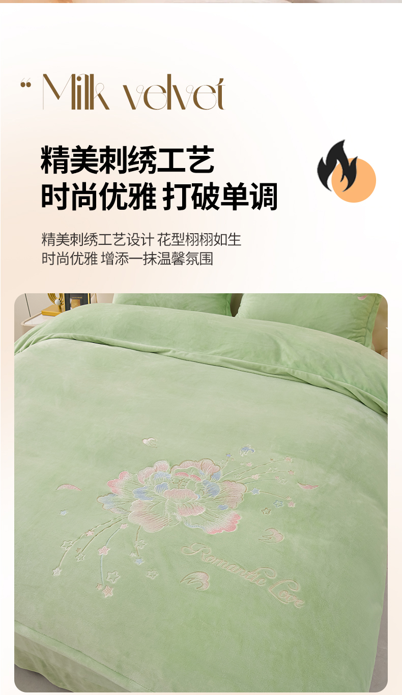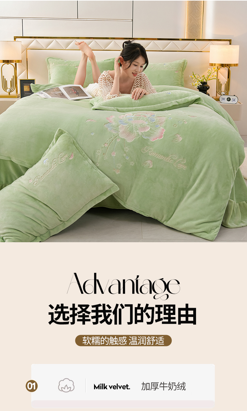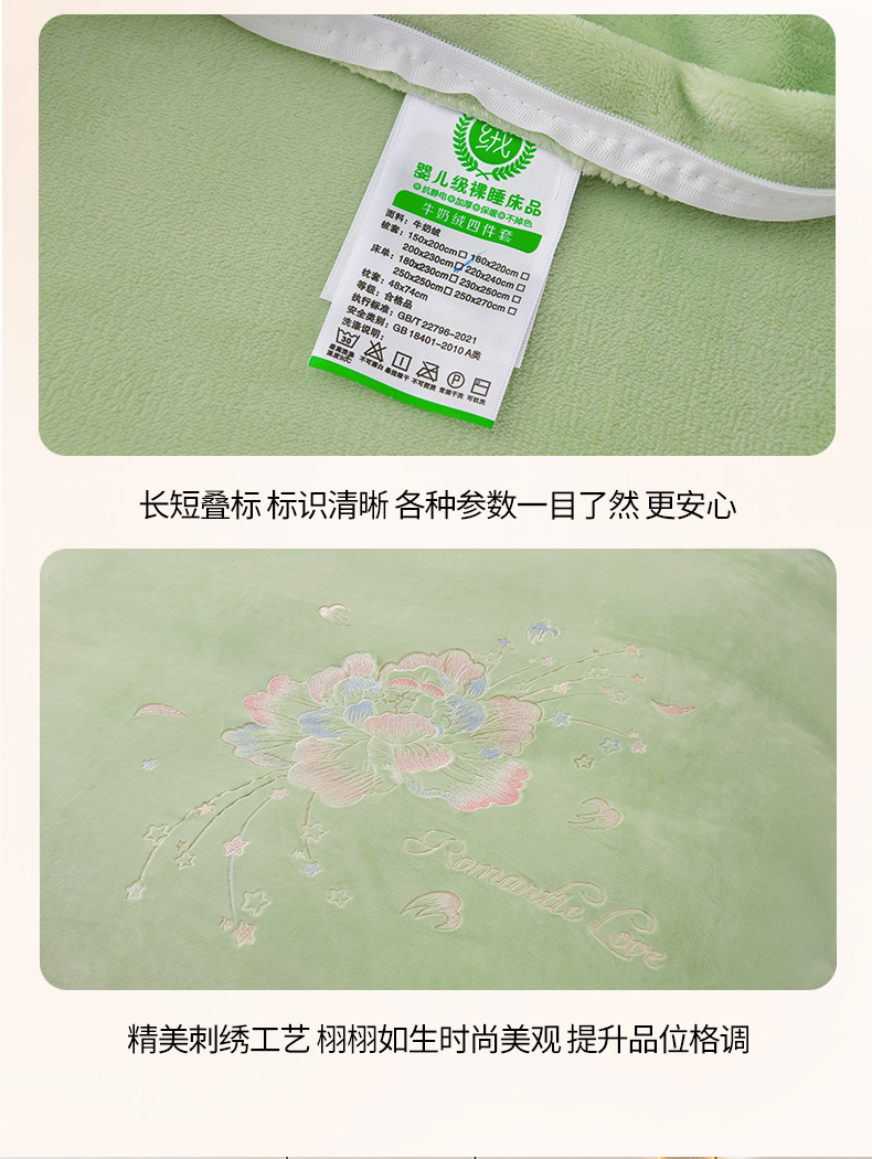 商品名称:绒小宣 2025新款加厚牛奶绒刺绣花保暖四件套-花开富贵提供买家秀 花开富贵-抹茶绿
