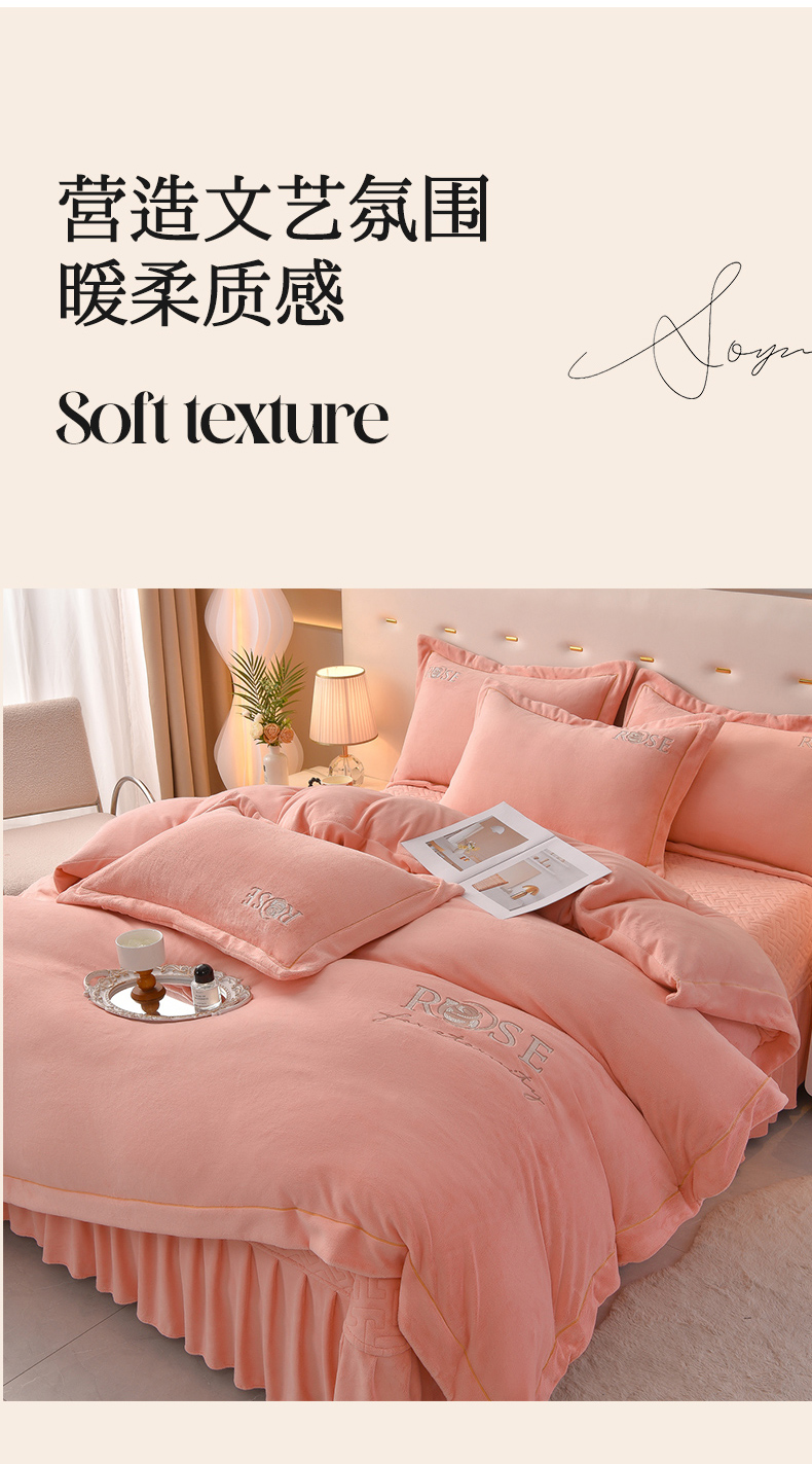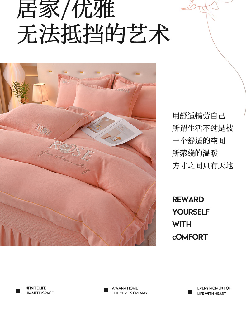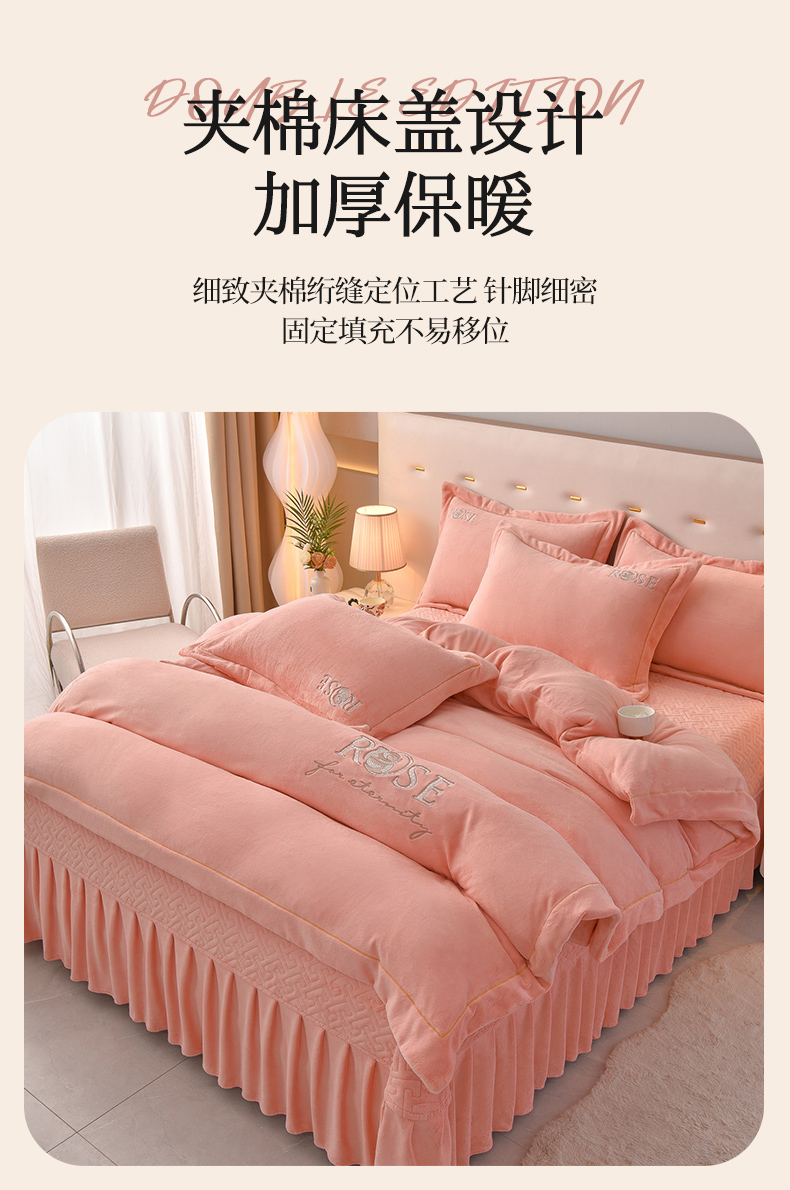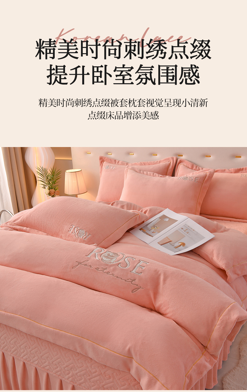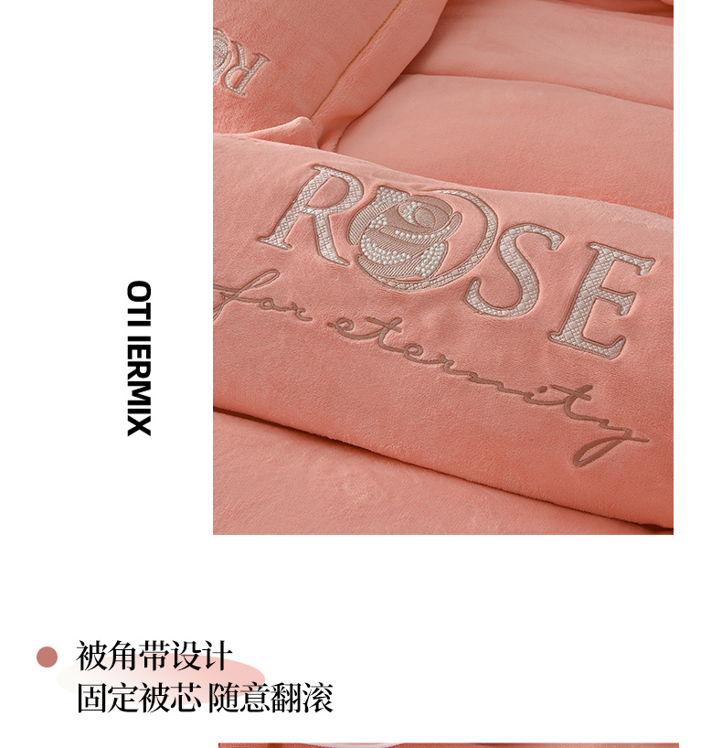 商品名称:绒小宣 2025新款加厚牛奶绒四件套宽边一字绣牛奶绒刺绣花夹棉床盖款四件套-玫瑰花语 玫瑰花语-粉色