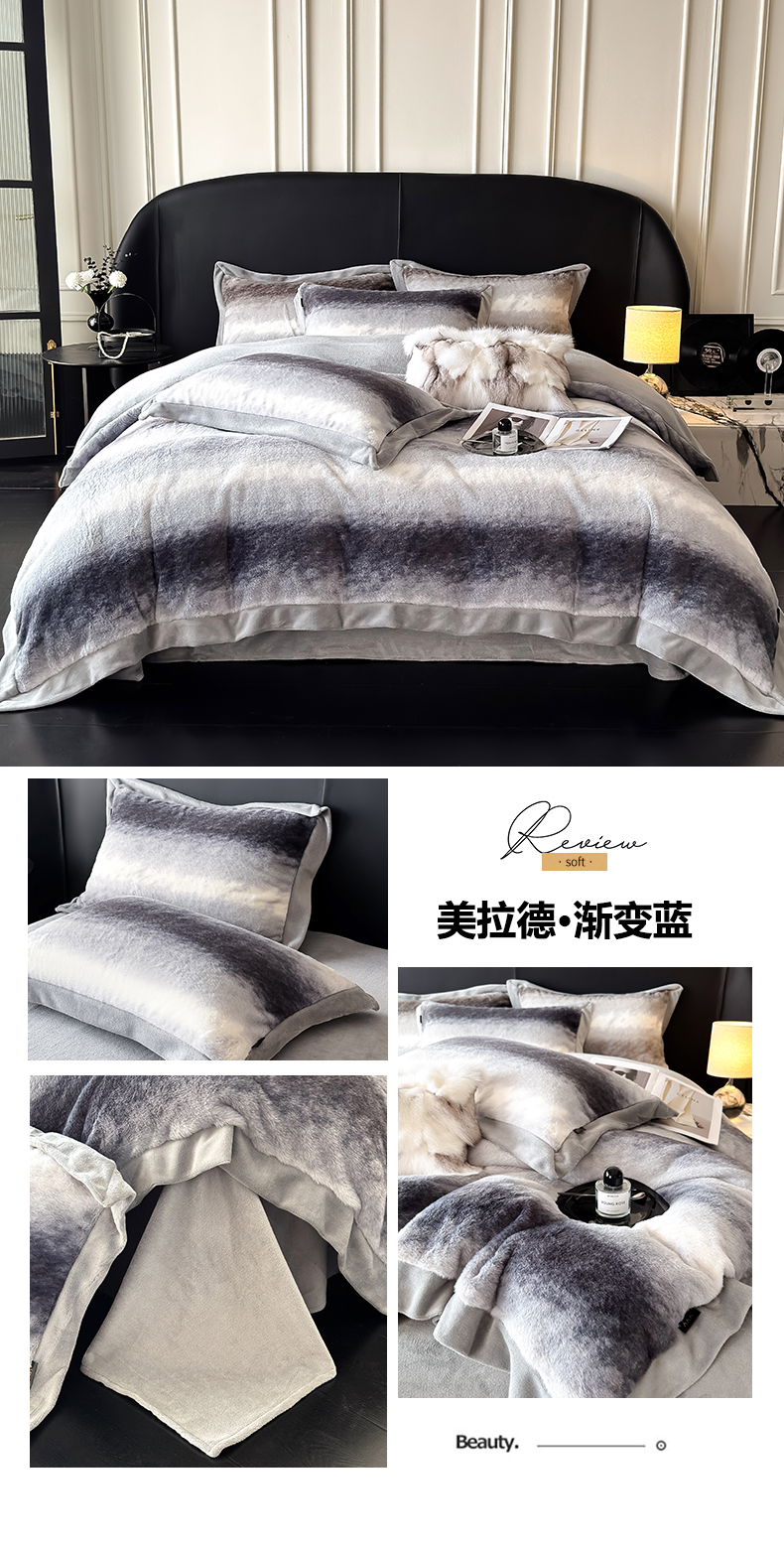 商品名称:水云缦 2025新款美拉德系列兔毛拼角四件套系列 美拉德-渐变蓝