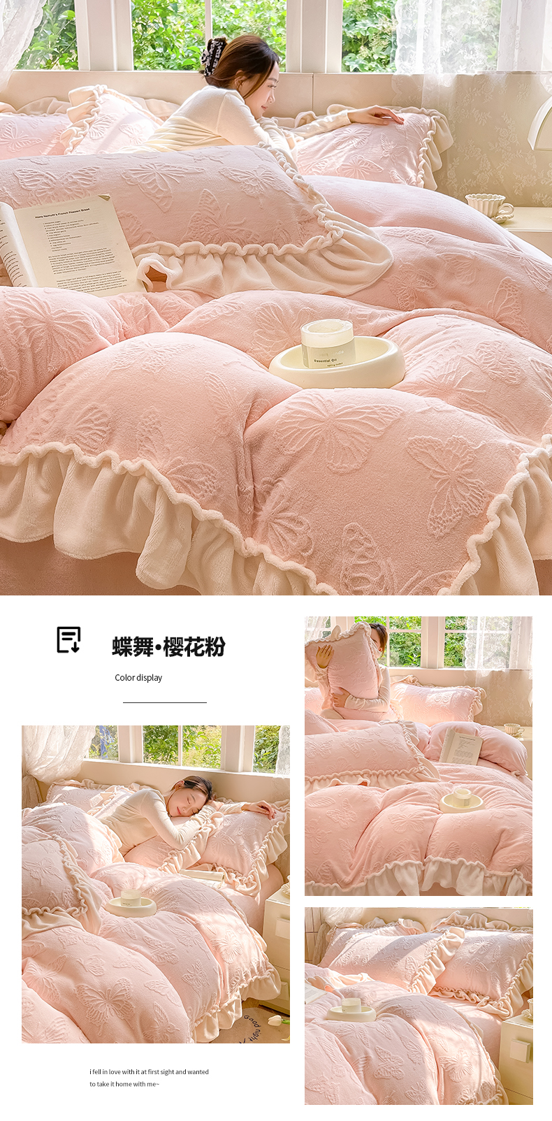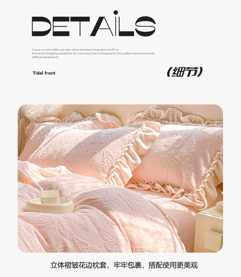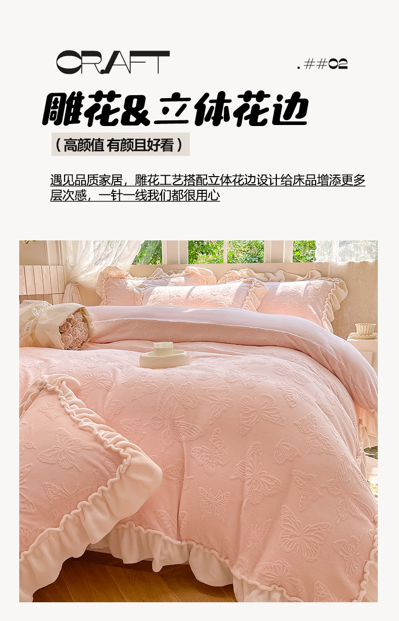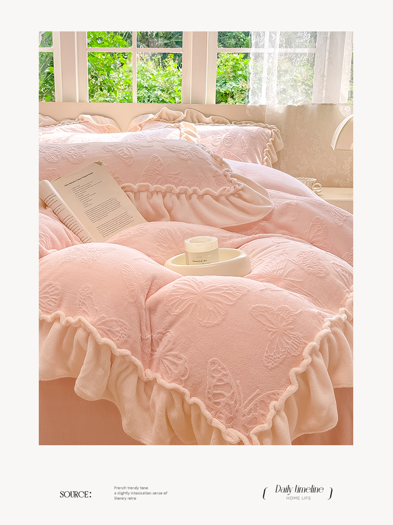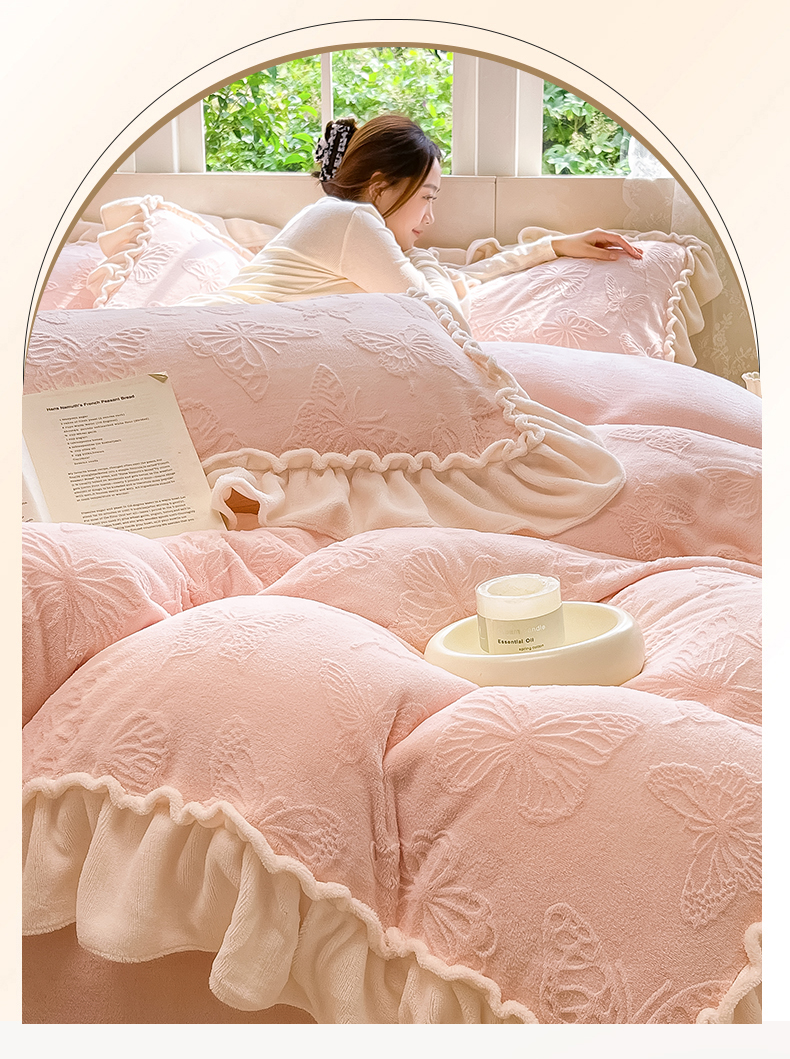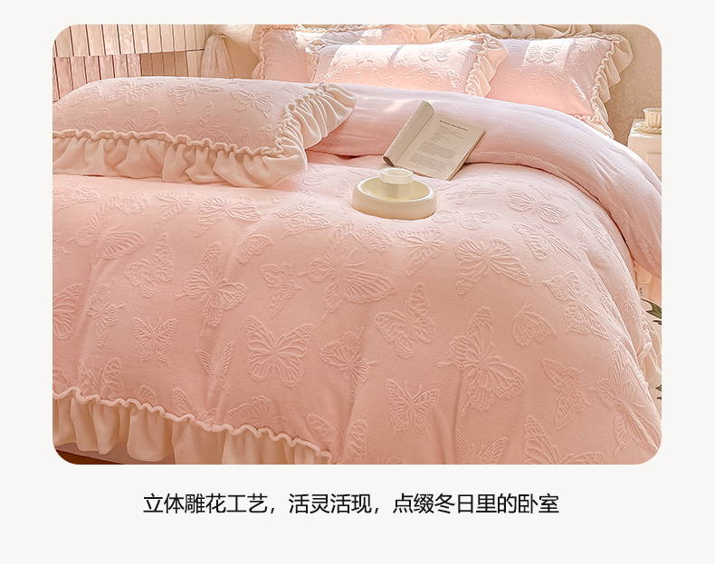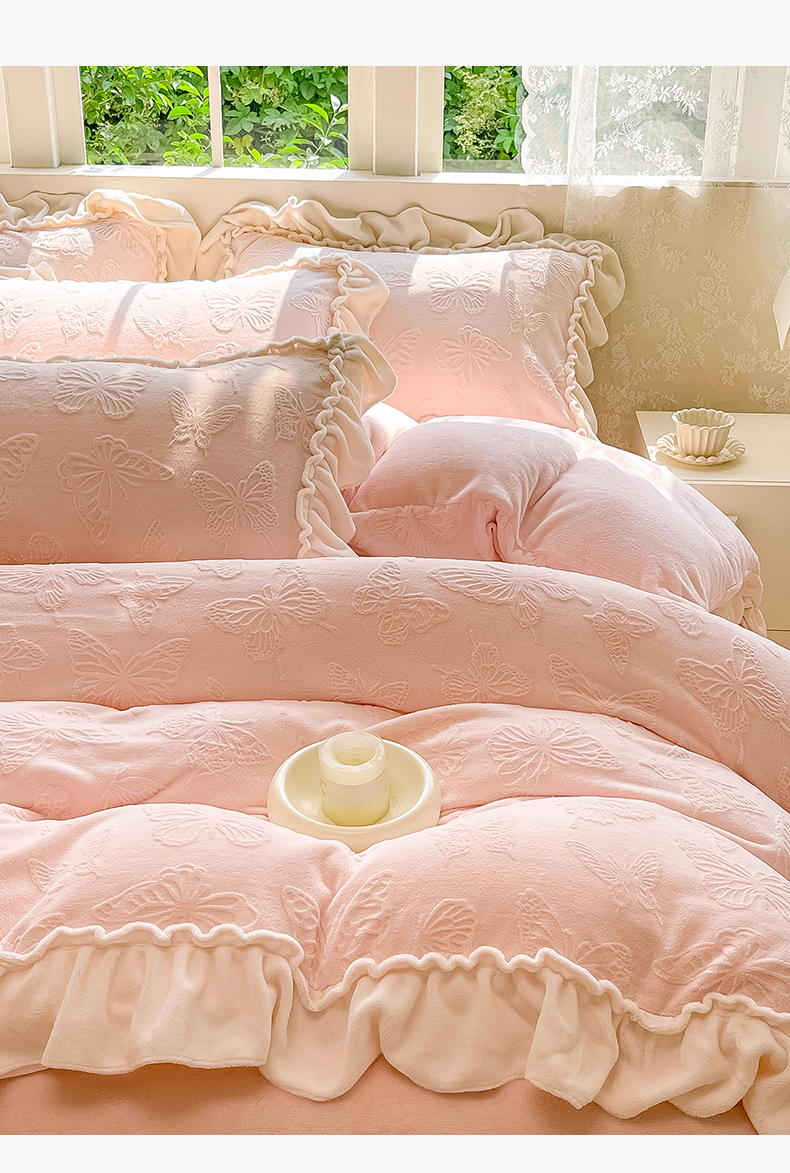 商品名称:水云缦 2025新款牛奶绒木耳边四件套-蝶舞 蝶舞-樱花粉