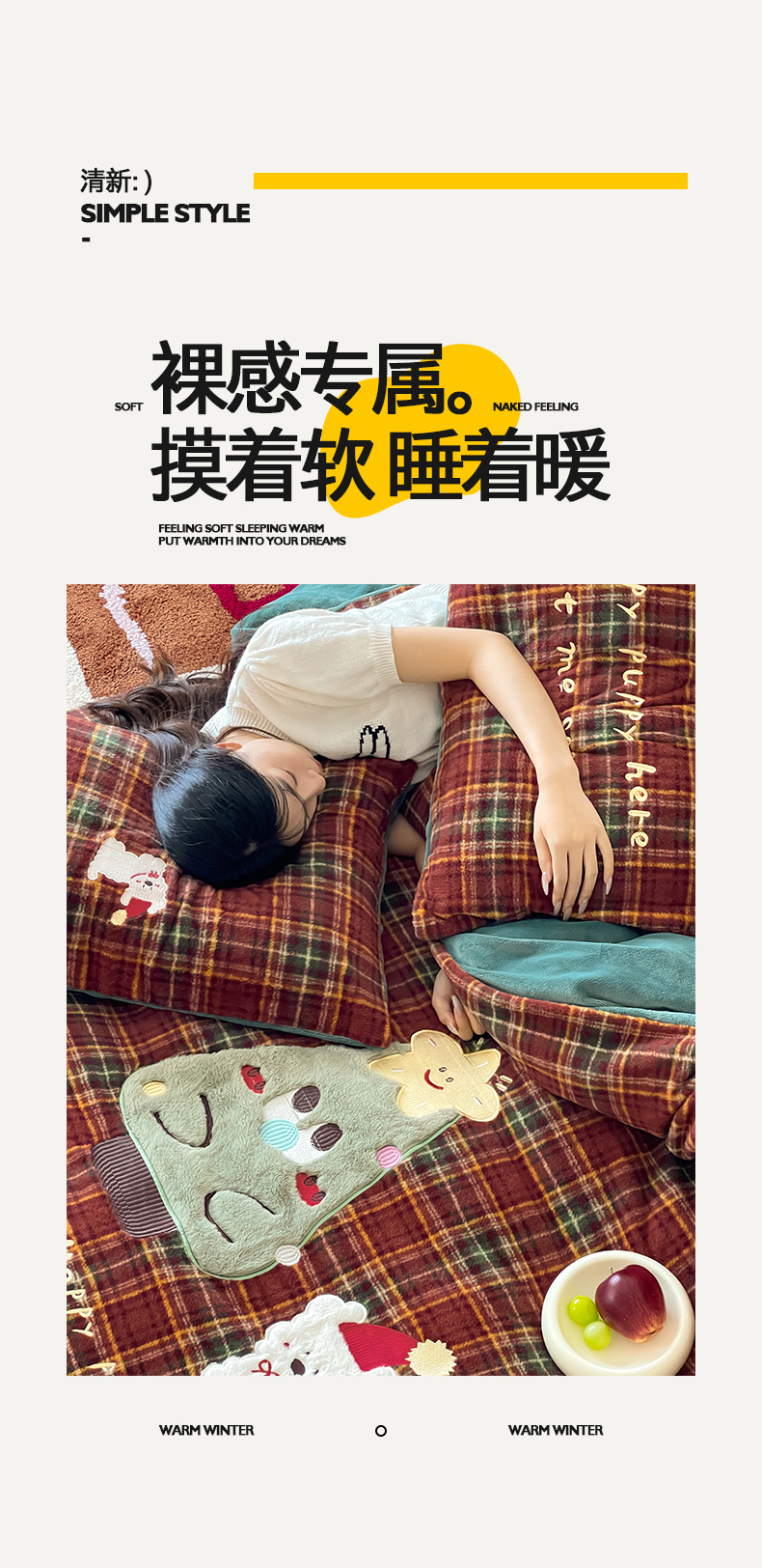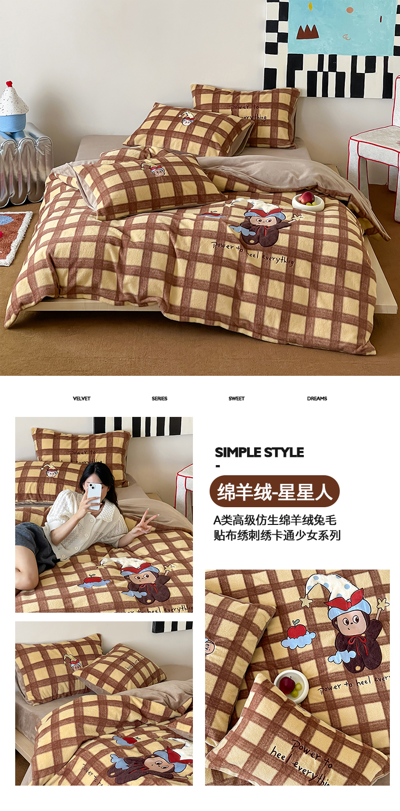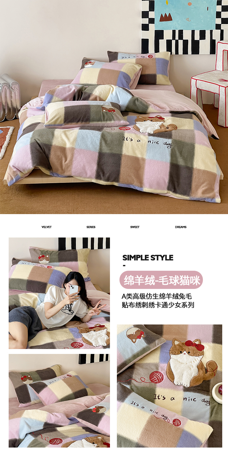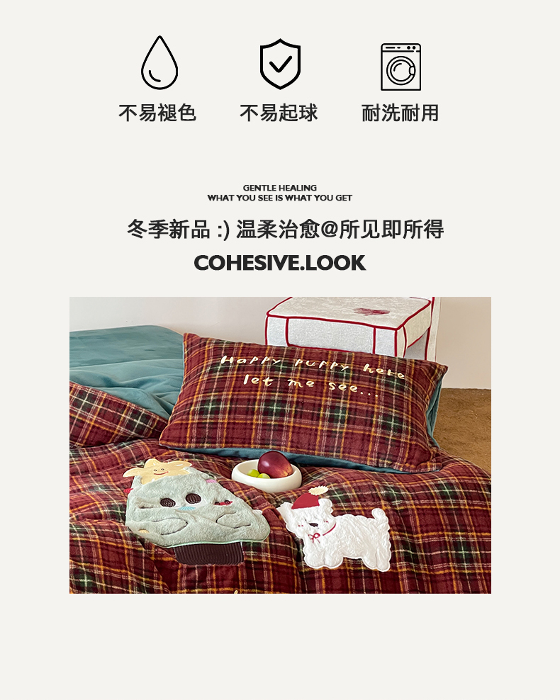 (总)桃子家居 2025新款A类高级仿生绵羊绒兔毛贴布绣刺绣工艺卡通少女加厚牛奶绒系列四件套,绵羊绒-冬日熊,绵羊绒-狗狗伙伴,绵羊绒-蓝条咖啡狗,绵羊绒-毛球猫咪,绵羊绒-圣诞小狗,绵羊绒-星星人