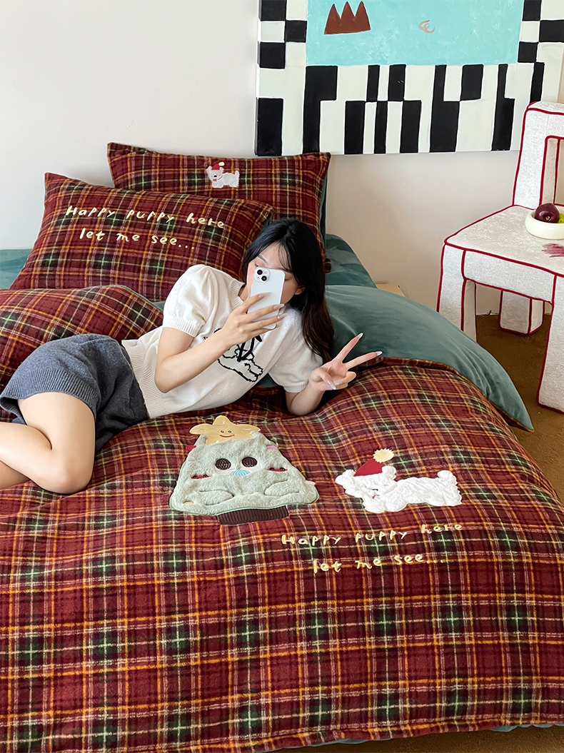 桃子家居 2025新款A类高级仿生绵羊绒兔毛贴布绣刺绣工艺卡通少女加厚牛奶绒系列四件套 绵羊绒-圣诞小狗