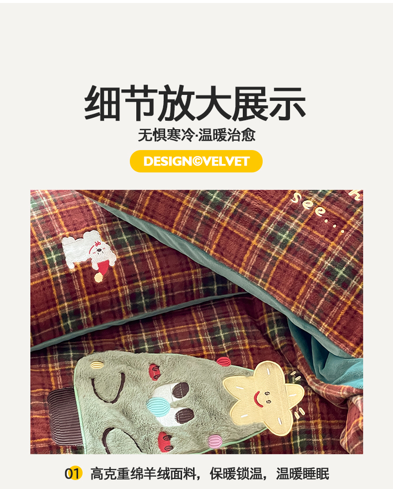 商品名称:桃子家居 2025新款A类高级仿生绵羊绒兔毛贴布绣刺绣工艺卡通少女加厚牛奶绒系列四件套 绵羊绒-圣诞小狗