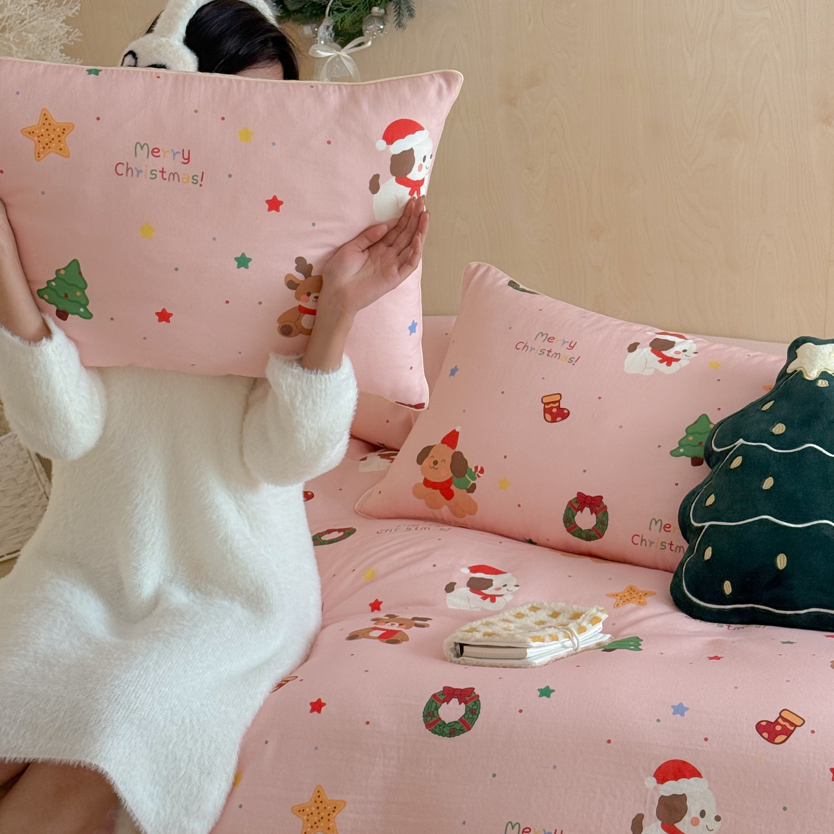 商品名称:西西家居 2025新款超柔有氧双层纱四件套-圣诞快乐 圣诞快乐-粉