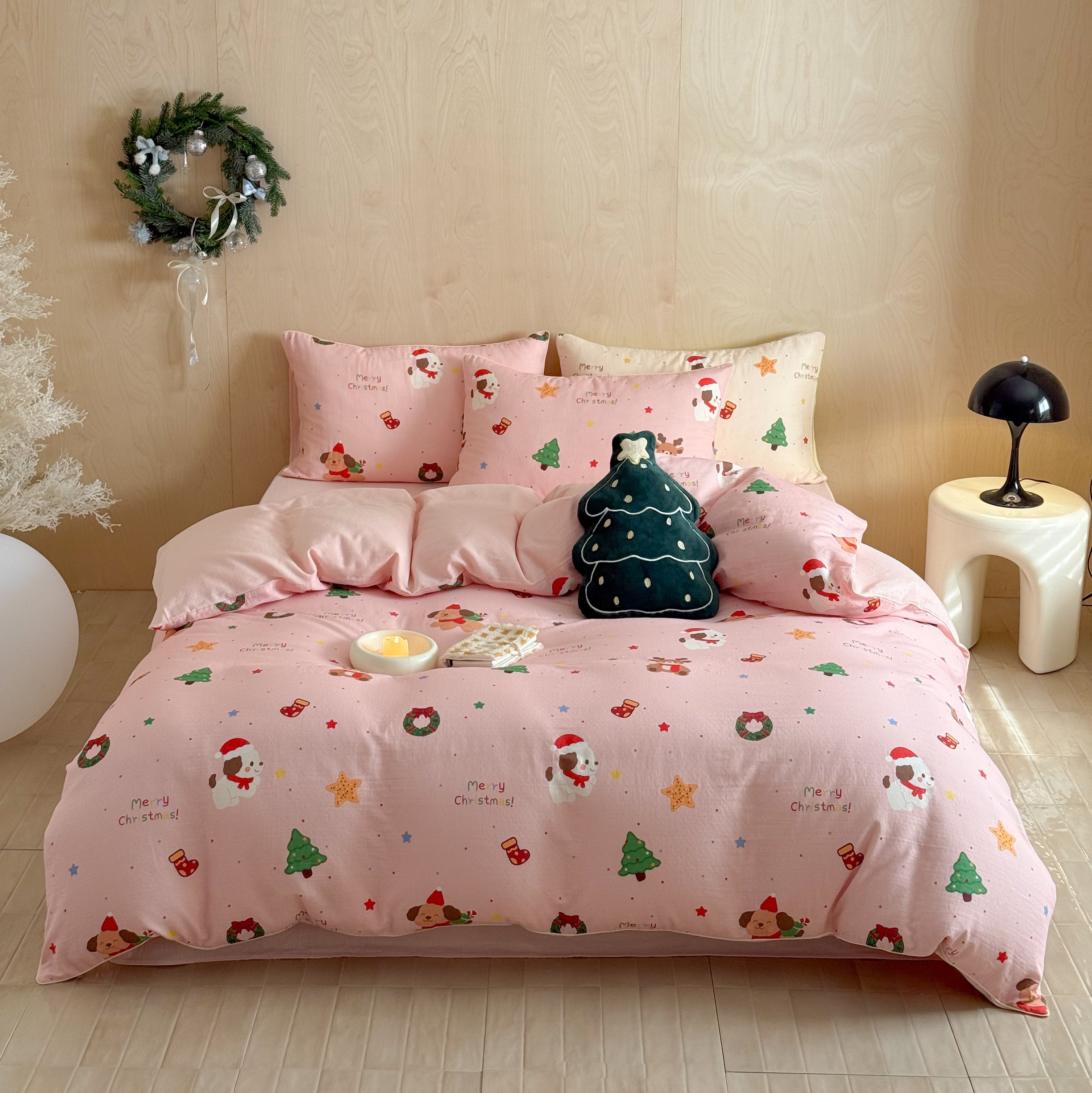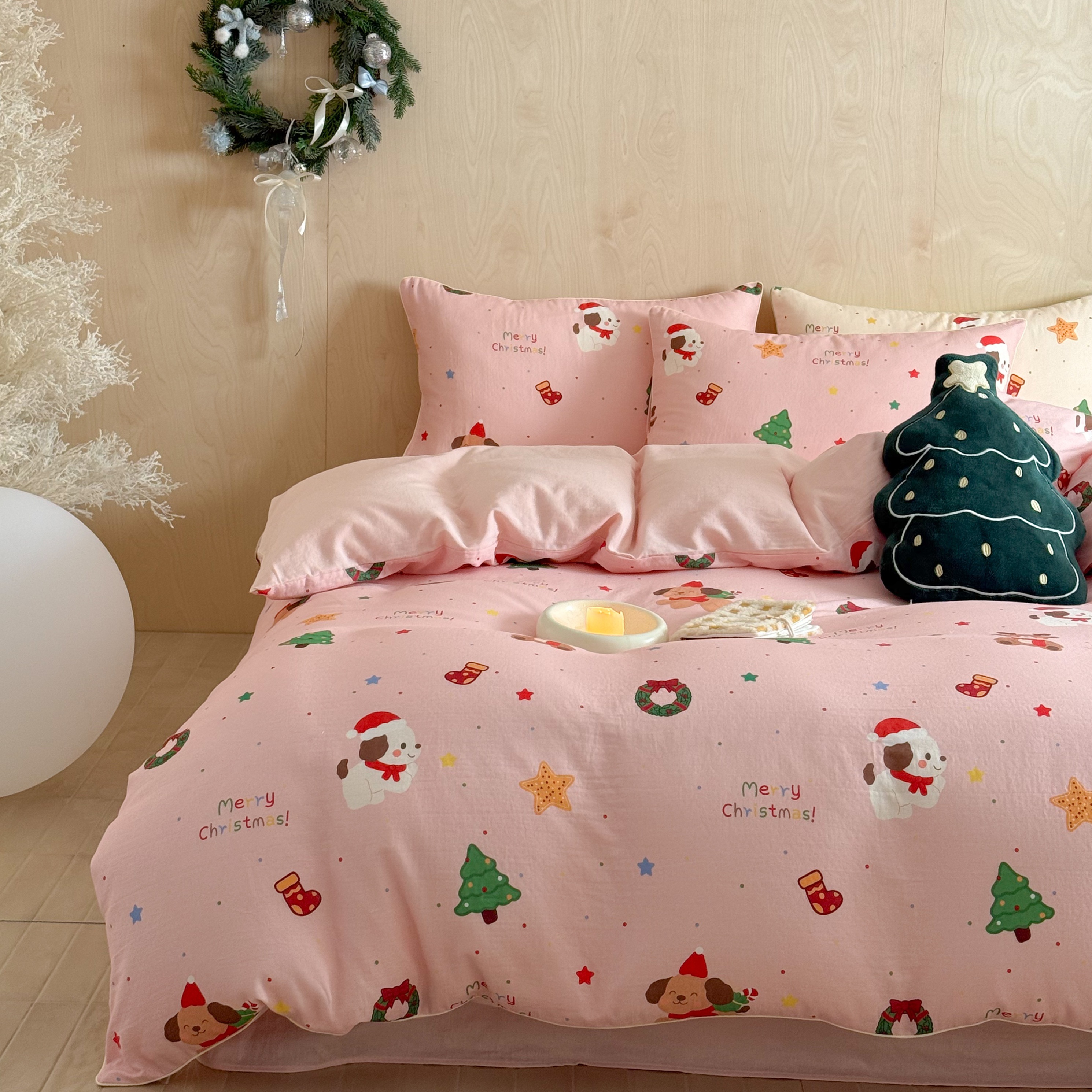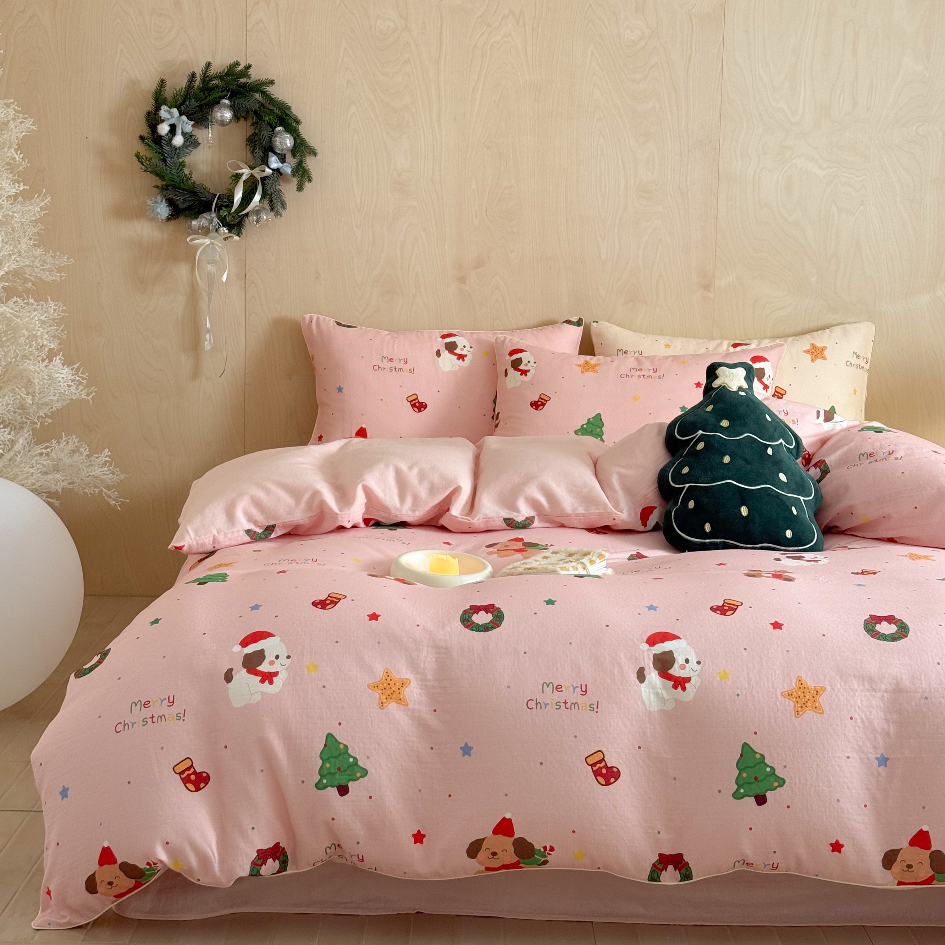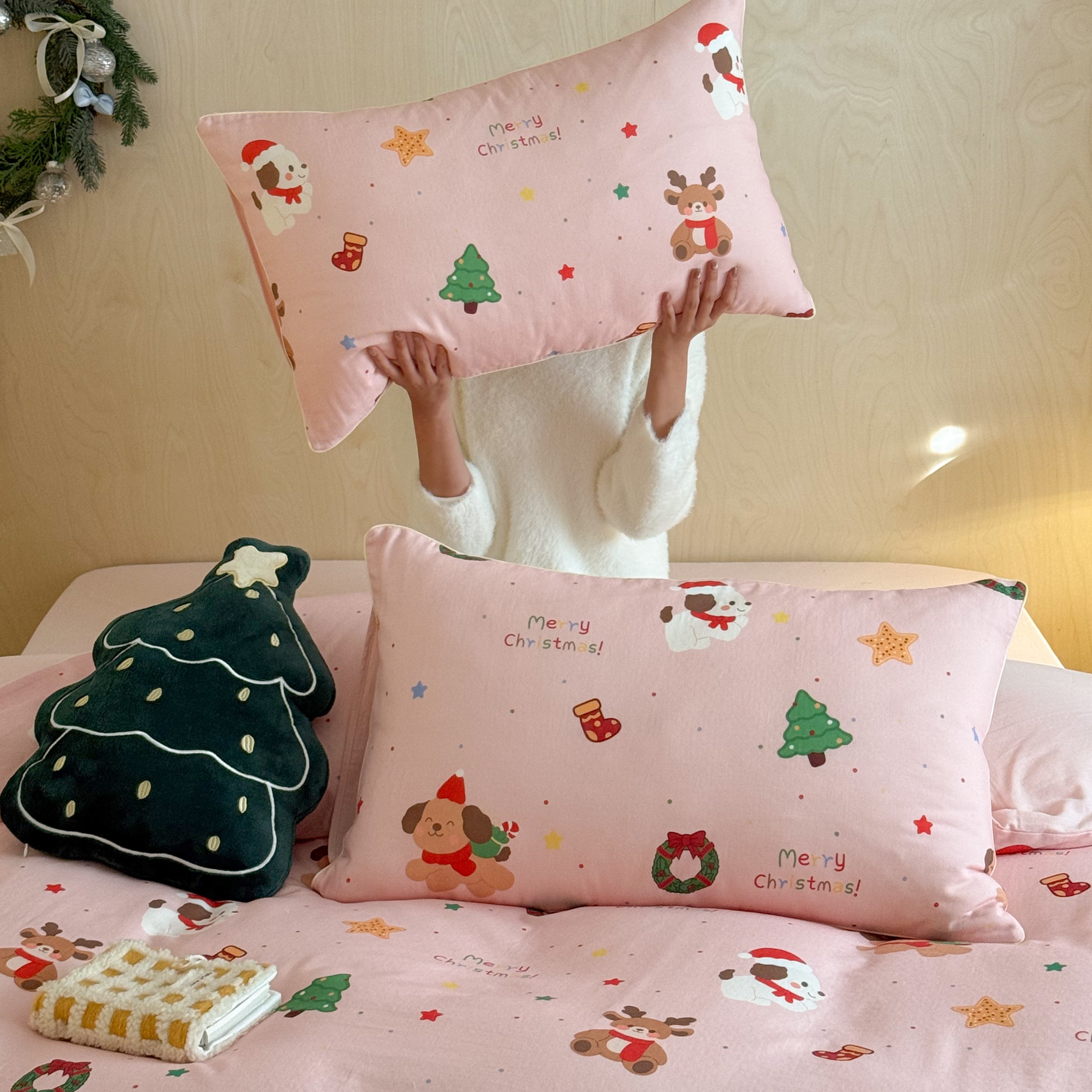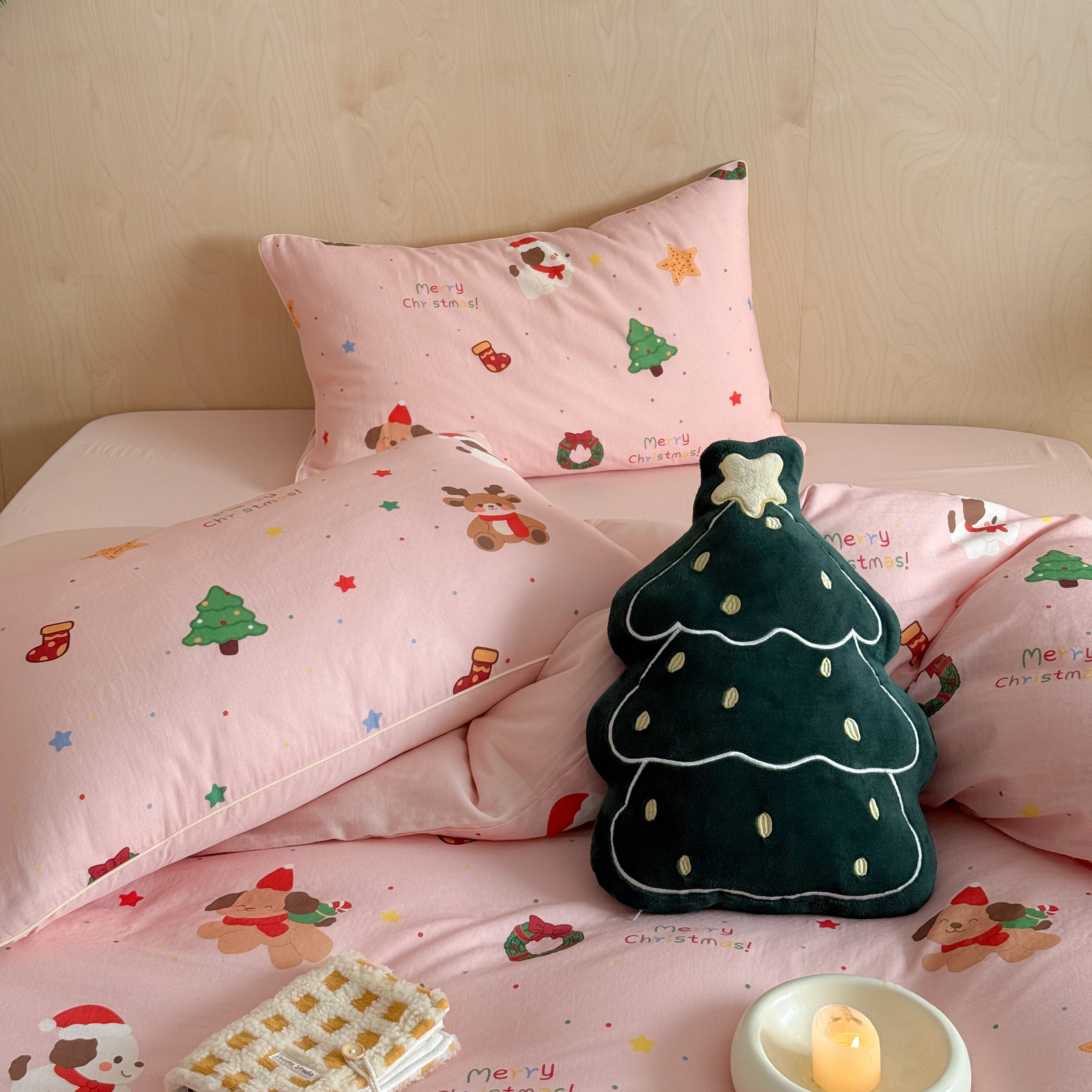 西西家居 2025新款超柔有氧双层纱四件套-圣诞快乐 圣诞快乐-粉