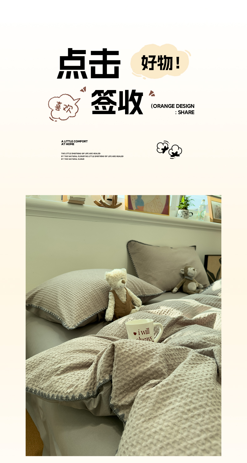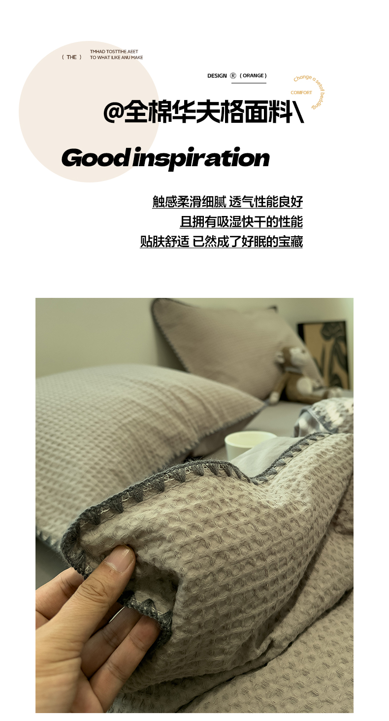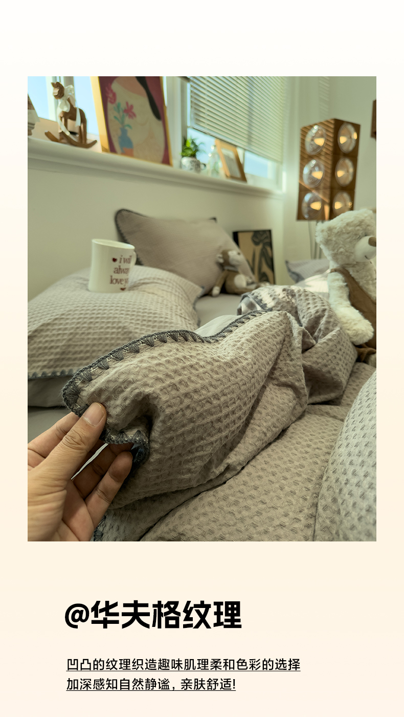 (总)雅居纺家纺 2022新款全棉华夫格普通款四件套,焦糖,米驼,奶油白,柔粉,深灰,雾蓝,月灰