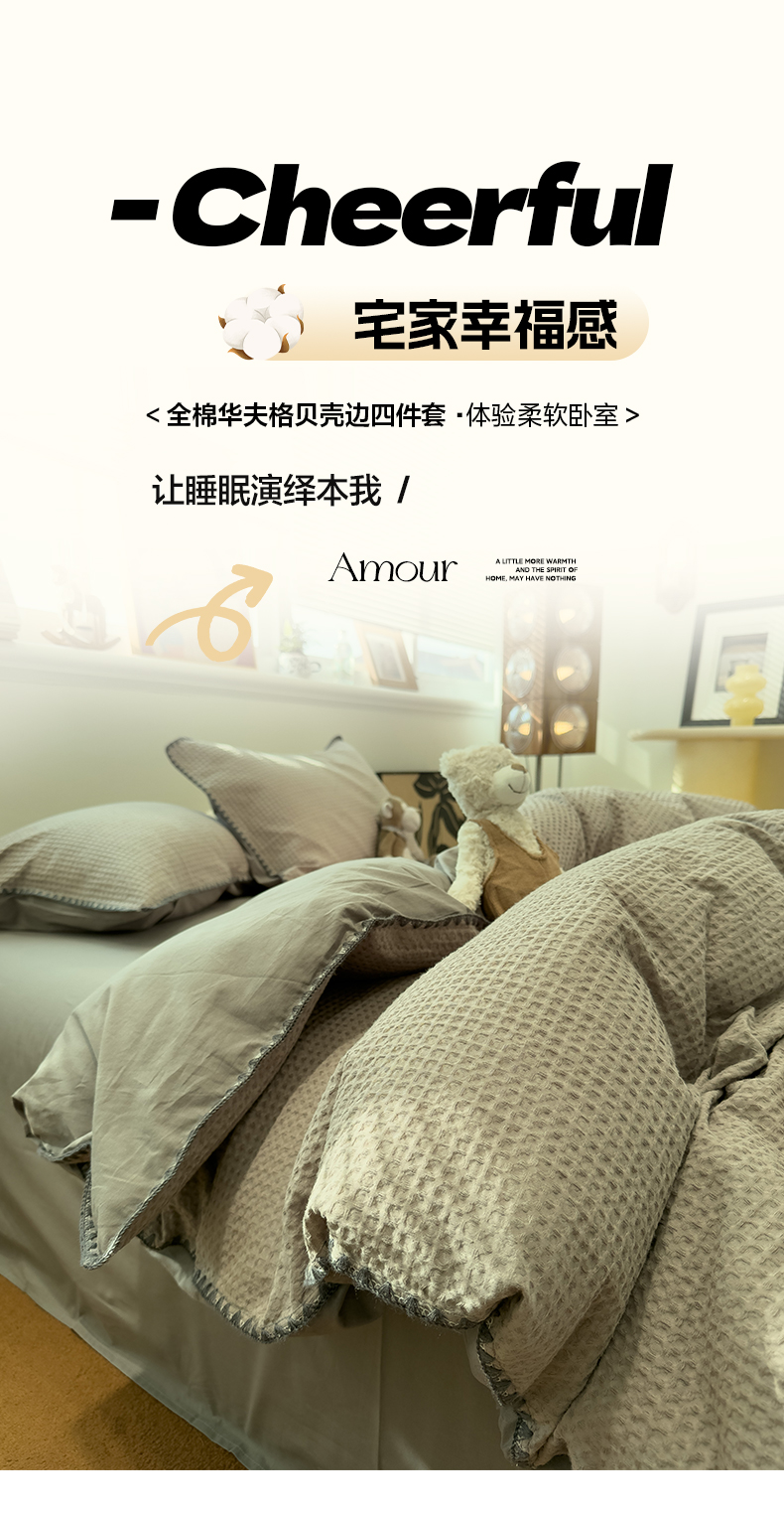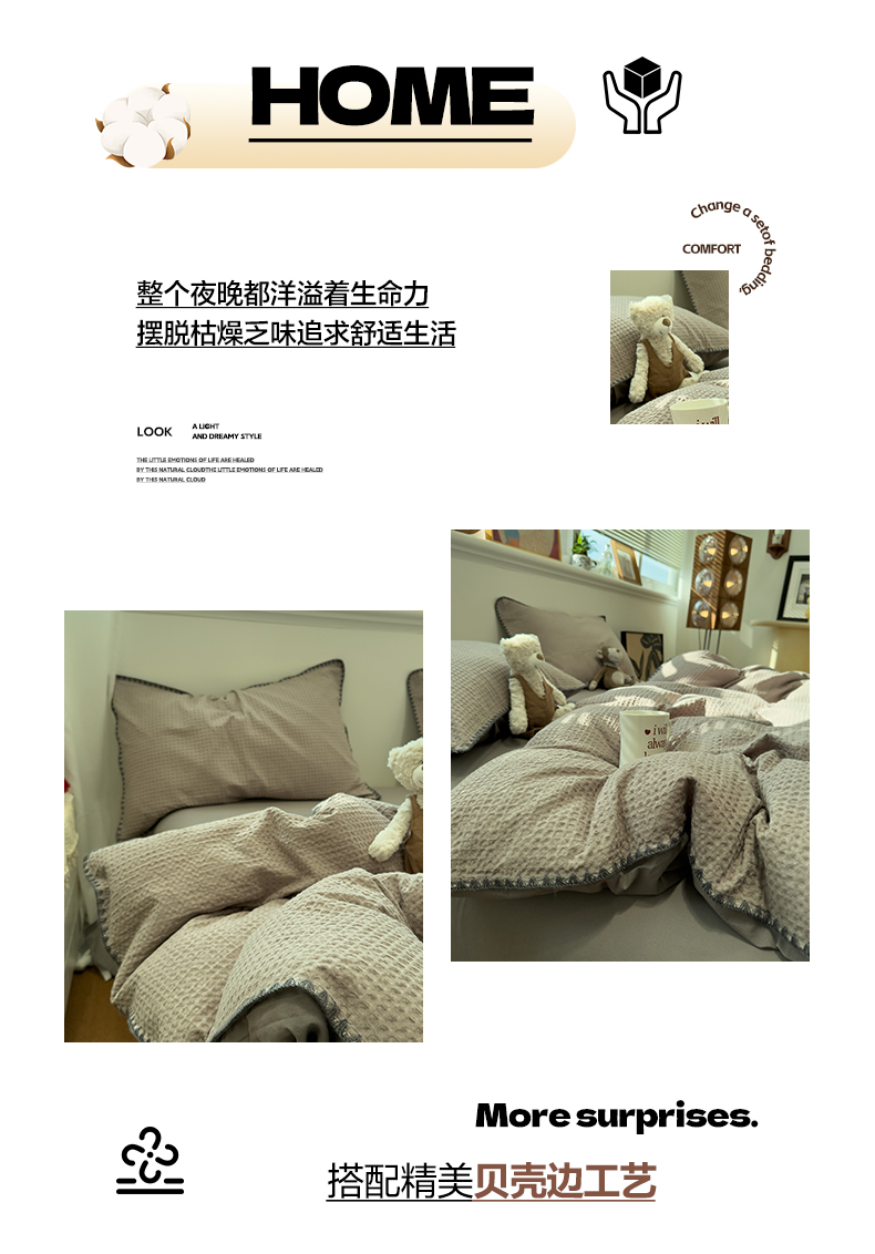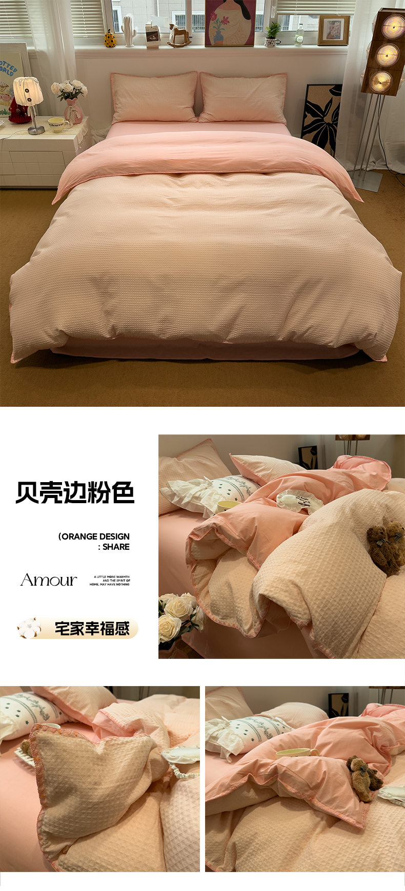 (总)雅居纺家纺 2026新款全棉贝壳边华夫格四件套,贝壳边粉色,贝壳边灰色,贝壳边蓝黄,贝壳边米黄,贝壳边米驼,贝壳边浅绿