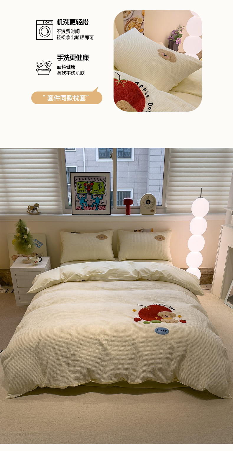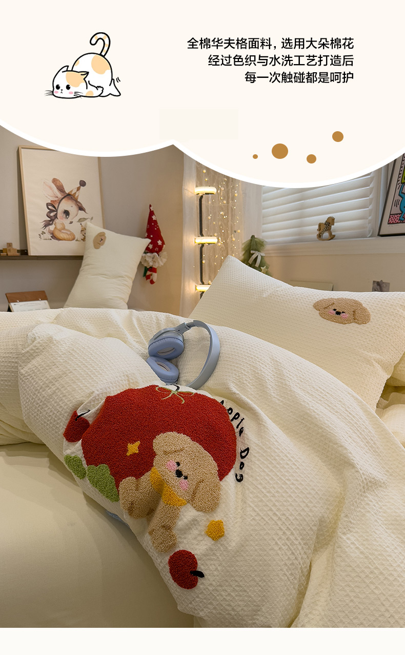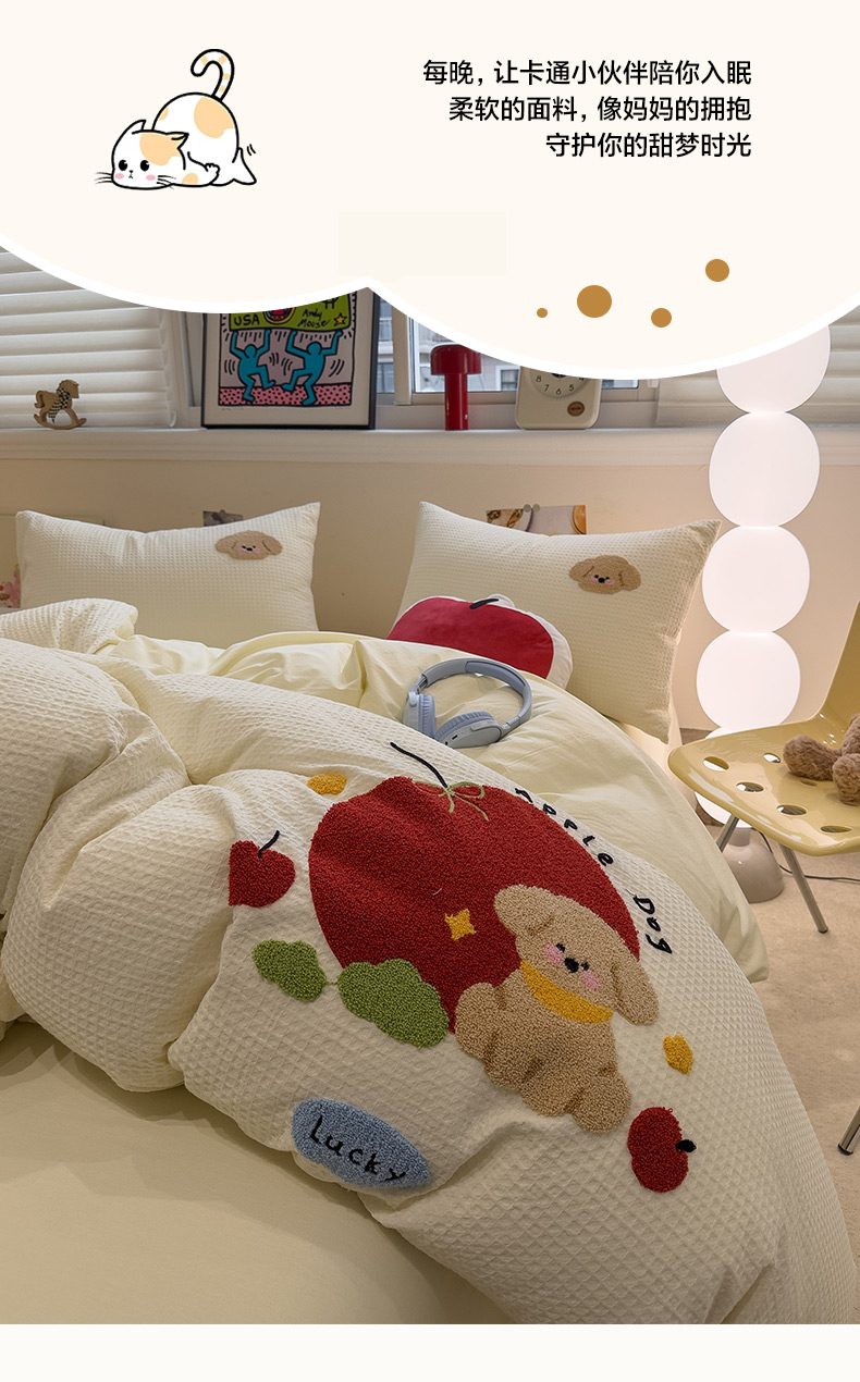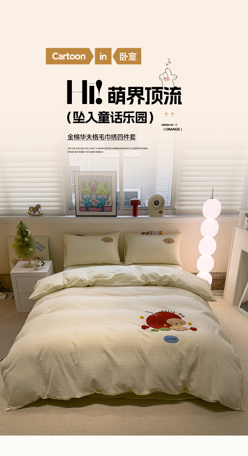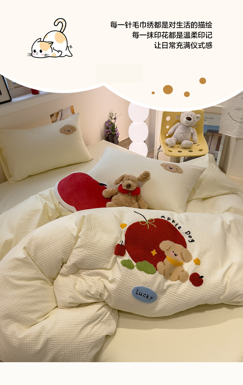 当前位置: 91家纺网 > 商品网购 > 床品套件 > 四件套 > 全棉普通四件套 > 雅居纺家纺 2026新款全棉华夫格毛巾绣四件套 米黄苹安狗
