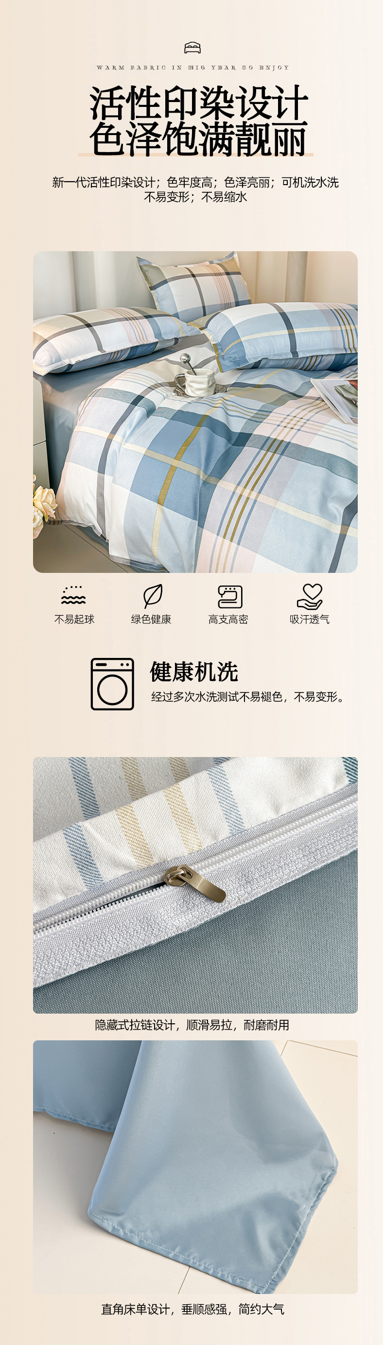 (总)楠沐家纺 2026年新款无印风学生印花四件套芦荟棉水洗棉,彩色波点,觅遇,晴空蓝格,亚麻灰格,烟雾灰格,英伦蓝格