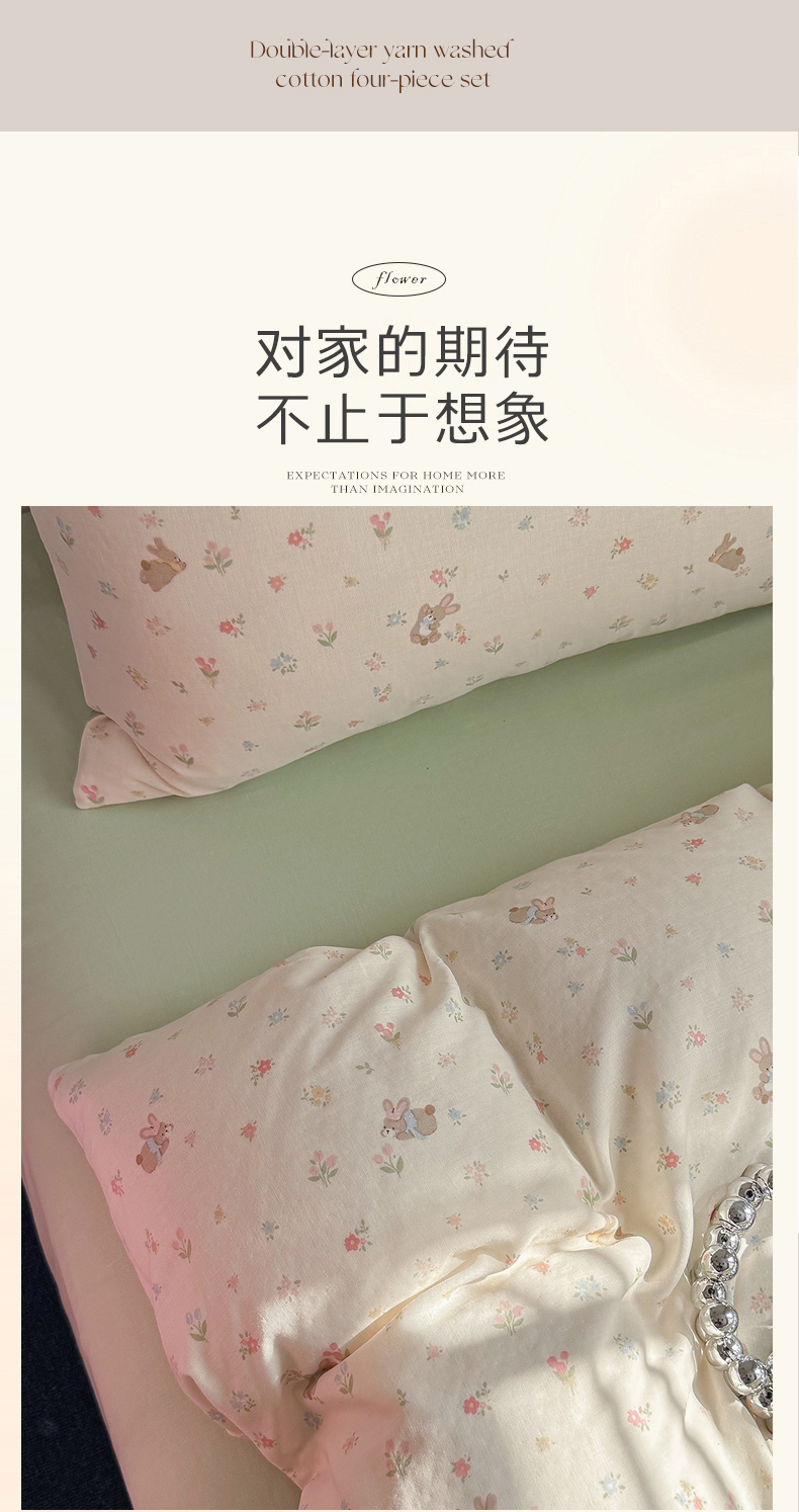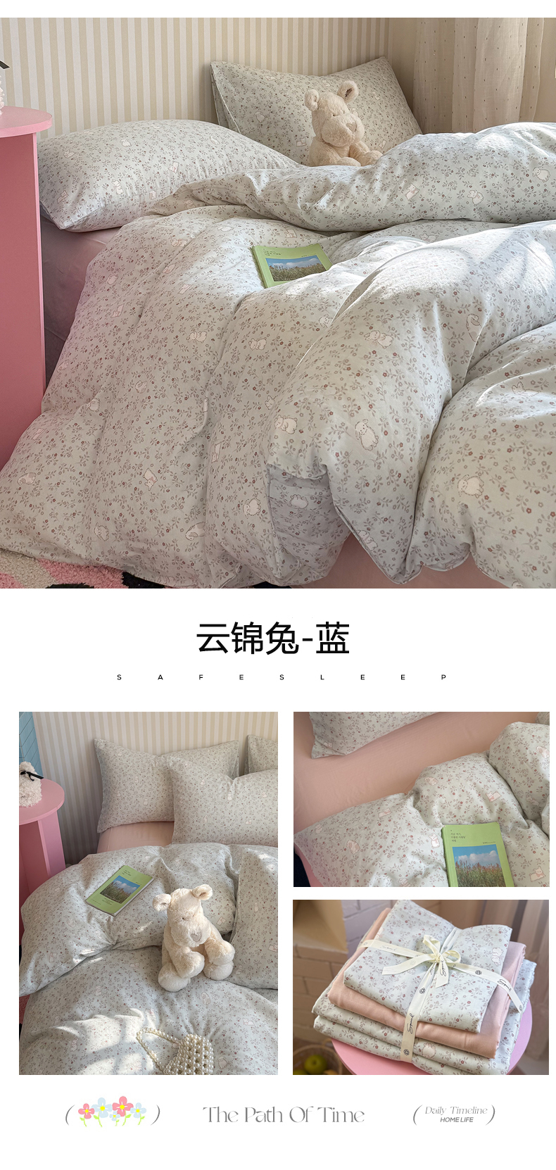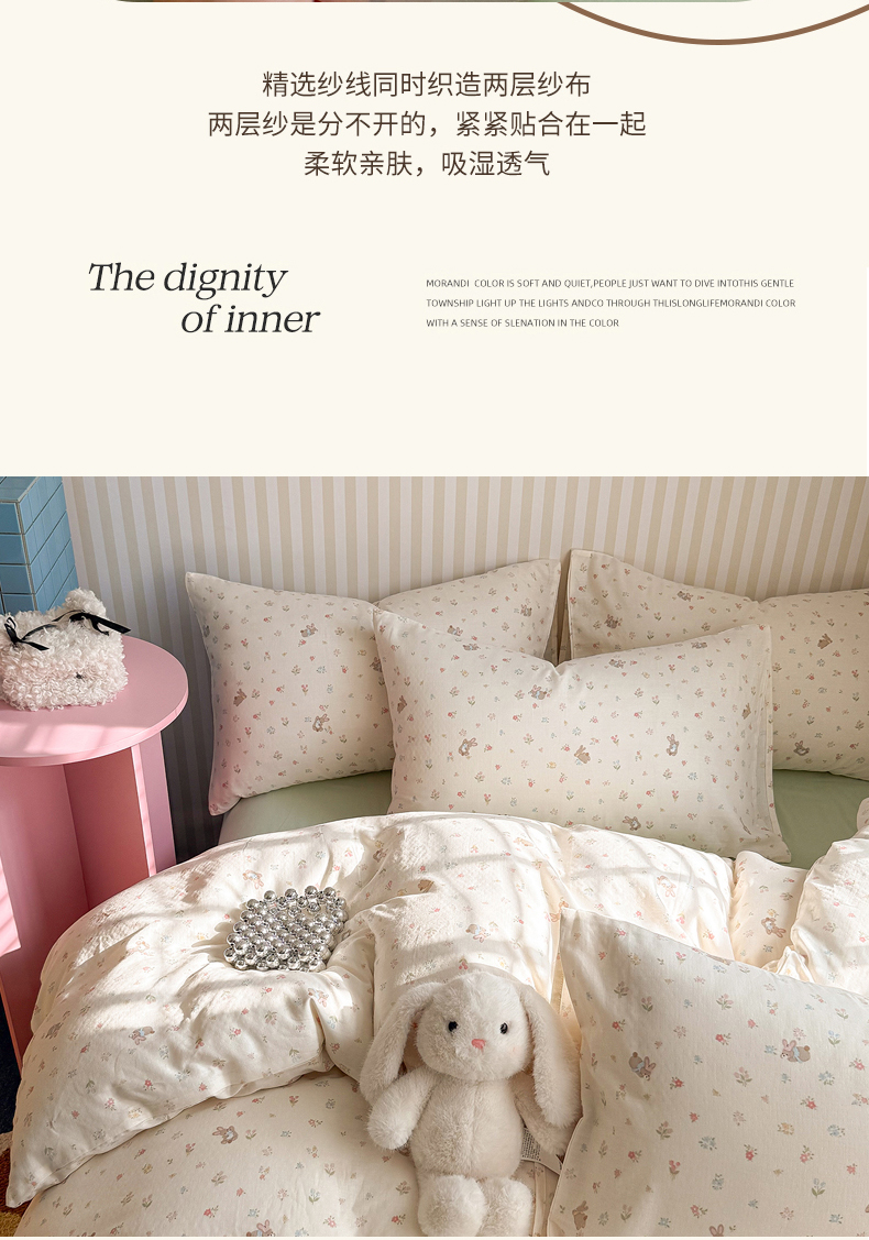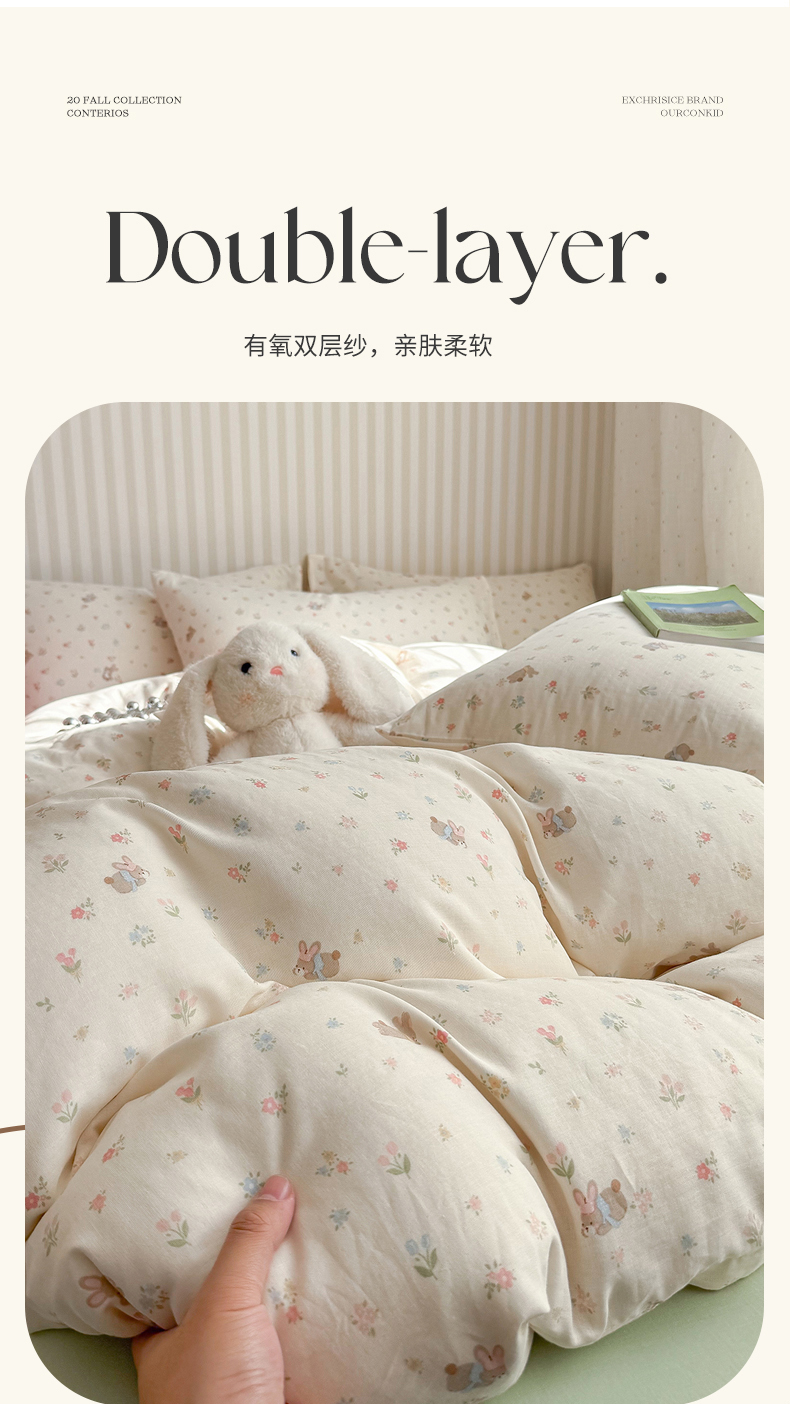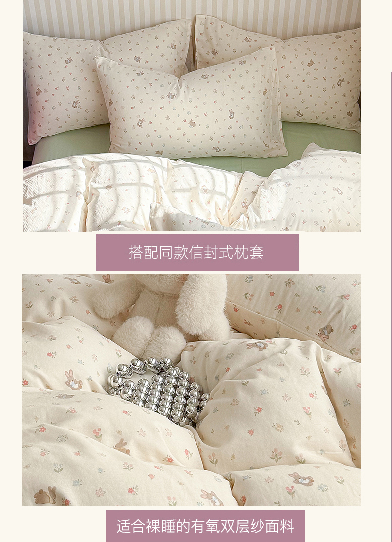 当前位置: 91家纺网 > 商品网购 > 床品套件 > 四件套 > 全棉普通四件套 > 麦伦家居 2026年春夏新款全棉纯棉有氧双层纱印花四件套-第二波 兔兔茉莉