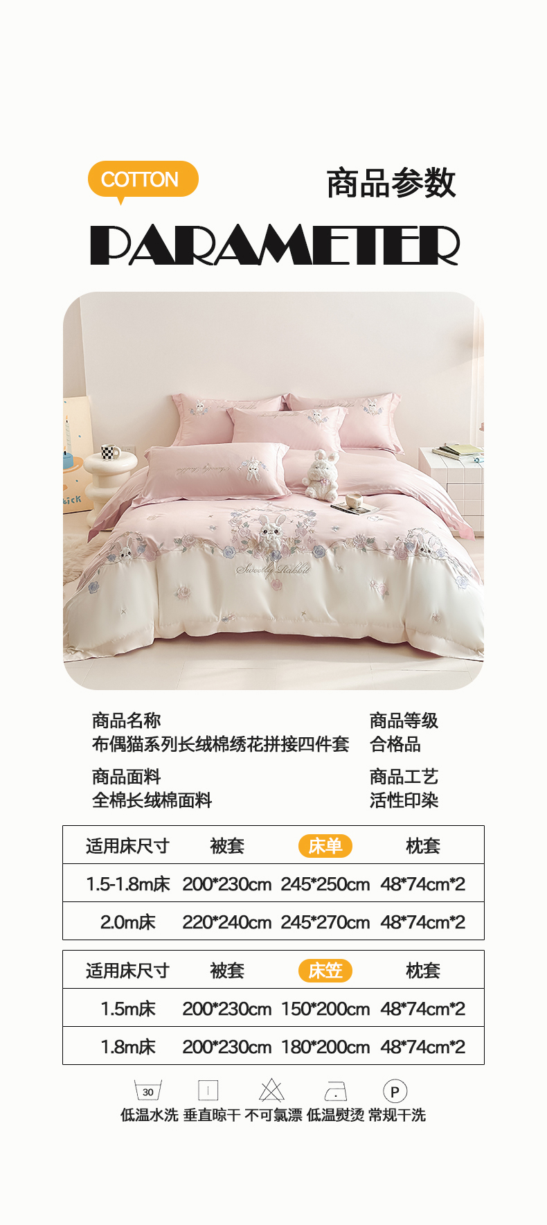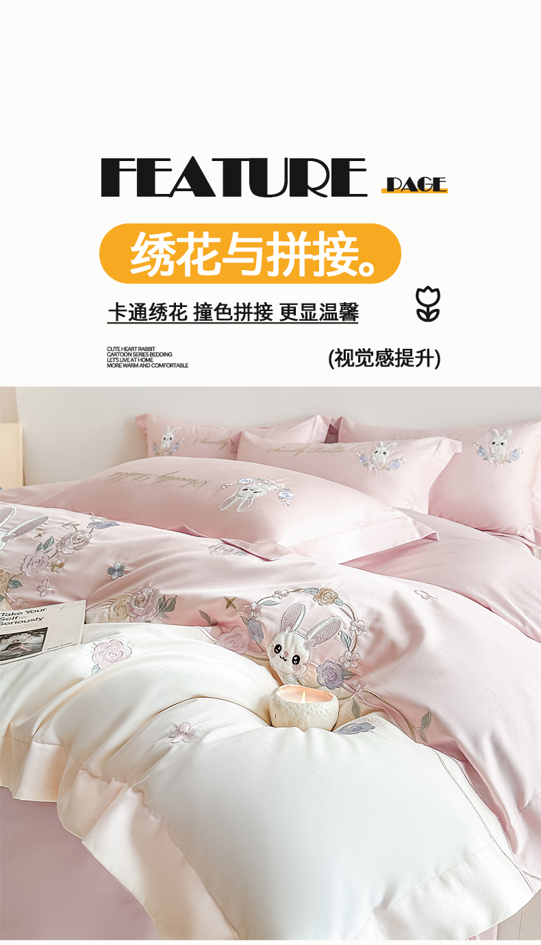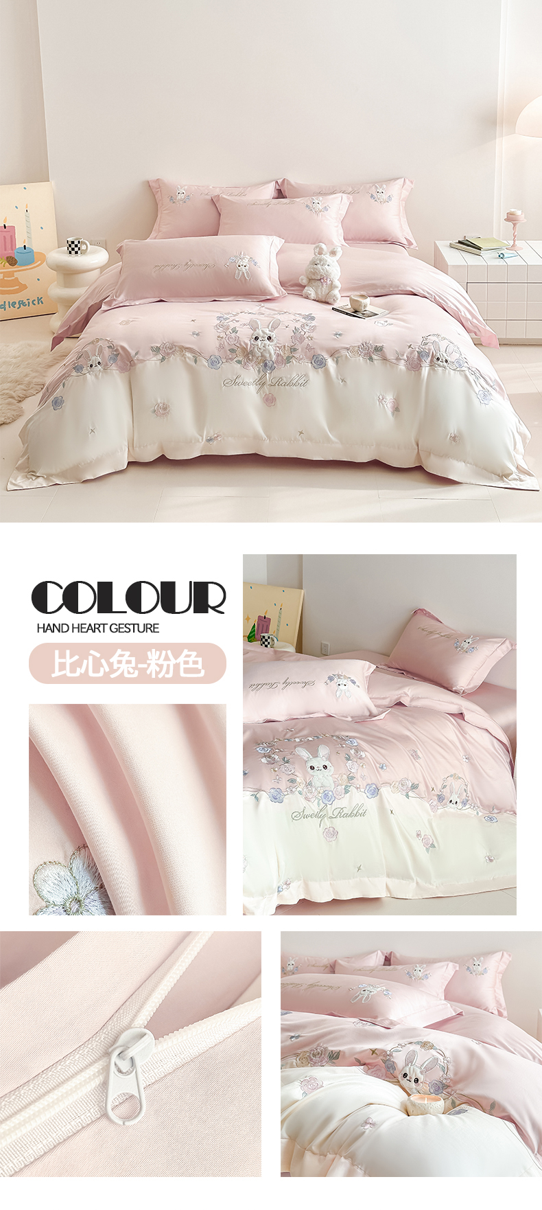 当前位置: 91家纺网 > 商品网购 > 床品套件 > 四件套 > 全棉普通四件套 > 置顶家纺 2026新款比心兔系列全棉长绒棉拼接绣花四件套 比心兔-粉色