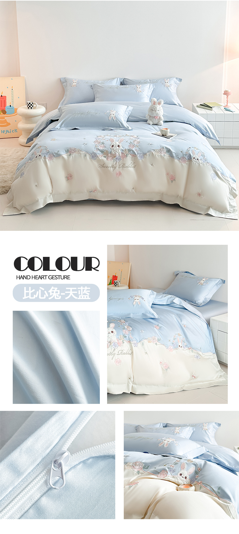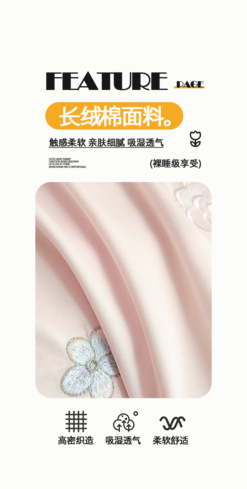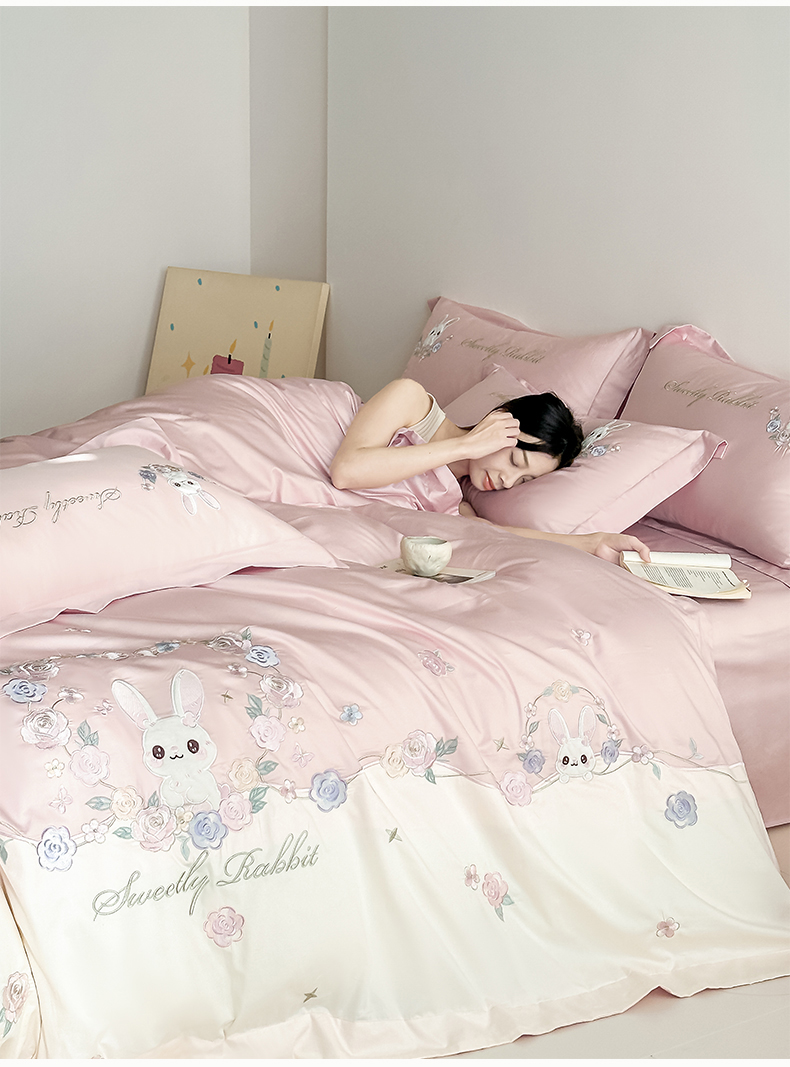当前位置: 91家纺网 > 商品网购 > 床品套件 > 四件套 > 全棉普通四件套 > 置顶家纺 2026新款比心兔系列全棉长绒棉拼接绣花四件套 比心兔-粉色