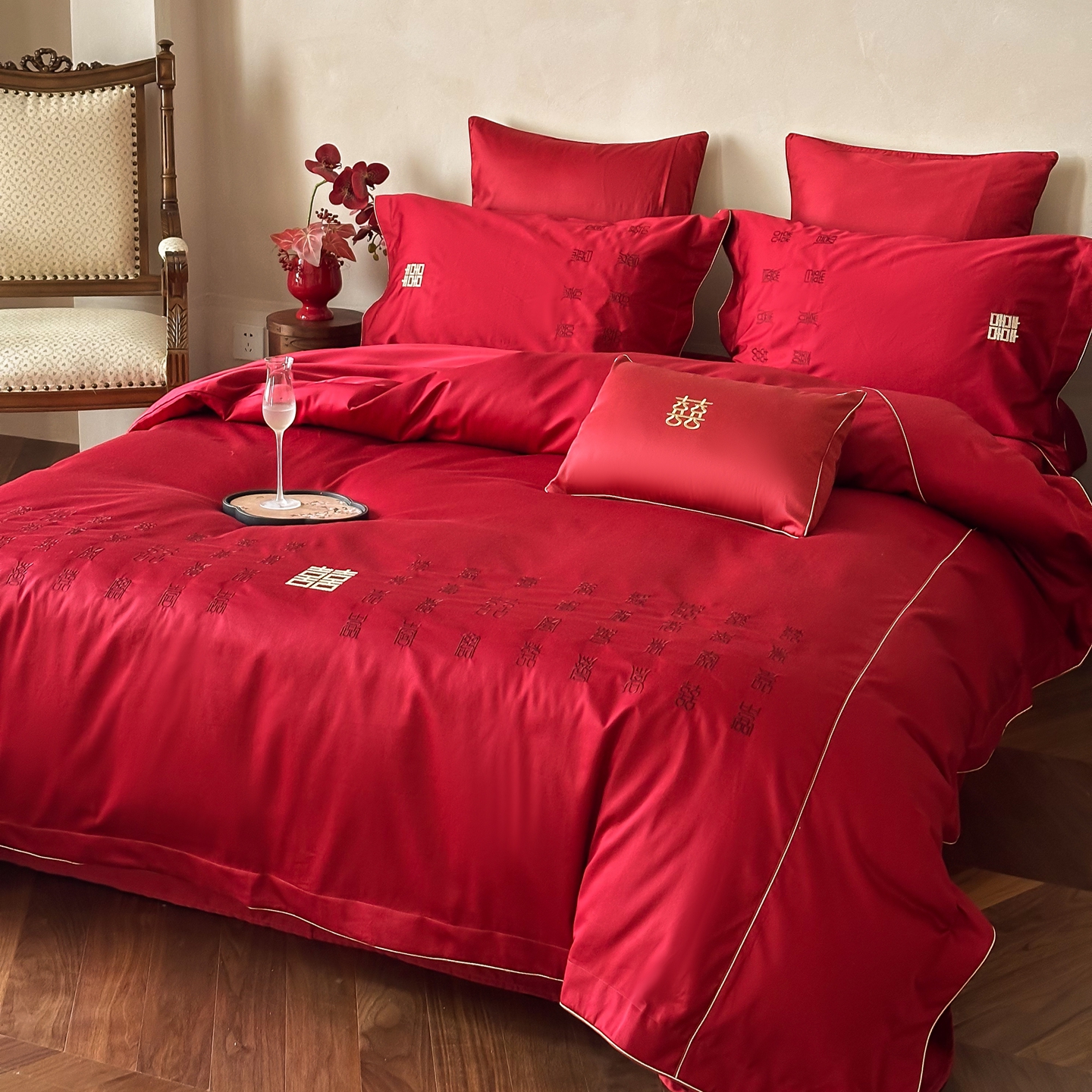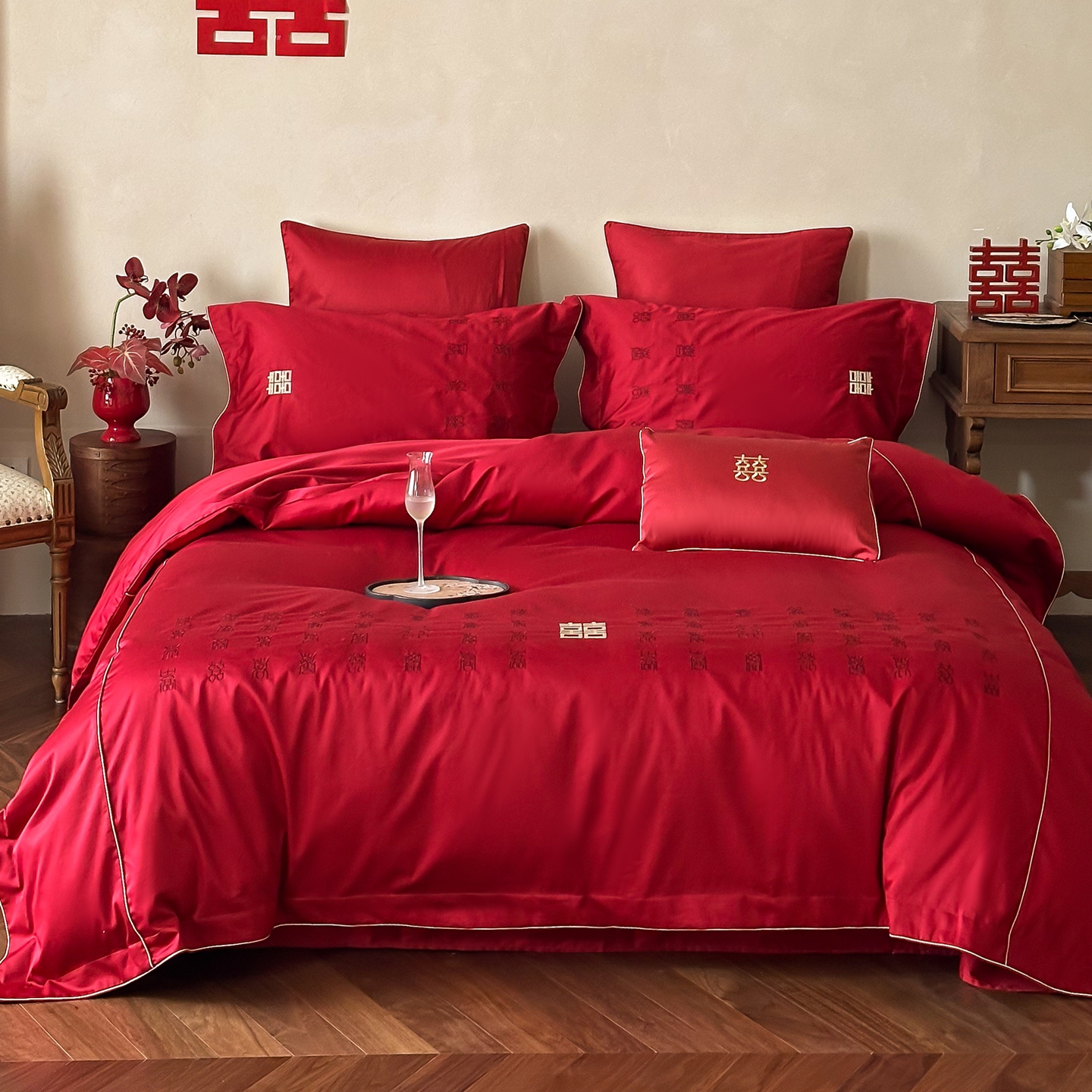 (总)西西家居 2026春夏新款大红婚庆100支长绒棉纯棉四件套-欢囍