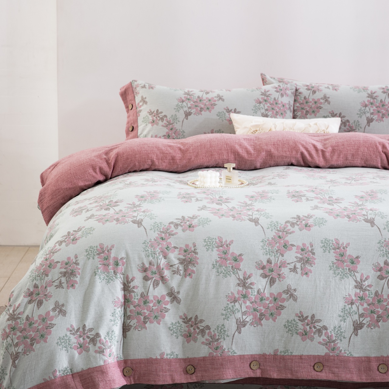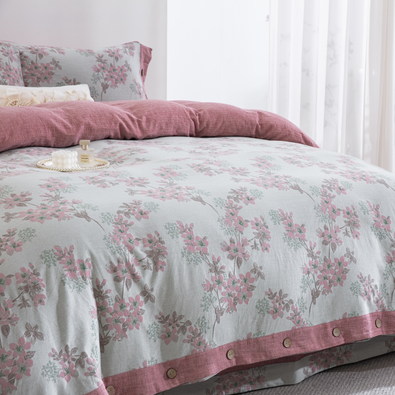 商品名称:(总)双层纱家居 2025新款临江仙-粉全棉纯棉色织提花纽扣款四件套