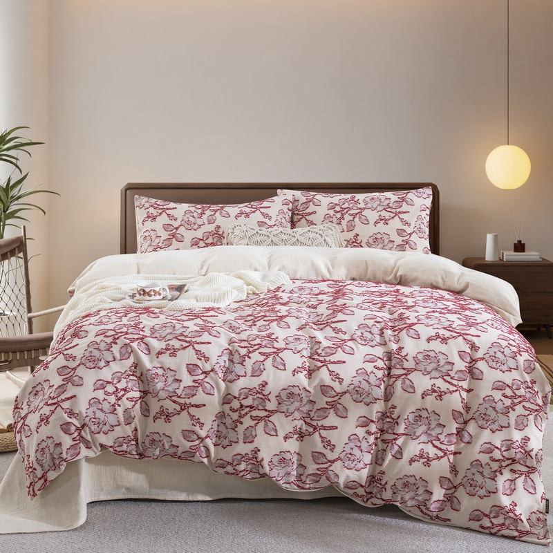 (总)双层纱家居 2026新款全棉纯棉色织提花拼角飞边款四件套-郁金花园正红,郁金花园正红