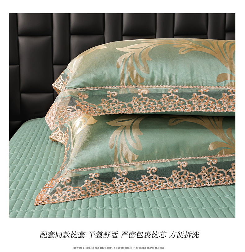商品名称:提花大世界 2026新款直播爆款水洗真丝天丝贡缎提花夹棉床盖花边四件套 英伦时尚-绿