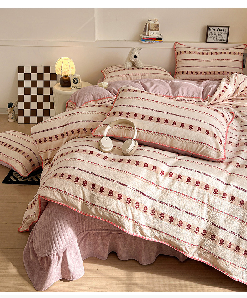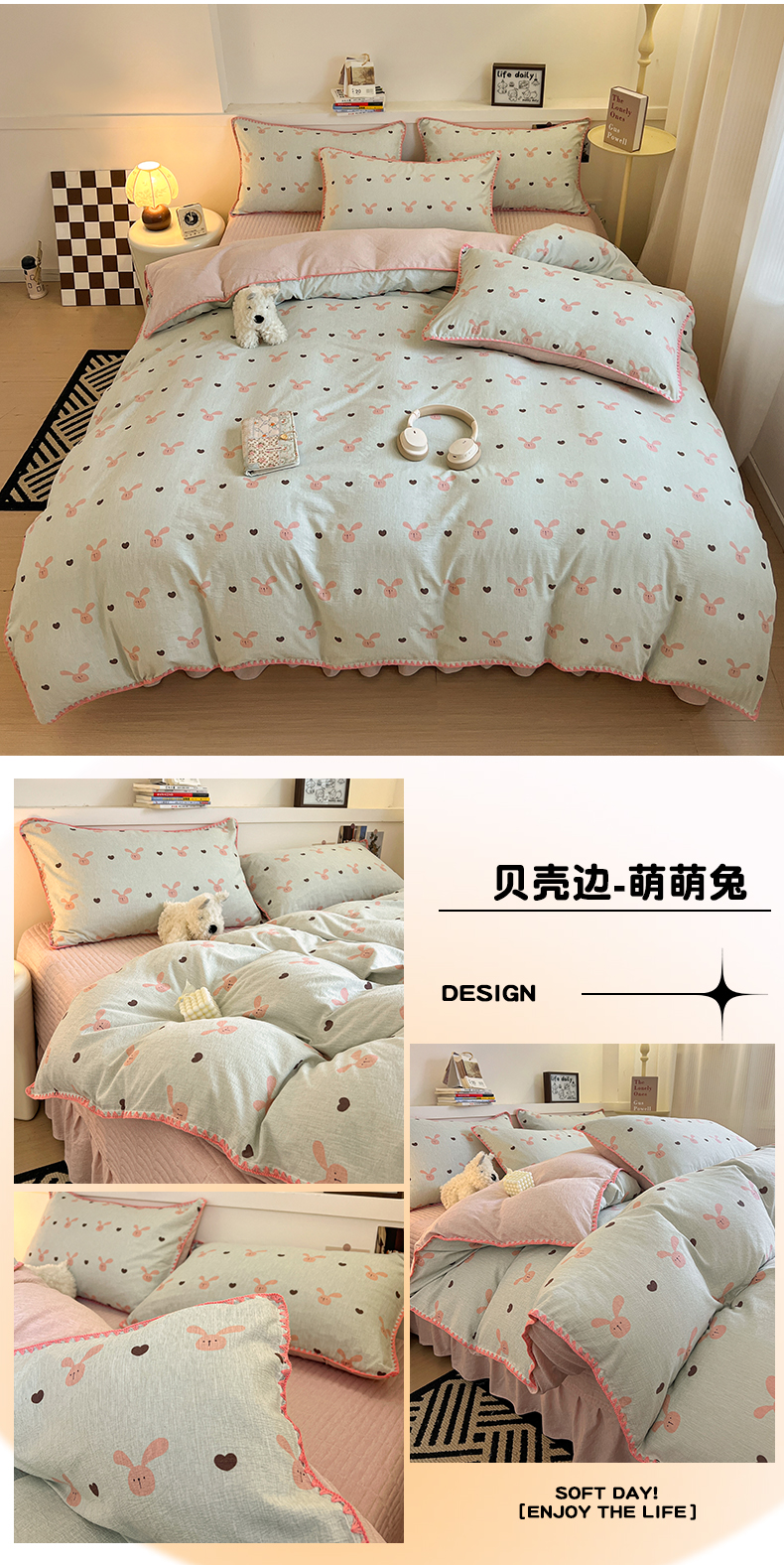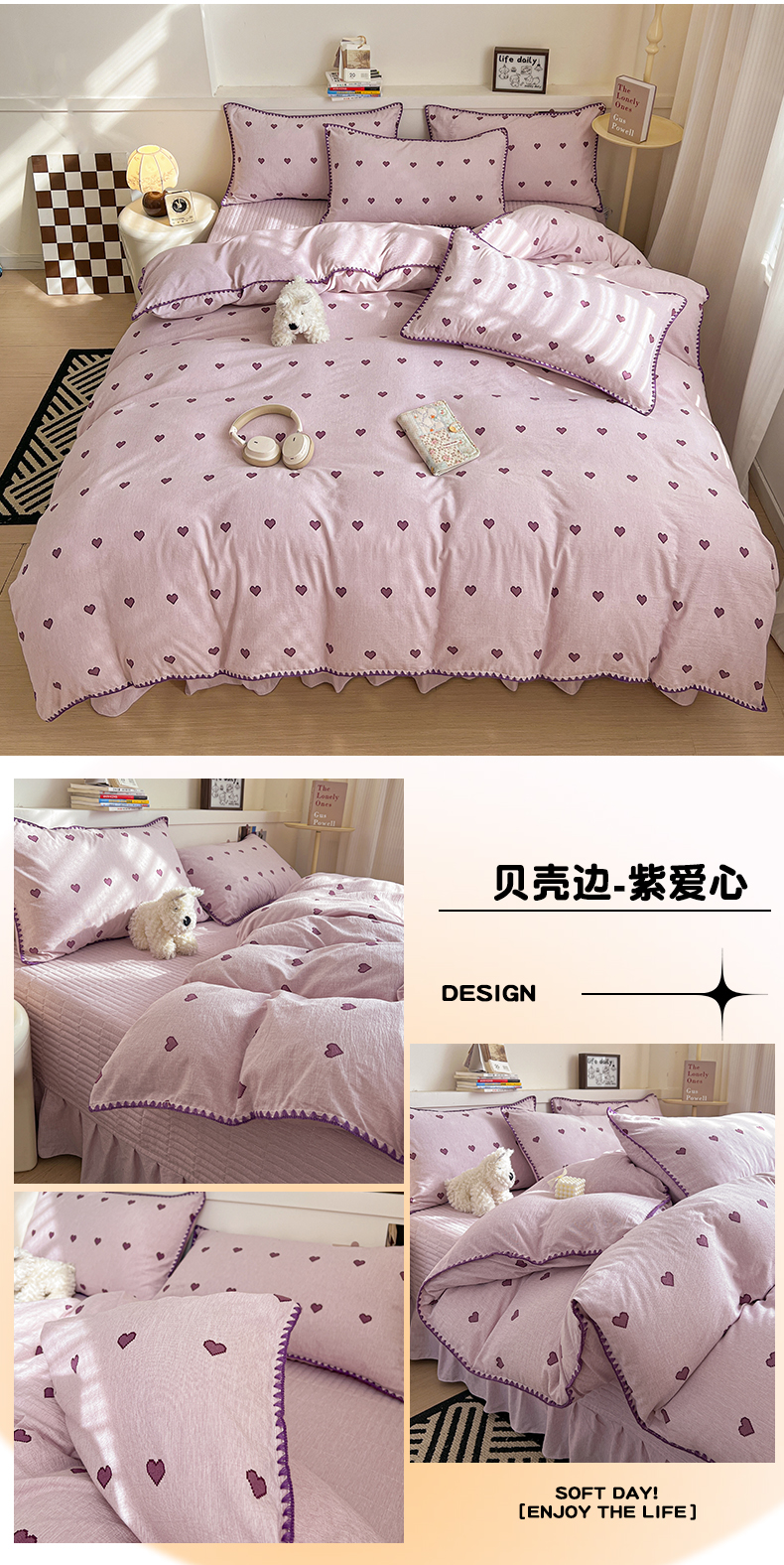 当前位置: 91家纺网 > 商品网购 > 床品套件 > 四件套 > 色织四件套 > 富米莱(原臻工厂) 2026春夏新款色织提花贝壳边床盖床裙四件套 贝壳边-紫爱心