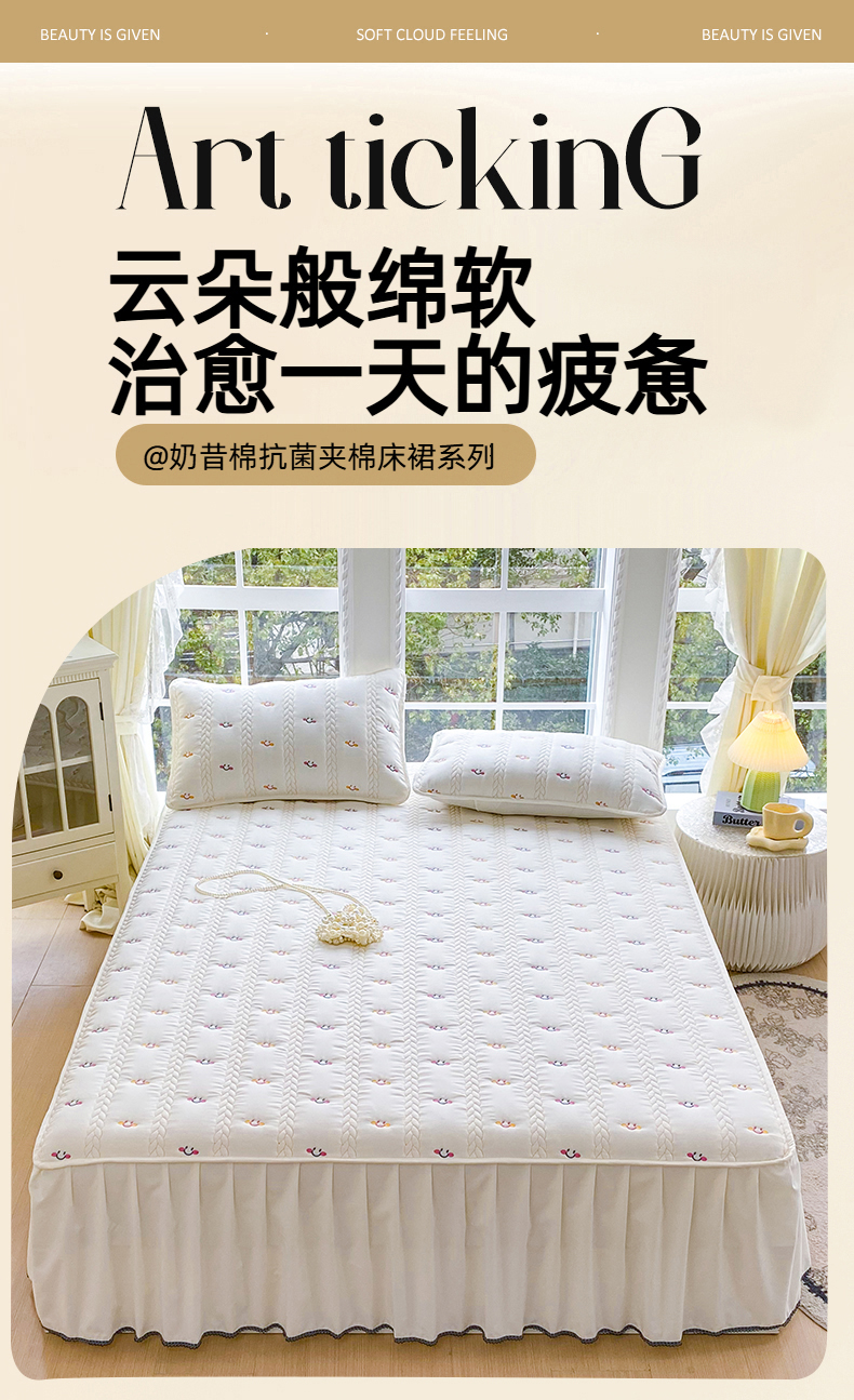 当前位置: 91家纺网 > 商品网购 > 床上用品 > 床裙 > 尊康家纺(原磊科) 2026新款奶昔棉抗菌夹棉床裙款床笠-云尚系列 云尚-粉玉