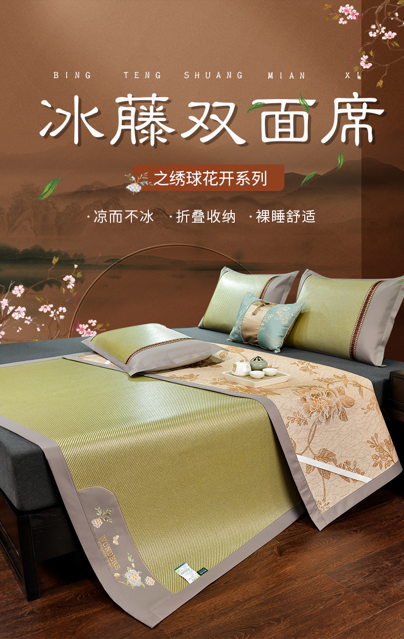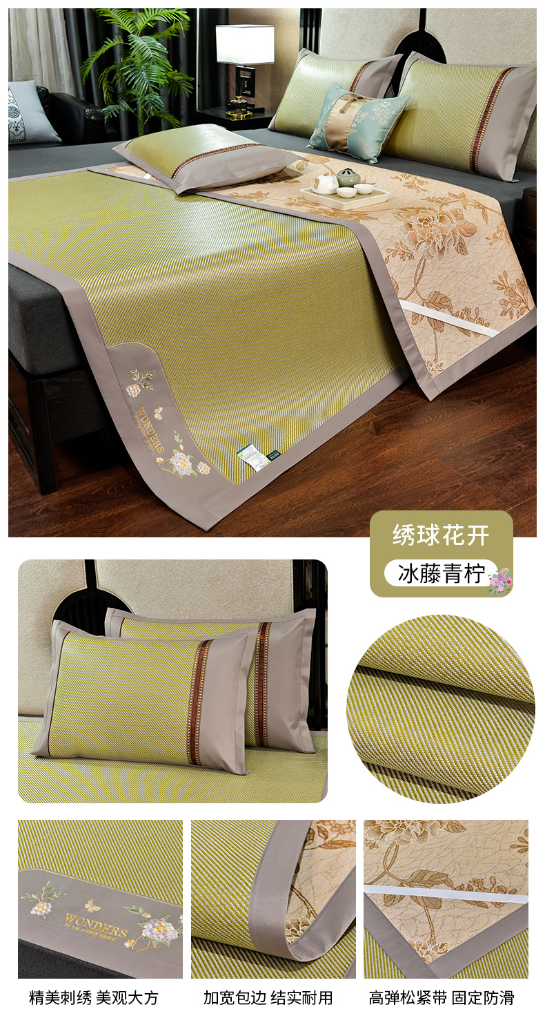 商品名称:小牛席业 2026新款绣球花开-冰藤双面席凉席藤席冰藤席竹席空调席草席冰丝席豆豆席乳胶席三件套 绣球花开-冰藤青柠