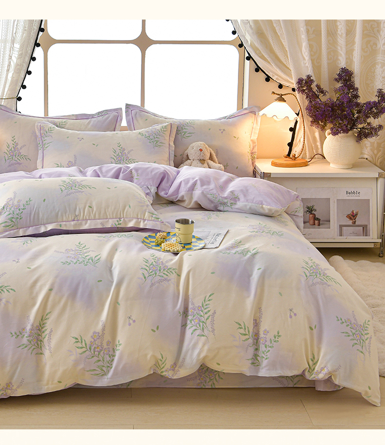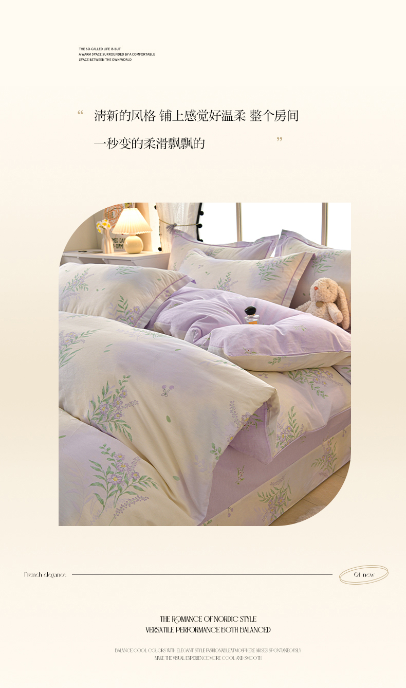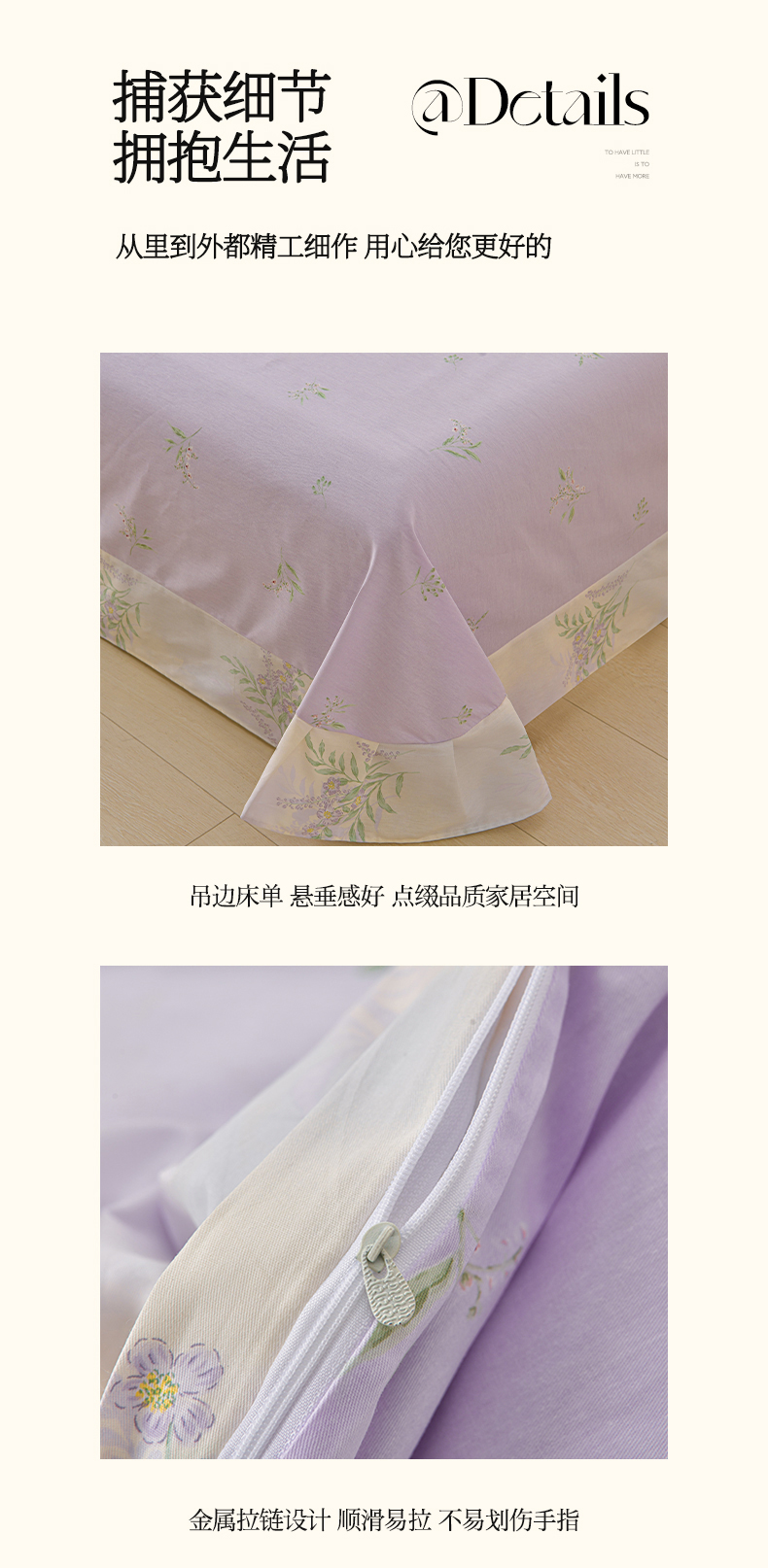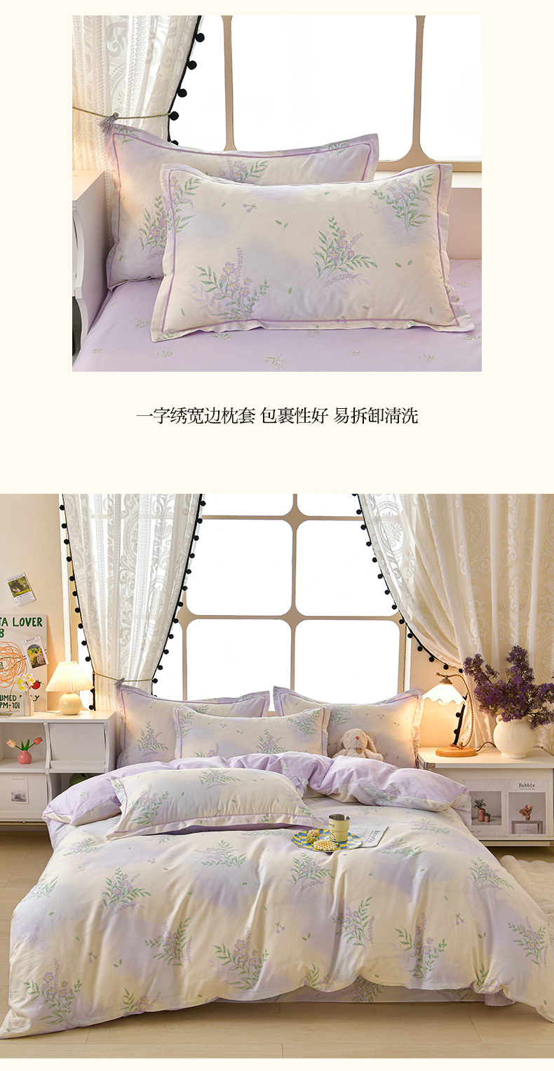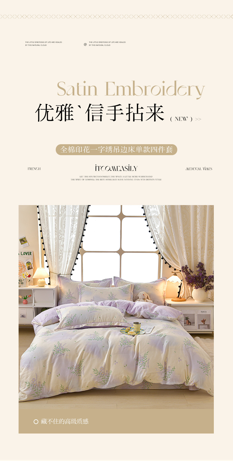 商品名称:绘萱家居 2026直播爆款一字绣吊边款纯棉100%全棉四件套印花百分百(喷气高品质) 紫藤花