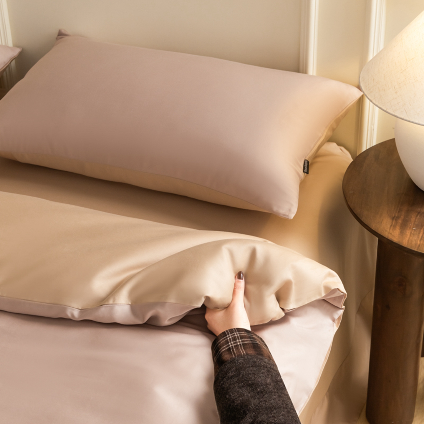 商品名称:秀色家纺 2026新款高端100pro新疆长绒棉床上四件套全棉纯棉四季纯色双拼高级感礼品团购四件套-米朵 米朵-奶昔白+亚麻咖