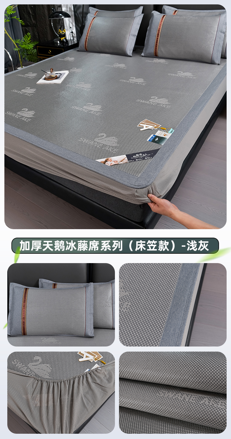 当前位置: 91家纺网 > 商品网购 > 床上用品 > 凉席 > 其他凉席 > 小牛席业 2026新款加厚款-天鹅冰藤席系列(床笠款) 天鹅冰藤席系列(床笠款)-浅灰