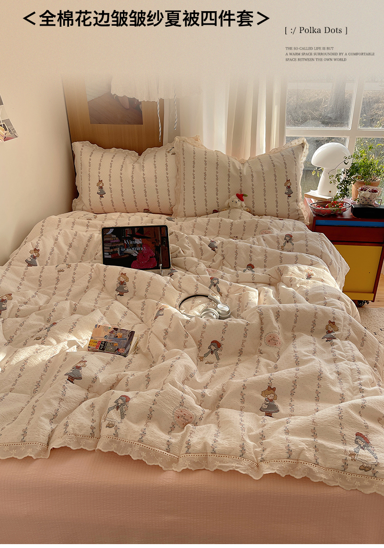 商品名称:梵克保罗 2026春夏新款全棉纯棉花边皱皱纱单夏被夏凉被空调被夏被四件套 花样KT