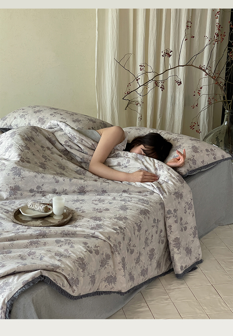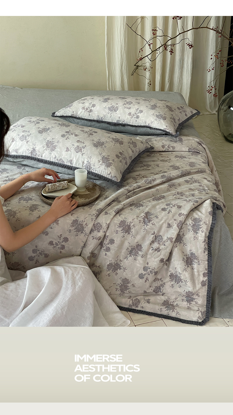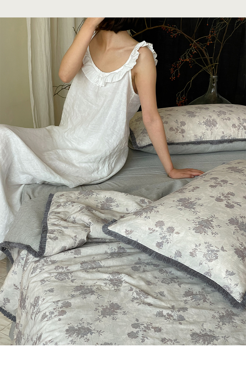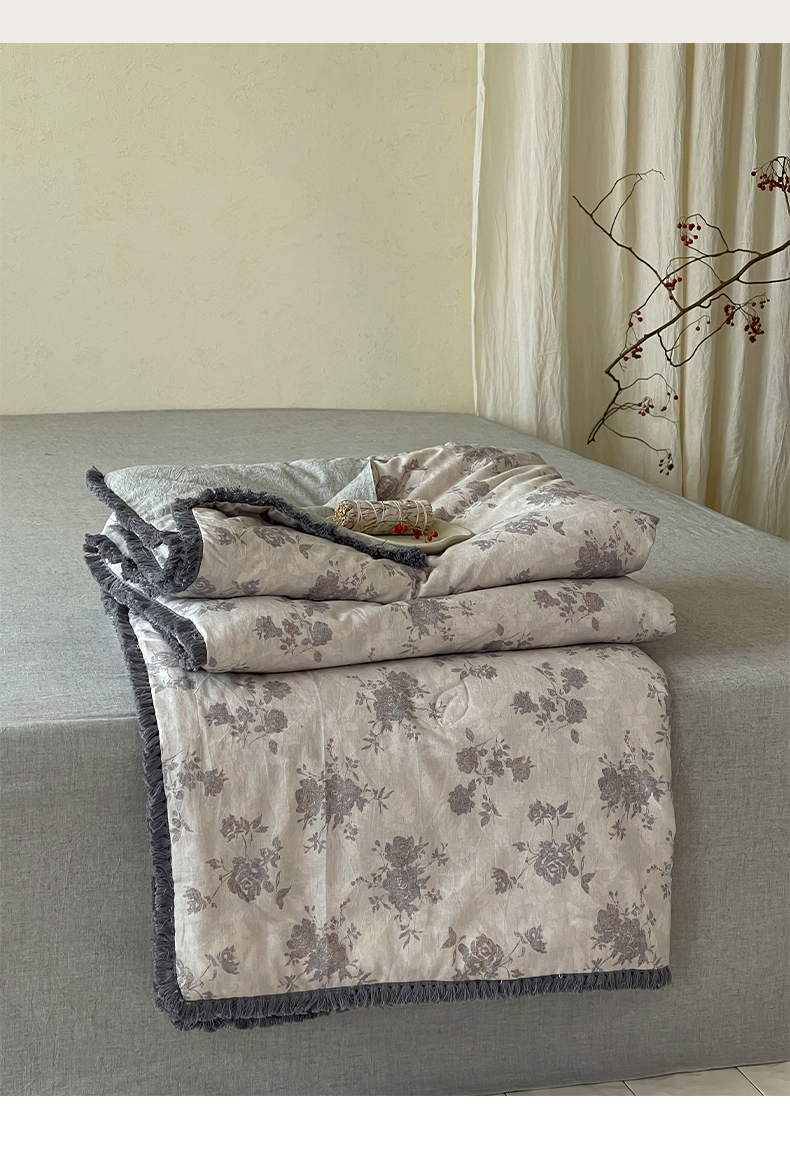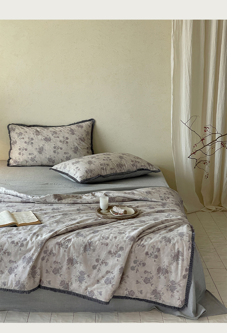 • 91家纺网 家纺一手货源 找家纺 一加一 2026新款A类棉麻透气提花花边凉感夏被夏凉被空调被四件套棉麻叙 时雨-灰