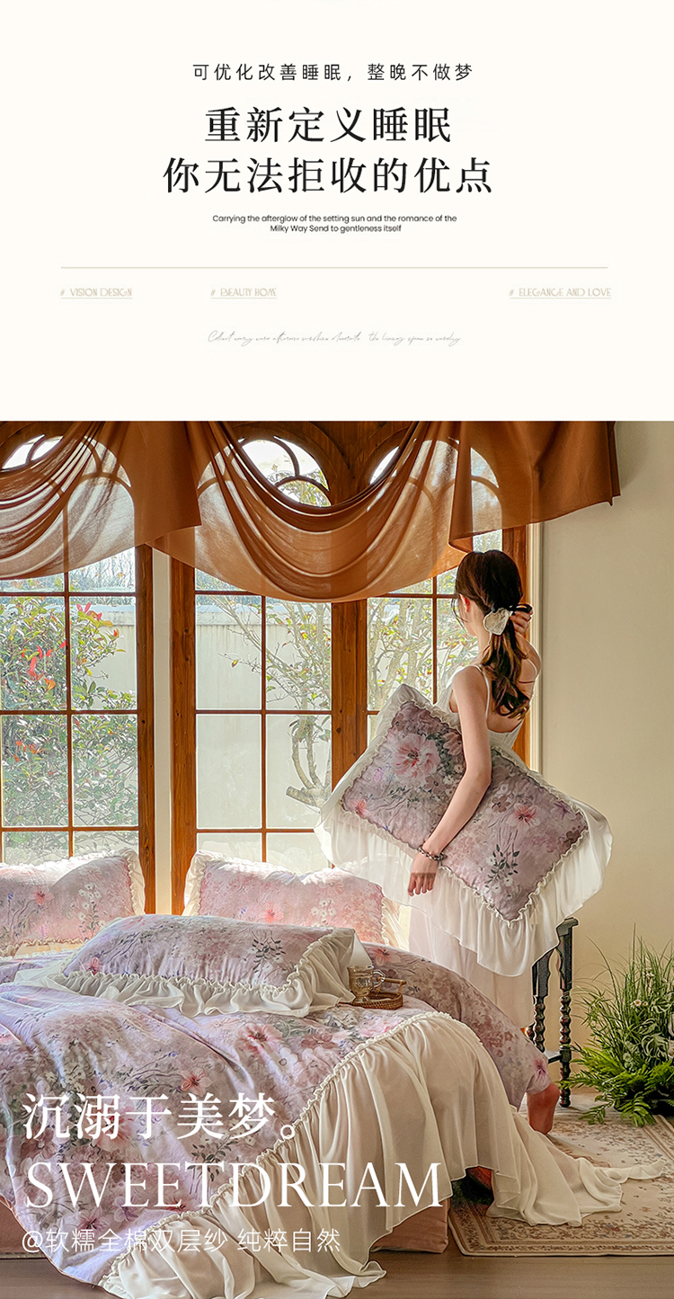 当前位置: 91家纺网 > 商品网购 > 床品套件 > 四件套 > 全棉普通四件套 > 疆东 2026高端韩版法式公主复古油画风纯棉双层纱四件套赫本浪漫荷叶花边仙女全棉双层纱四件套床上用品被套 香榭丽舍