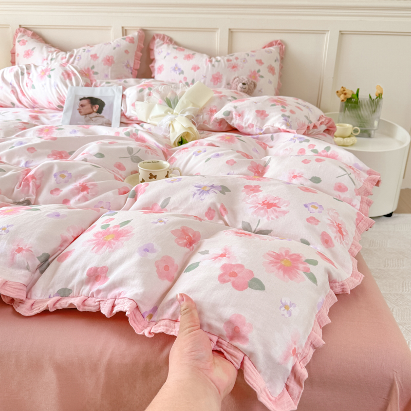 当前位置: 91家纺网 > 商品网购 > 床品套件 > 四件套 > 全棉普通四件套 > 疆东 【疆东】2026韩版蕾丝花边纯棉全棉双层纱四件套印花纯棉四件套法式赫本木耳花边全棉公主双层纱四件套 暗香