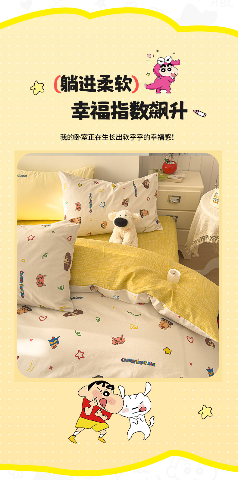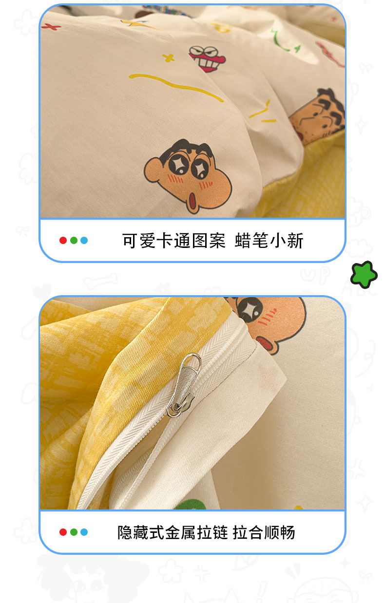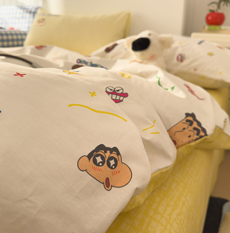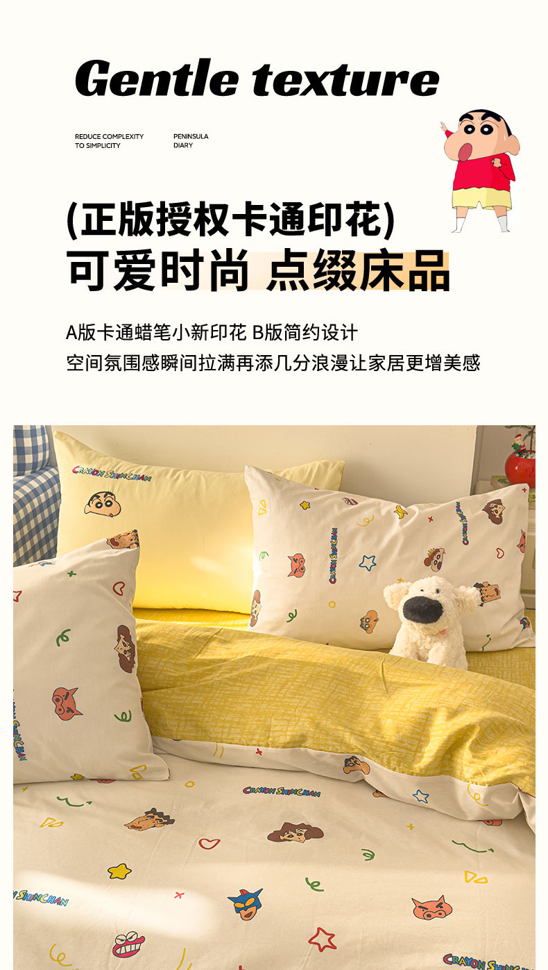 当前位置: 91家纺网 > 商品网购 > 床品套件 > 四件套 > 其它四件套 > 桃子家居 2026新款A类蜡笔小新正版授权刺绣混搭枕套卡通印花系列四件套 棉蜡笔小新-幸福小新