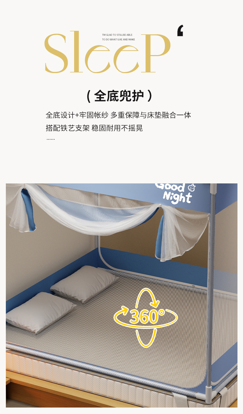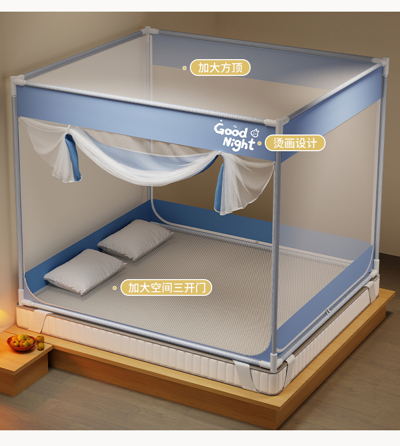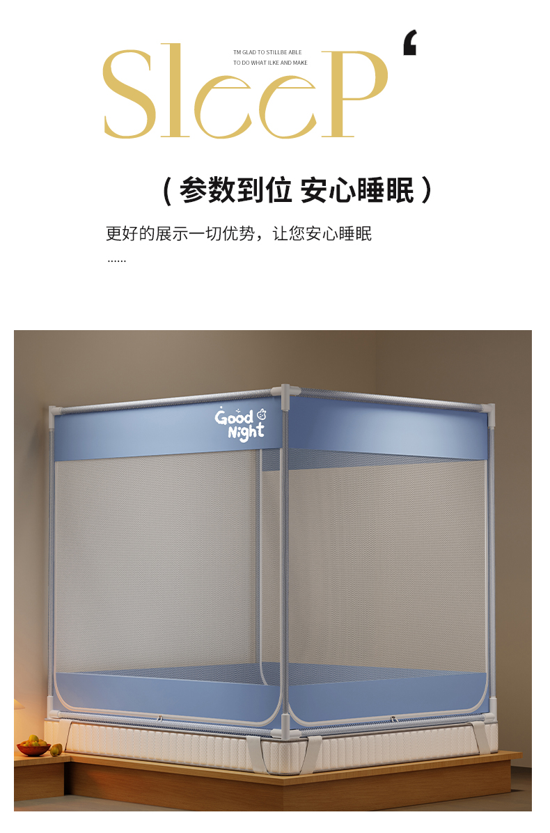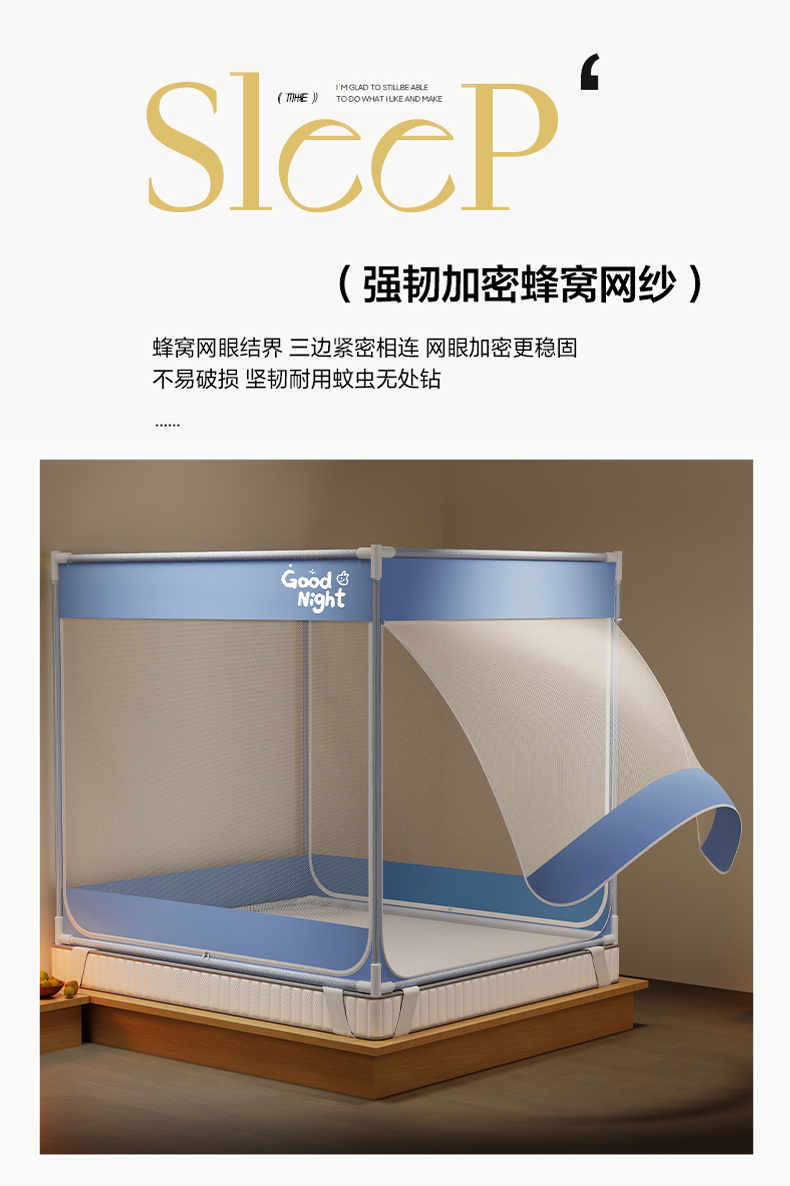 当前位置: 91家纺网 > 商品网购 > 床上用品 > 蚊帐 > 壹和 2026新款坐床蚊帐外穿杆全底-有收纳袋-防摔蚊帐-自连接烤漆支架 蓝-字母