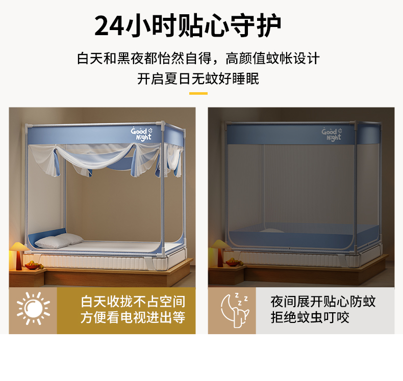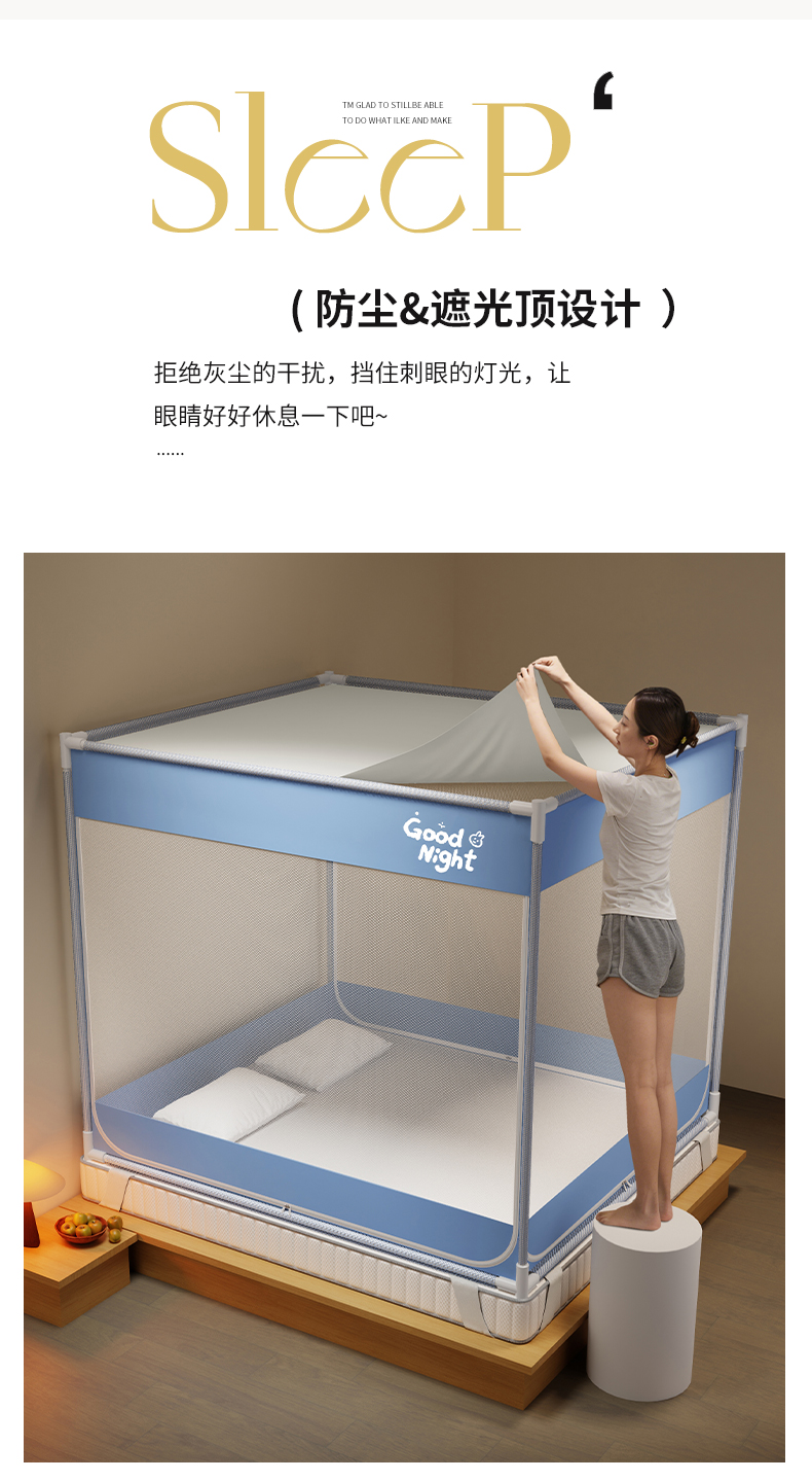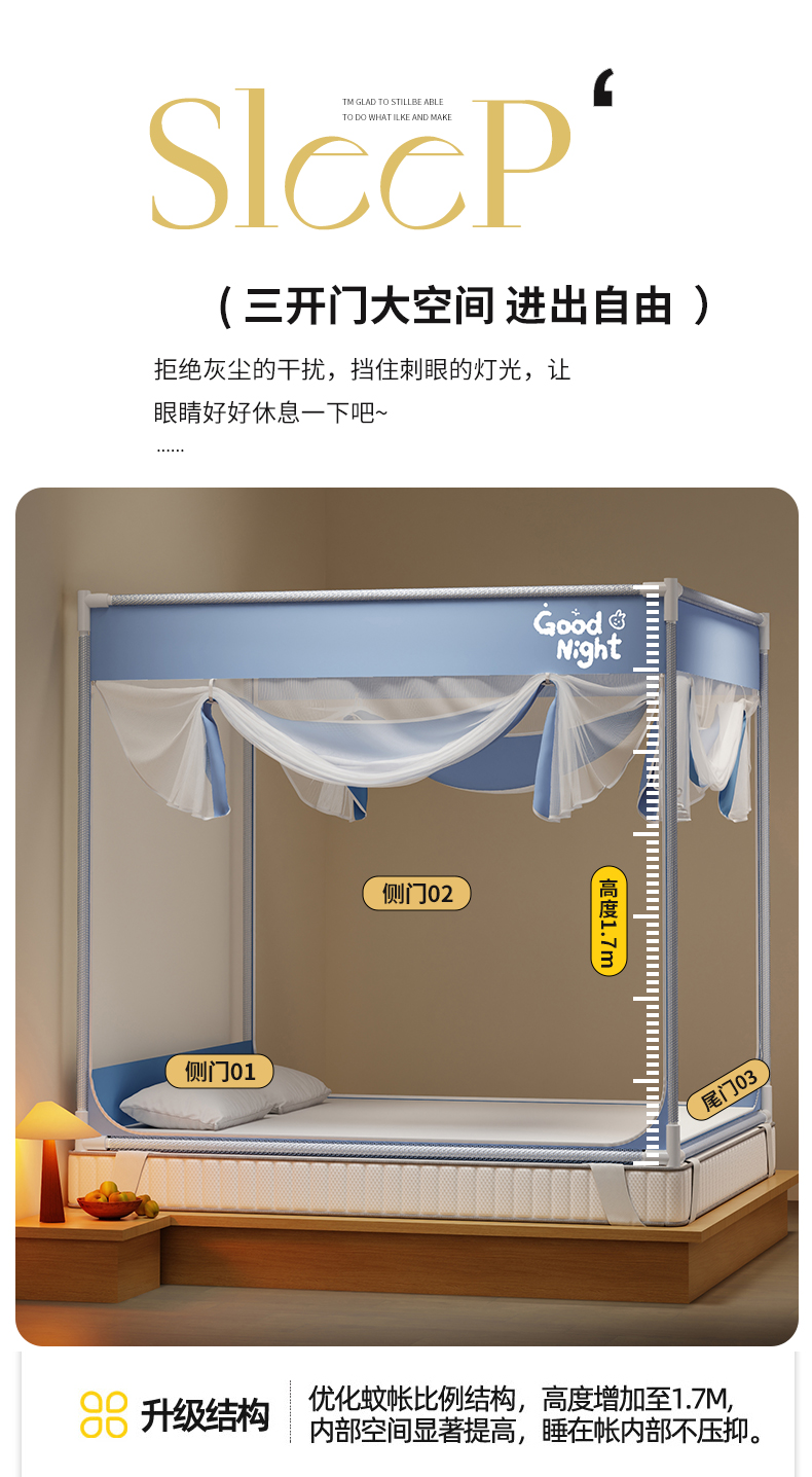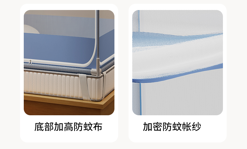 当前位置: 91家纺网 > 商品网购 > 床上用品 > 蚊帐 > 壹和 2026新款坐床蚊帐外穿杆全底-有收纳袋-防摔蚊帐-自连接烤漆支架 蓝-字母