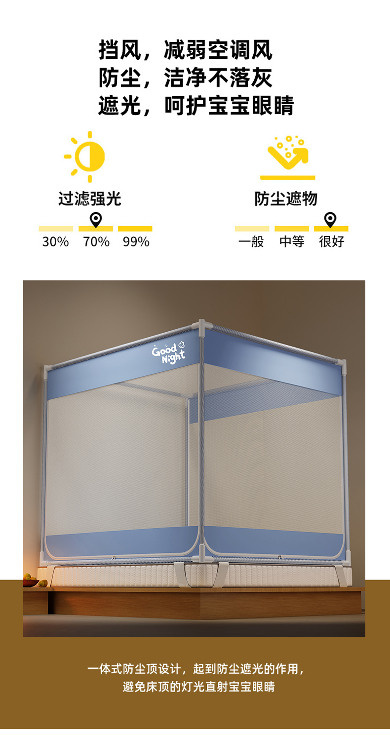 • 91家纺网 家纺一手货源 找家纺 (总)壹和 2026新款纯物理无涂层无覆膜款遮光防蚊学生坐床蚊帐(场景二),苍穹蓝,大象灰,靛蓝,靛蓝拼米,优雅米