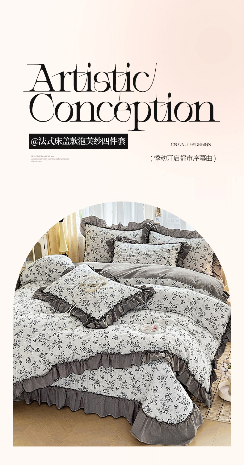 (总)妮恒美 2026新款法式床盖款泡芙纱四件套,爱意玫瑰,柔诗意,薇薇花语,蔷薇意语,木马格,幽幽花香,紫色豹纹,小樱桃,粉色回忆,兰亭序,浪漫花期,马上成功,萌萌凯蒂