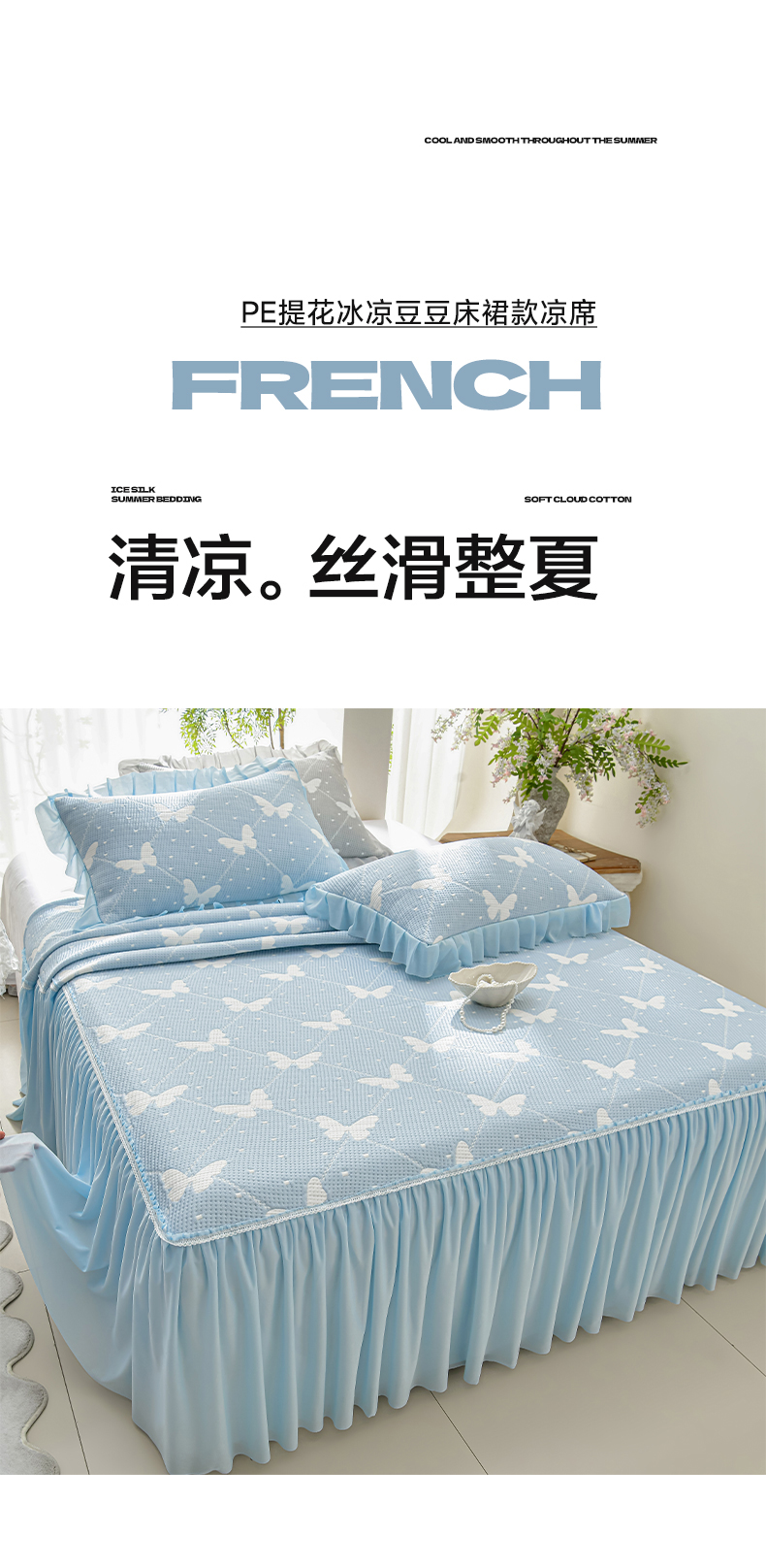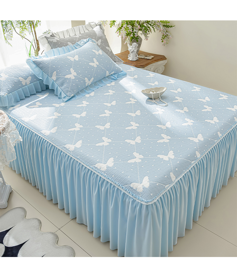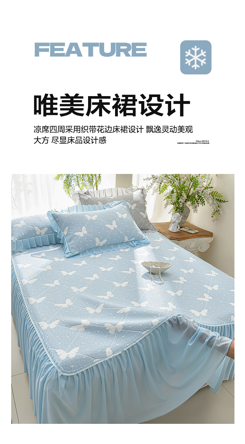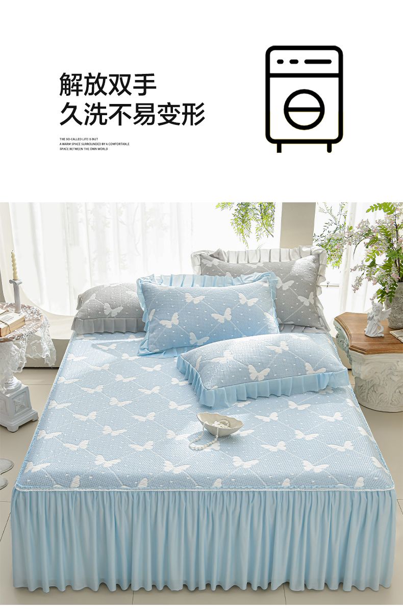 商品名称:绘萱家居 2026春夏新款530克PE100%提花冰凉豆豆床裙款凉席席子空调软席 蝶儿轻舞-蓝