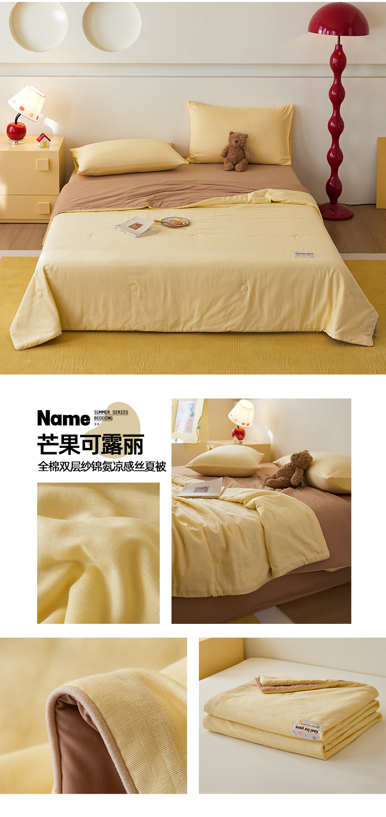 (总)莱宁被业 2026新款冰纱系列全棉双层纱锦氨凉感丝夏被,草莓冰纱,凤梨冰纱,海盐冰纱,蓝莓可露丽,芒果可露丽,蜜瓜可露丽,抹茶冰纱,拿铁冰纱,椰椰冰纱,芋泥冰纱,组合图