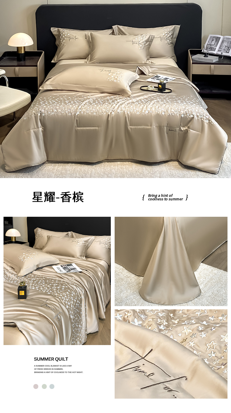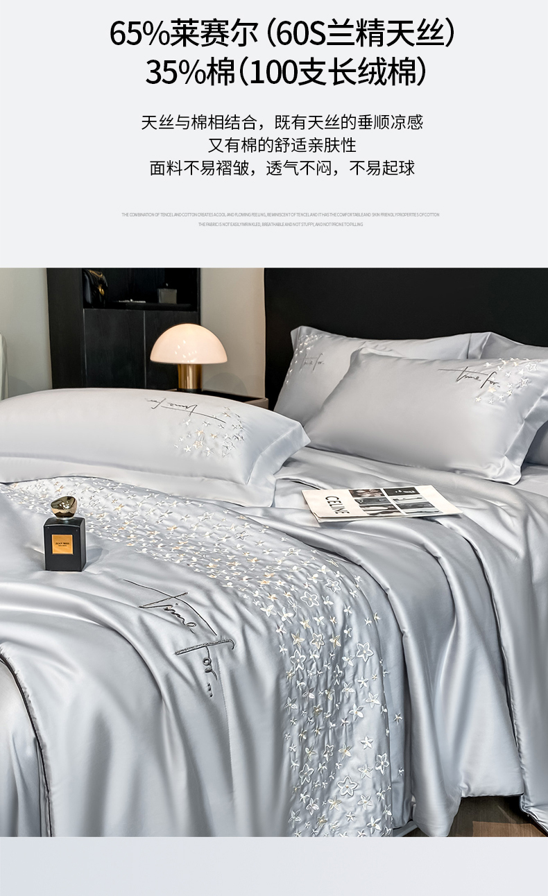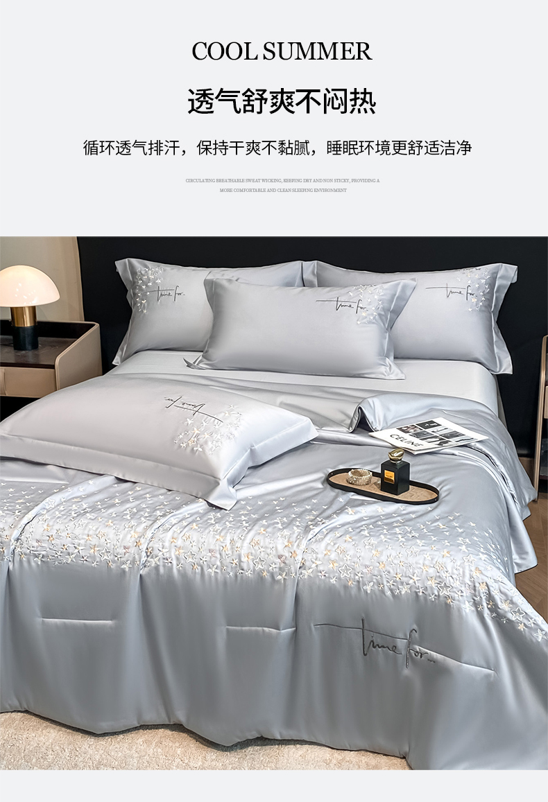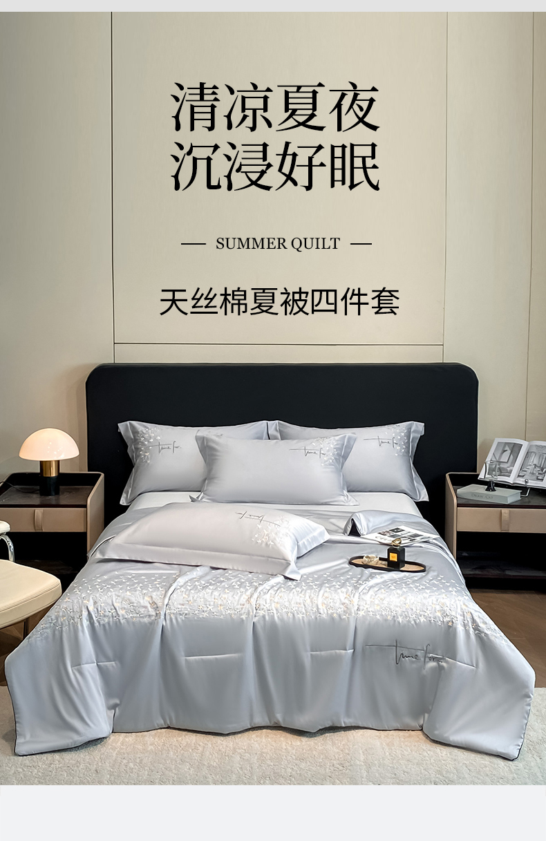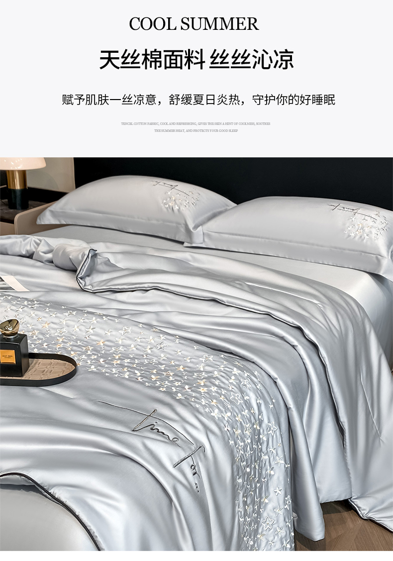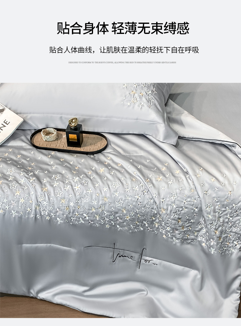 当前位置: 91家纺网 > 商品网购 > 床品套件 > 四件套 > 夏被四件套 > 新方向 2026新款刺绣A类20%蚕丝天丝棉夏被夏凉被空调被四件套-星耀 星耀-朦胧灰