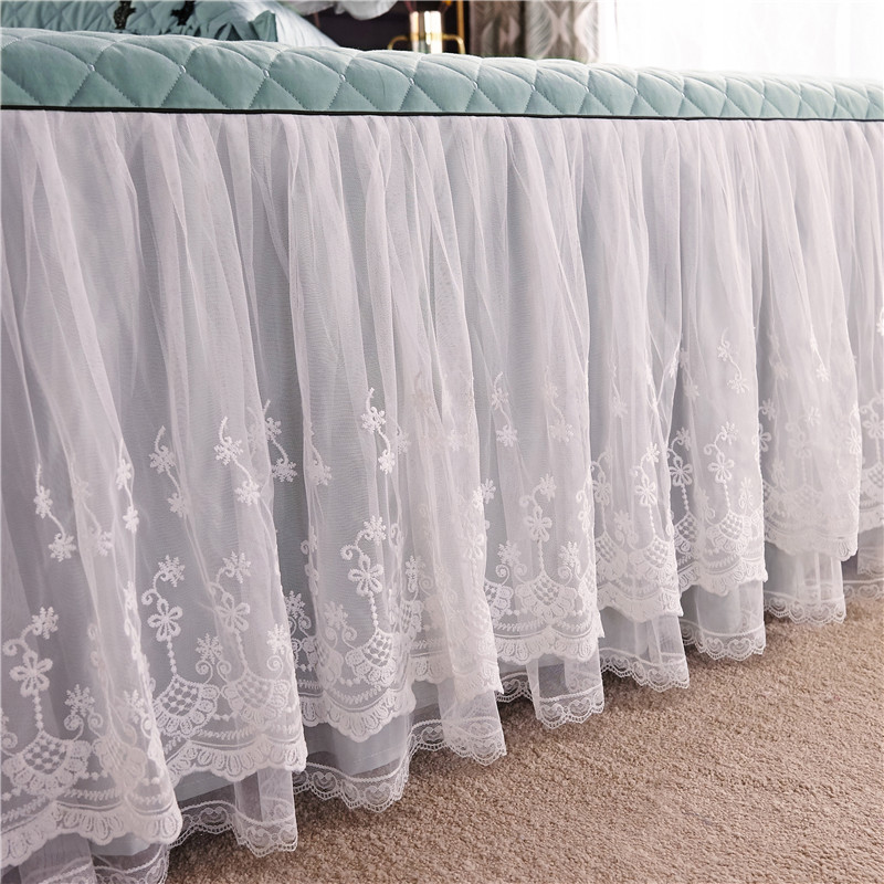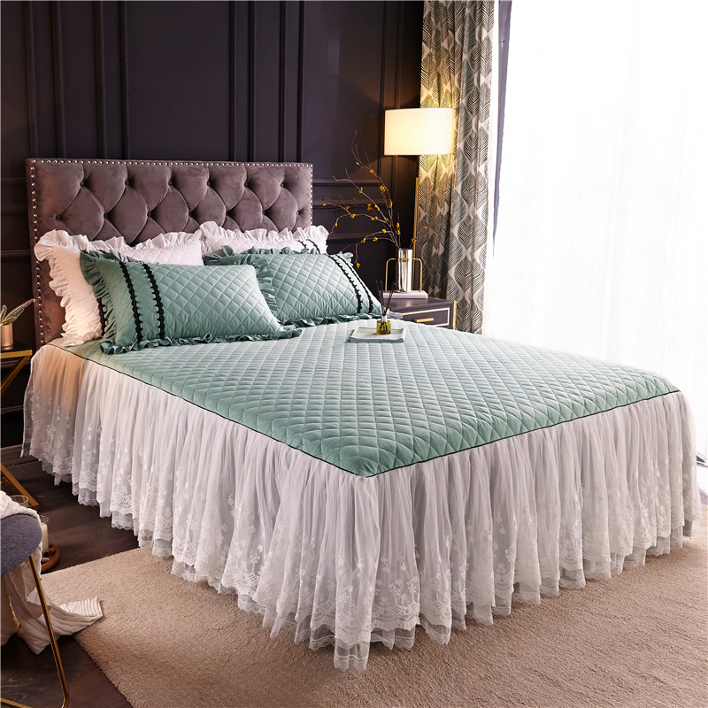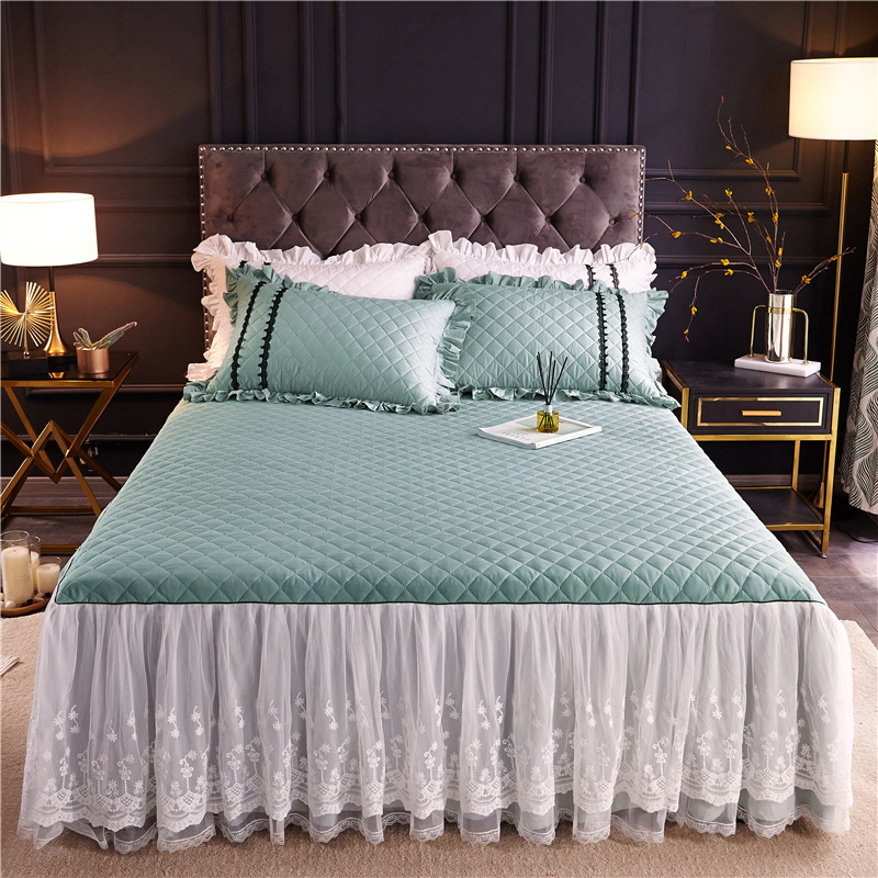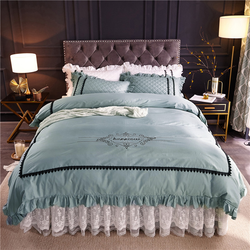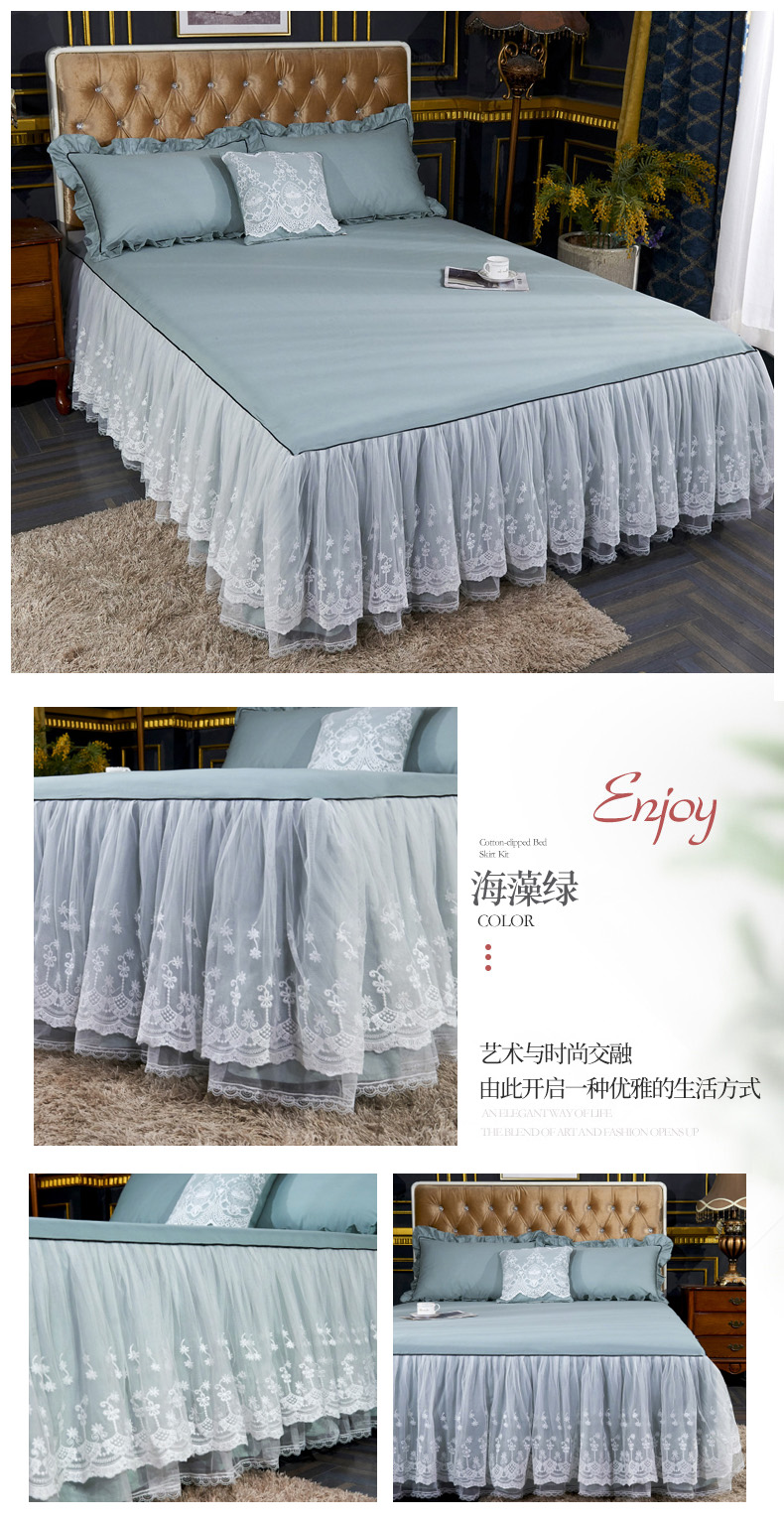 当前位置: 91家纺网 > 商品网购 > 床品套件 > 四件套 > 全棉普通四件套 > 2021菊上-全棉刺绣蕾丝床裙款四件套单层夹棉双款式海藻绿